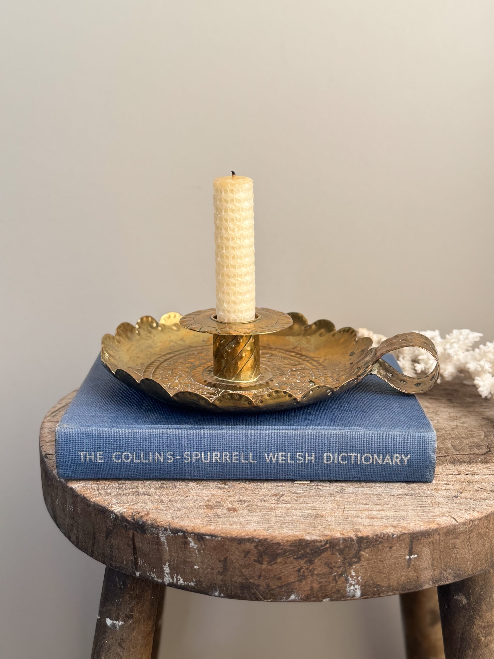 The brass has developed a rich, natural patina that enhances its charm, catching the light in a way only well-aged metal can. Perfect styled on a bedside table, writing desk, or coffee table especially with a beeswax candle for a soft golden glow.