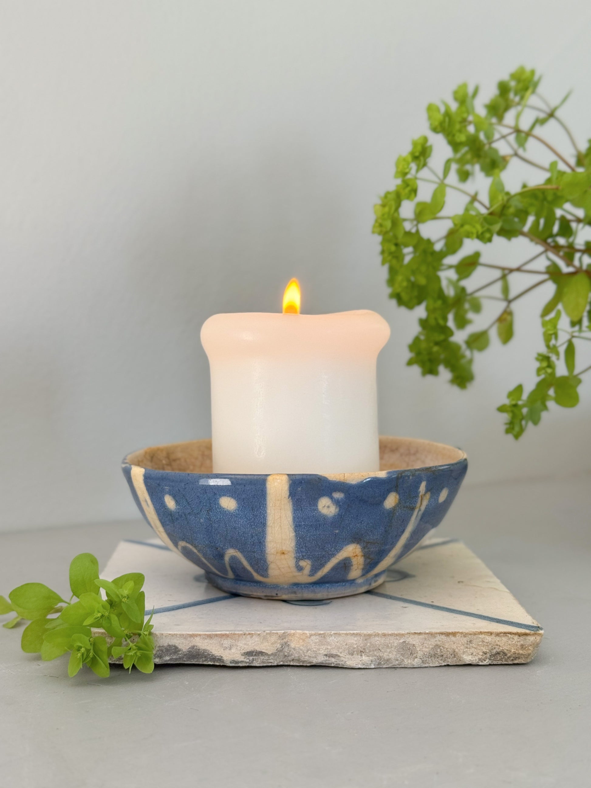 Likely made in an English studio in the early 20th century, it’s the kind of bowl that feels just right in a home that’s lived-in and loved. I’ve styled it here with a simple pillar candle, but it’s equally lovely for holding small treasures or used for salt by the stove, matches on a sideboard, or taking price of place on a coffee table.