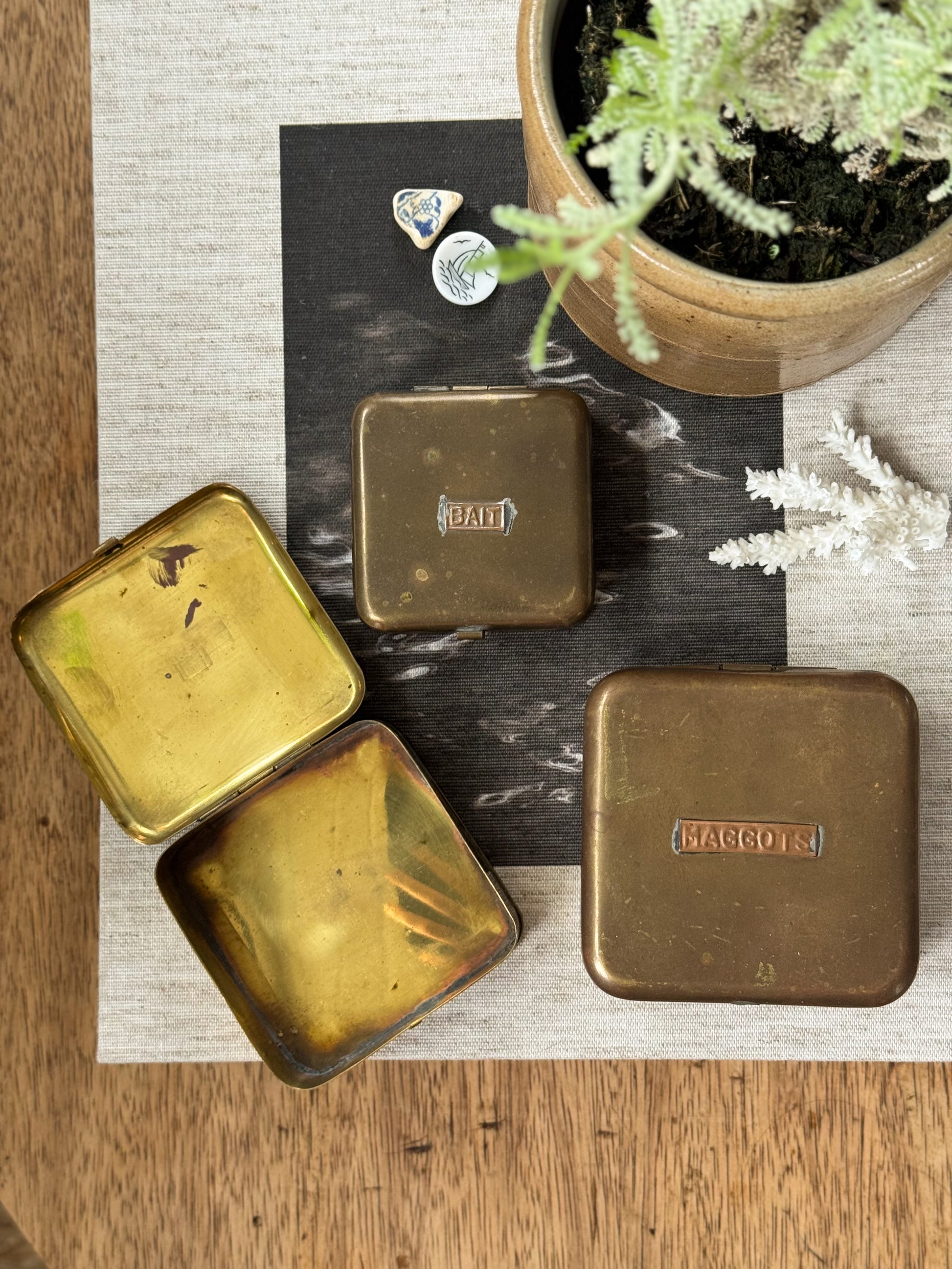 A rare and characterful set of three antique fishing bait tins, made from a beautiful mix of aged brass and copper. Each box is individually stamped - BAIT, WORMS, and MAGGOTS in raised copper lettering, worn smooth from years of use beside rivers and lakes.