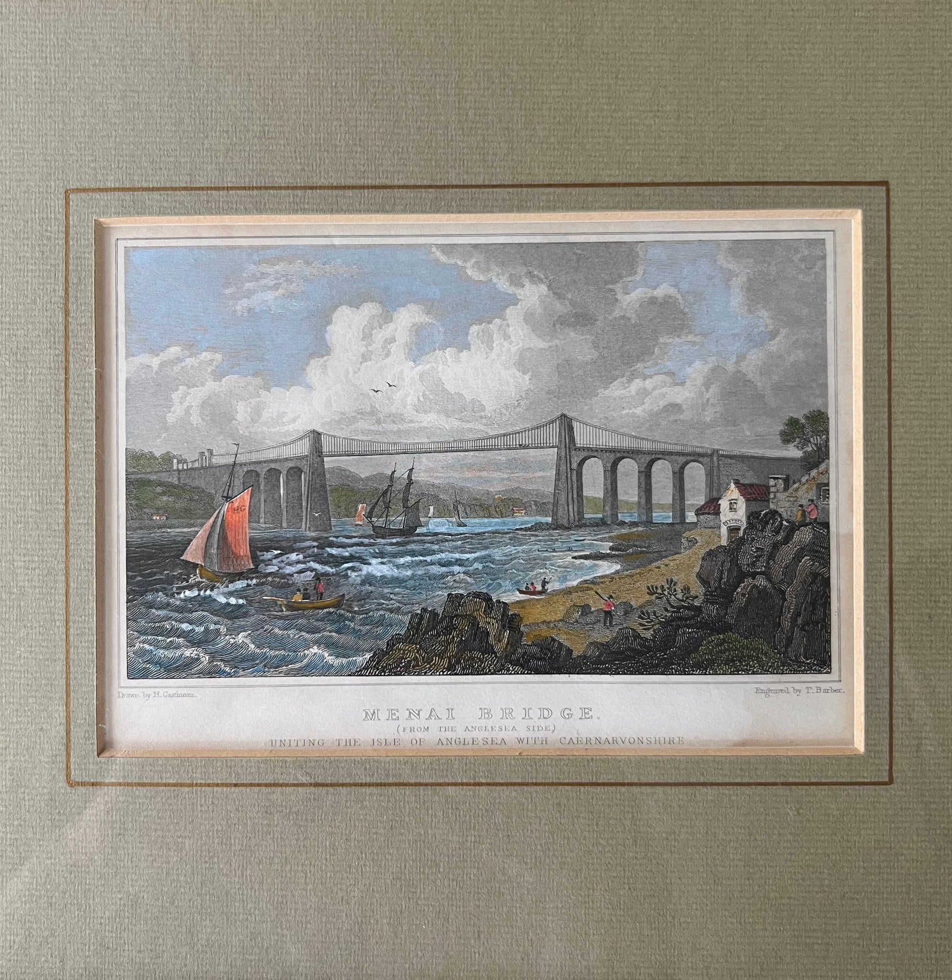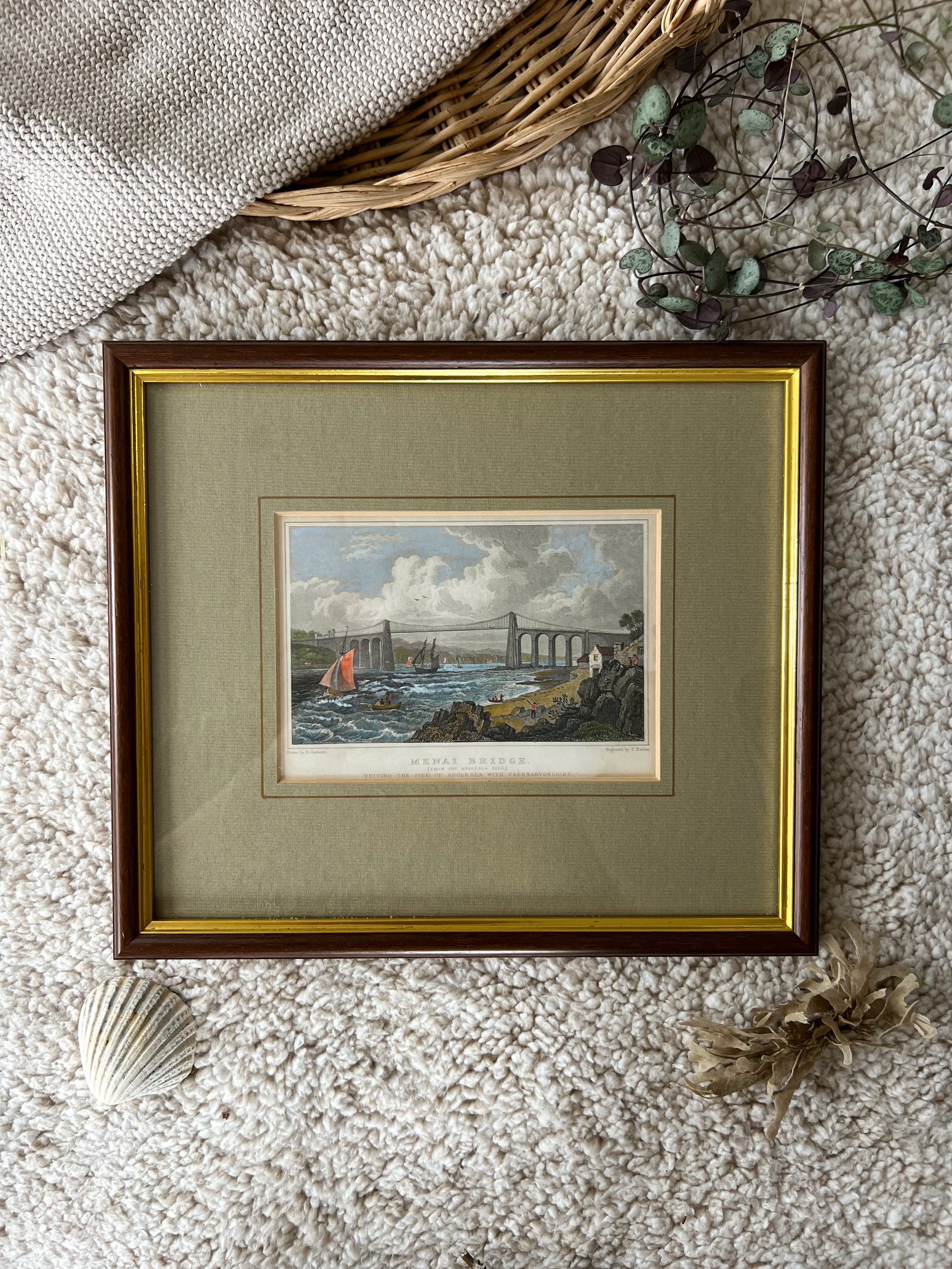 A beautiful antique colour engraving of Menai Bridge from the Anglesey side. Antique Framed Engraving of Menai Bridge Drawn by H.Gastineau and Engraved by T.Barber. Framed in a wooden frame with gold detail.