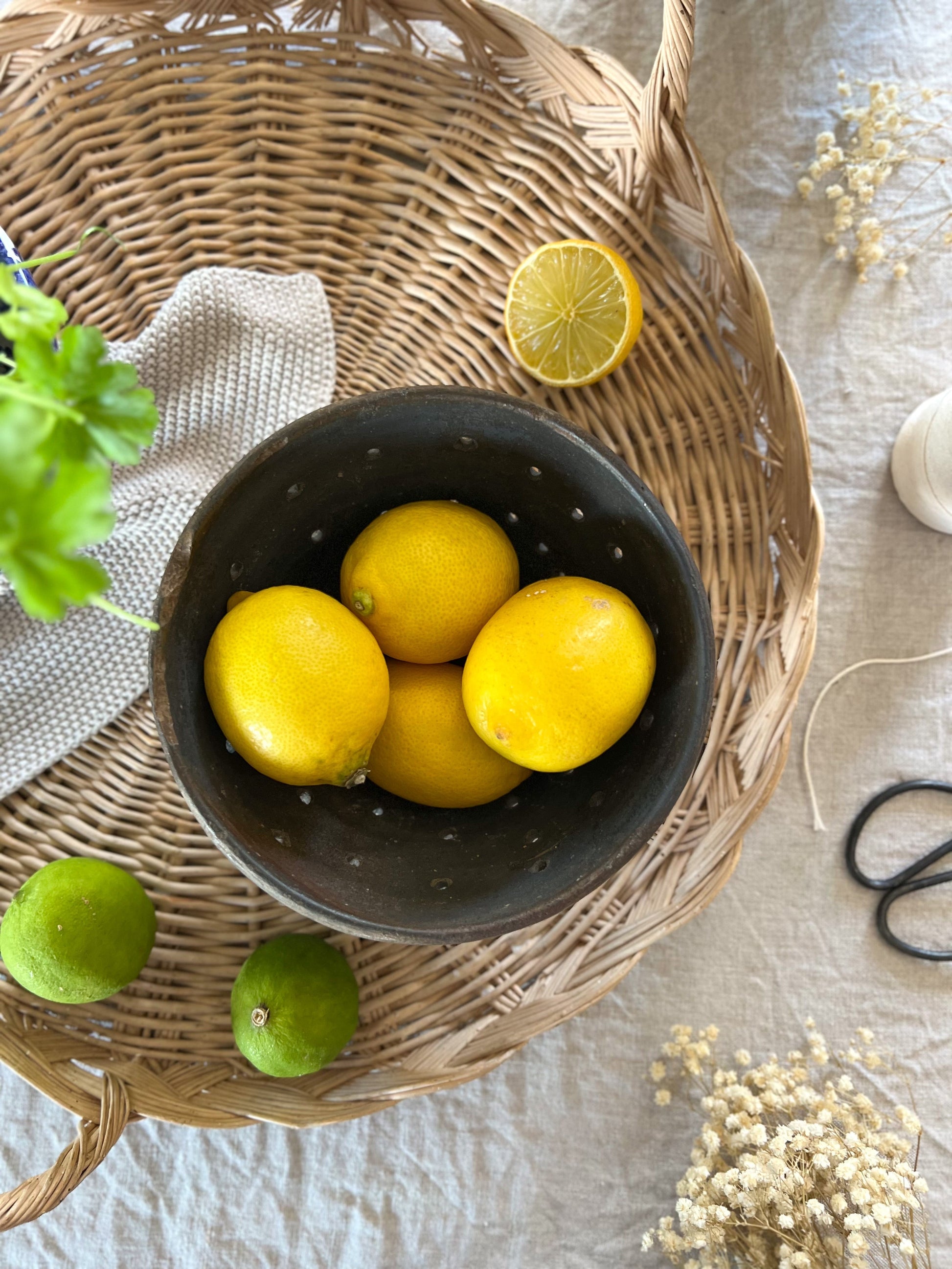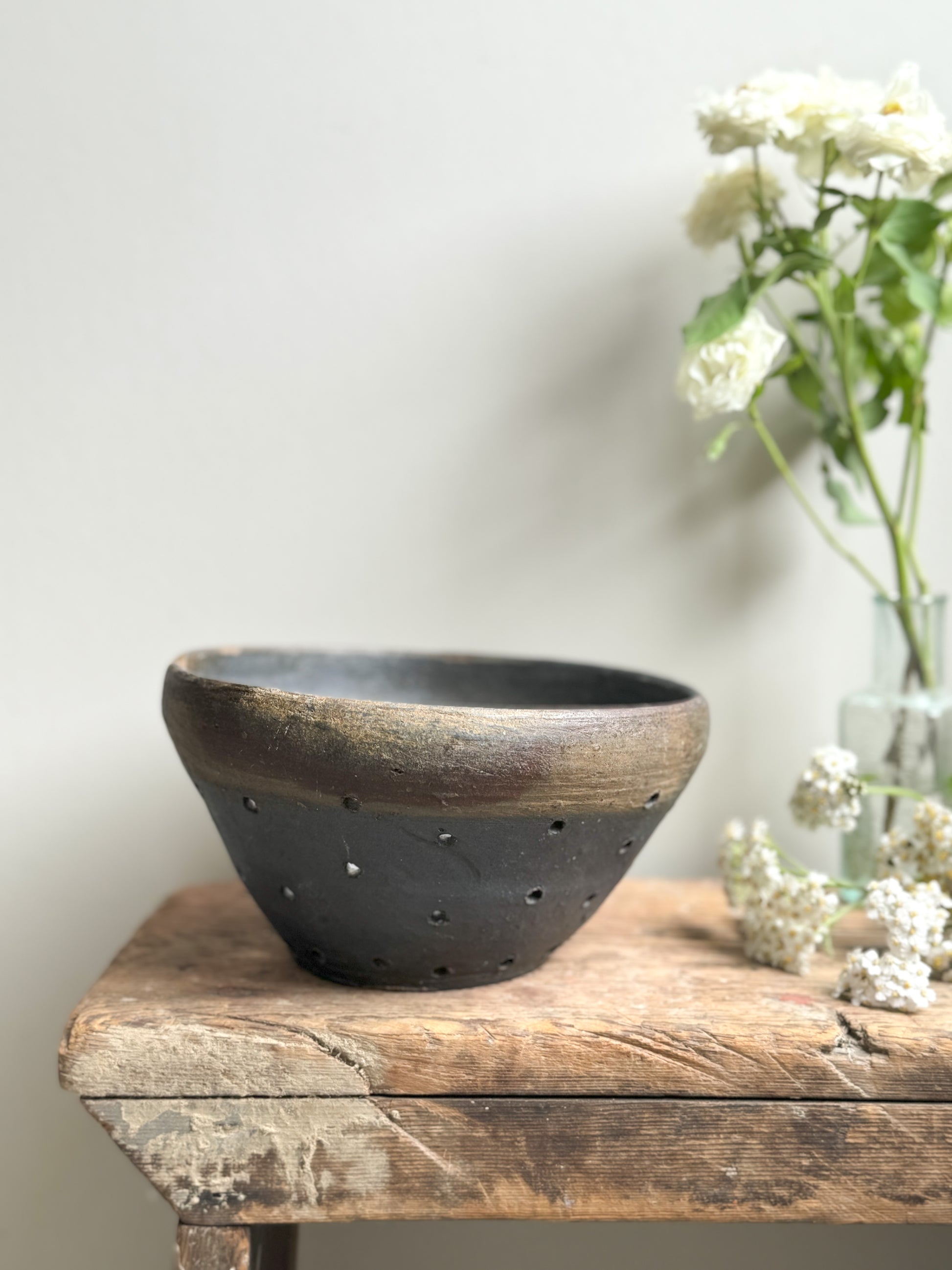 A beautiful earthenware French cheese strainer with an unusual black and brown glaze. Perfect to use as a colander.