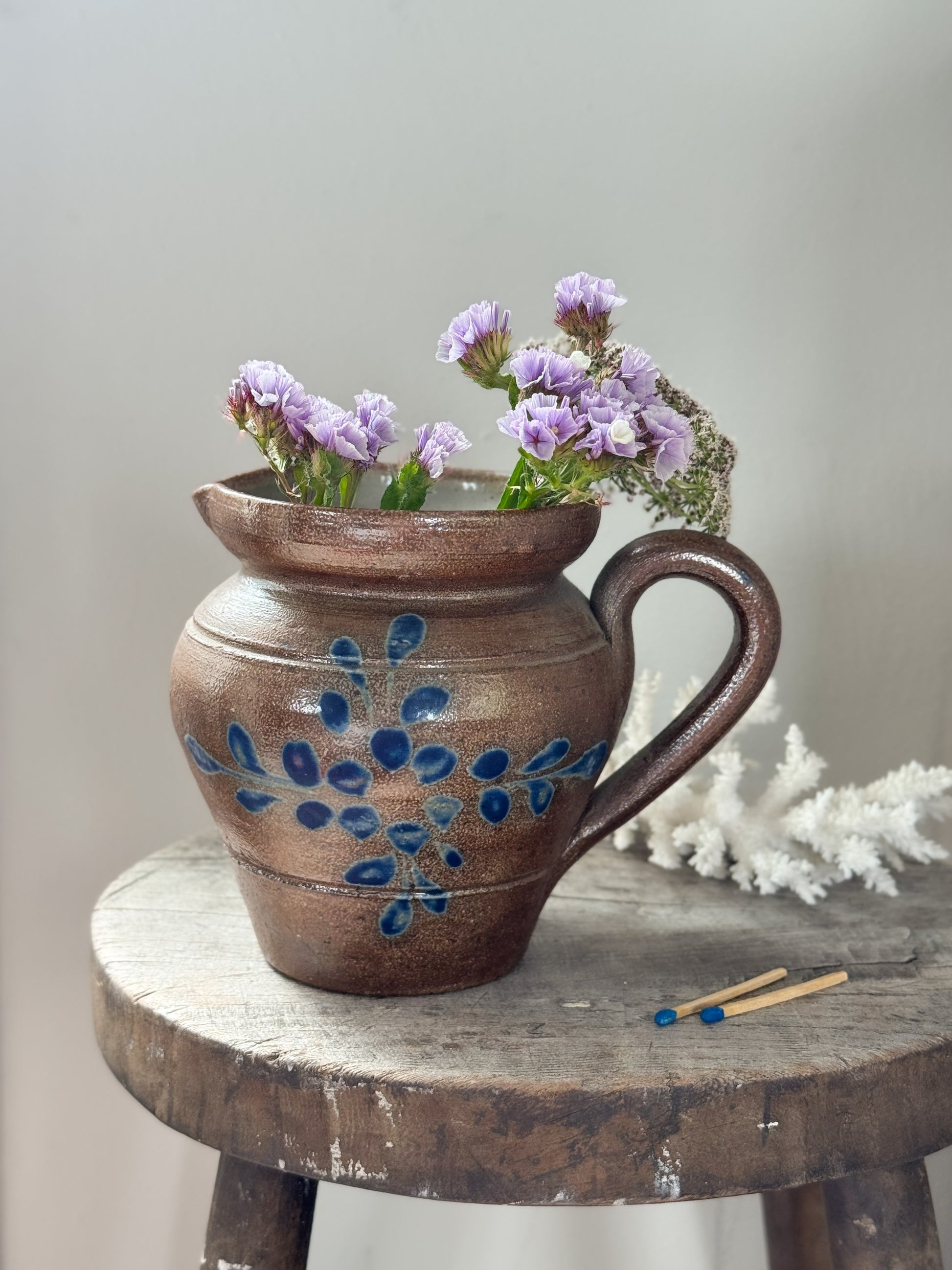 An exquisite example of French provincial pottery, this antique stoneware jug is a true statement piece. Its rich, earthy glaze is beautifully contrasted by a hand-painted cobalt blue floral motif, each petal and leaf applied with a painter’s precision. The generous, rounded form and sturdy handle speak to its utilitarian origins, while the elegant detailing elevates it into a work of art.