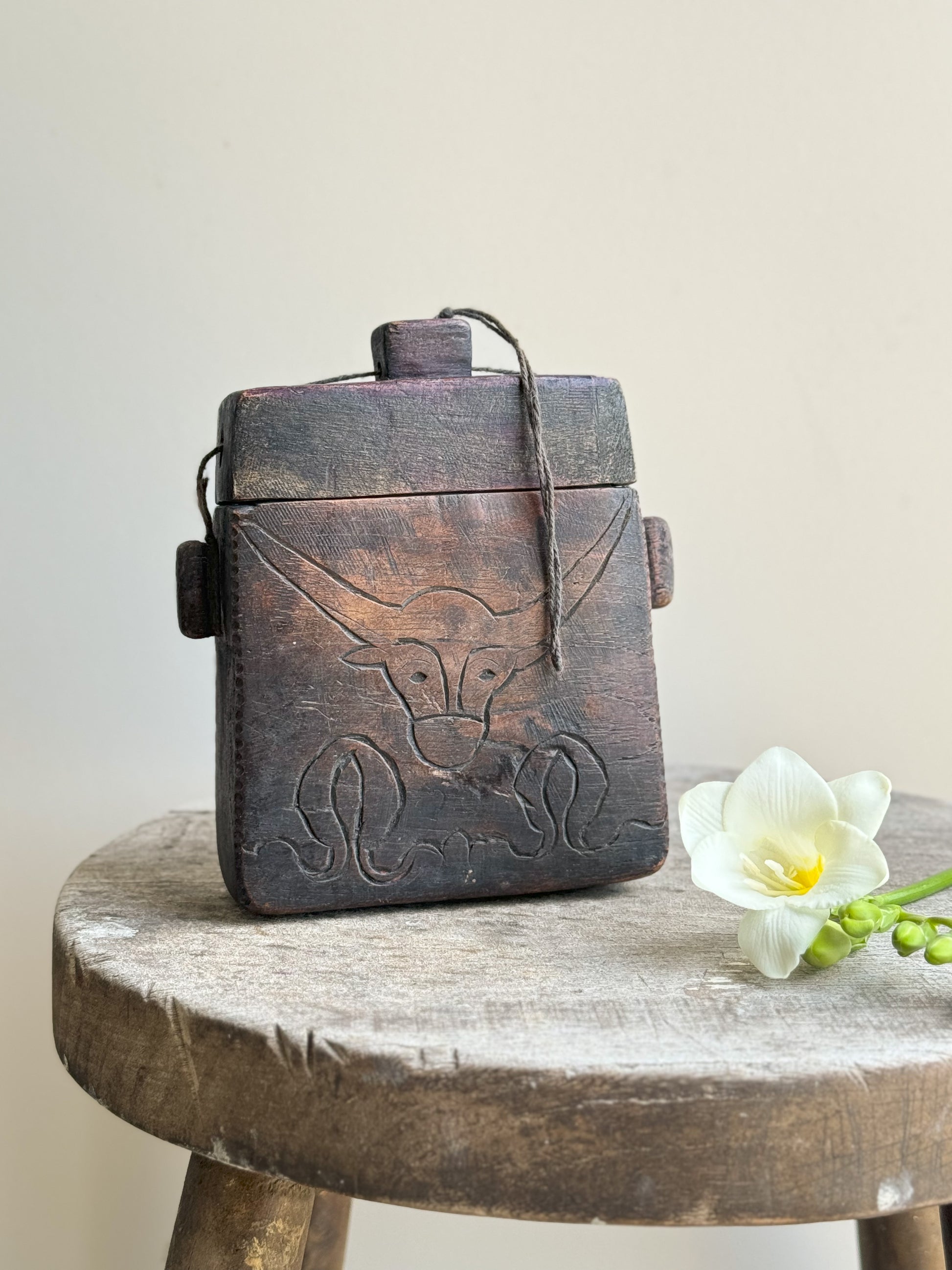 A beautiful hand-carved sandalwood tongal, a box originally originally used to carry items such as tobacco when travelling.