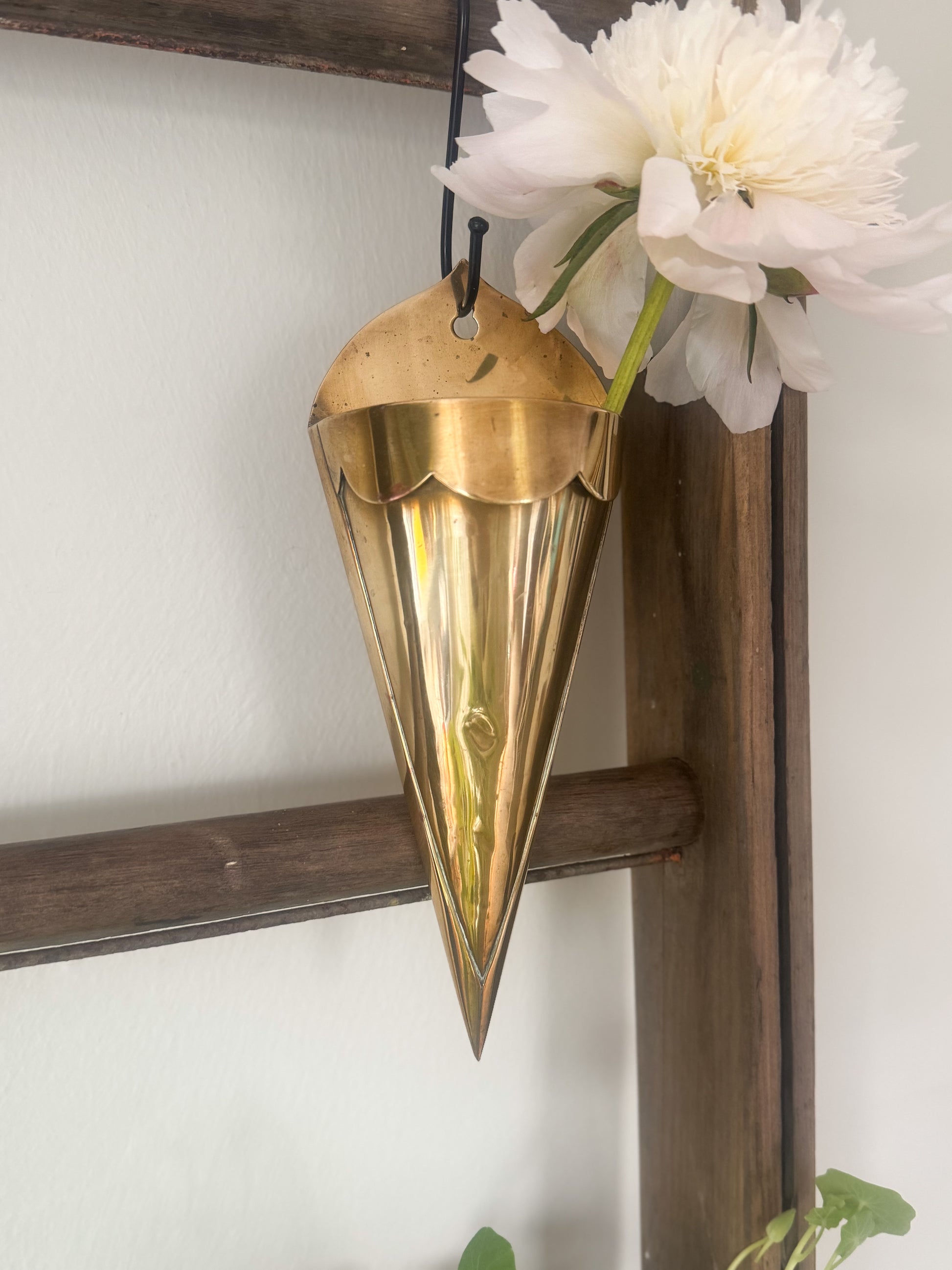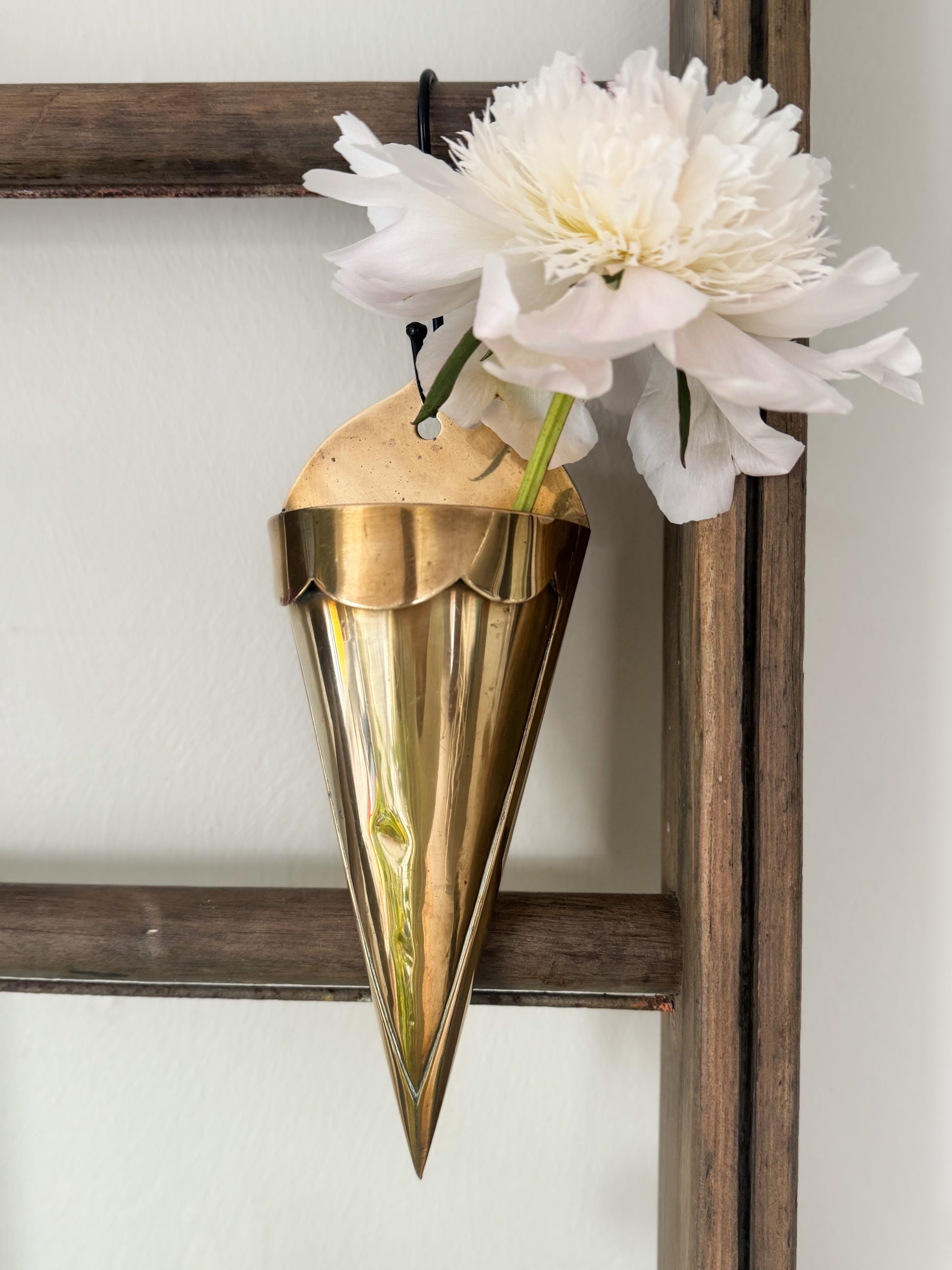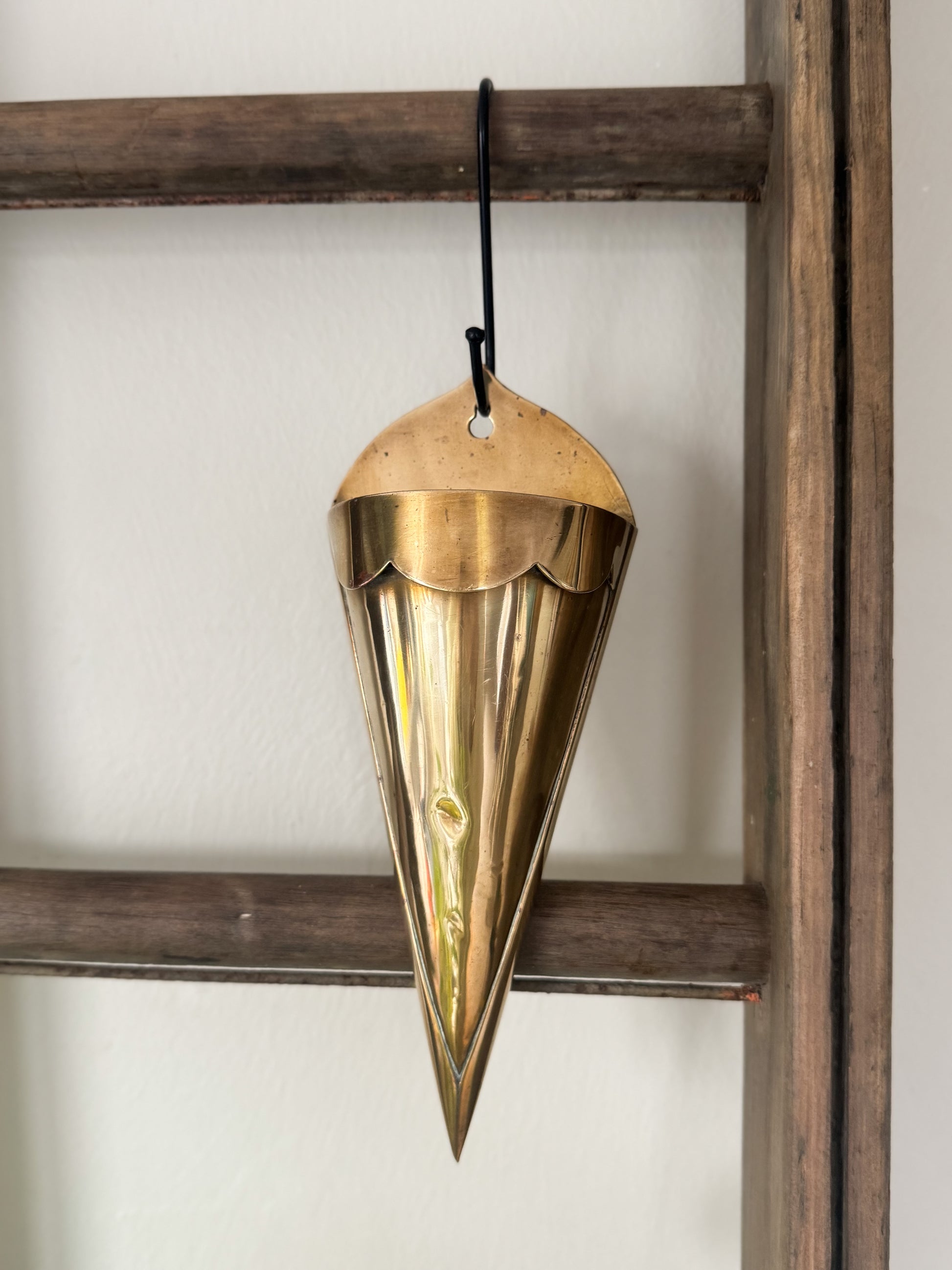A beautifully aged solid brass wall pocket with a wonderful scalloped edge and a gently tapered cone form, a charming piece that feels romantic. Handmade and full of character, it carries the marks of time with grace, from the gentle patina to its softly polished glow.