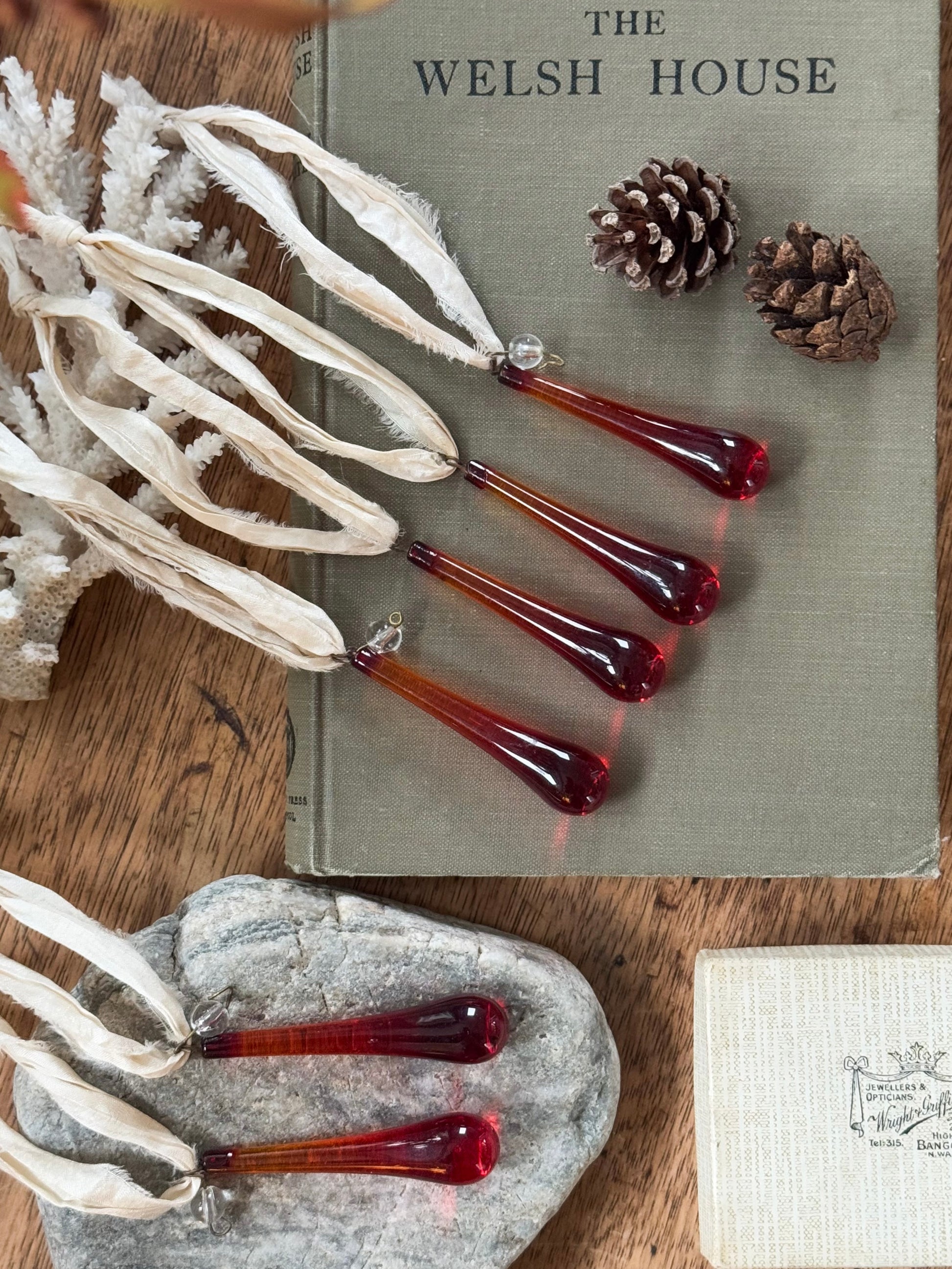 I found these beautiful antique glass droplets from an old chandelier and couldn’t leave them behind. They catch the light so perfectly, shifting from deep ruby to amber, that I felt they needed saving. Each one has been given a new lease of life with a length of naturally frayed, handmade ribbon, so they can be hung and admired once more.