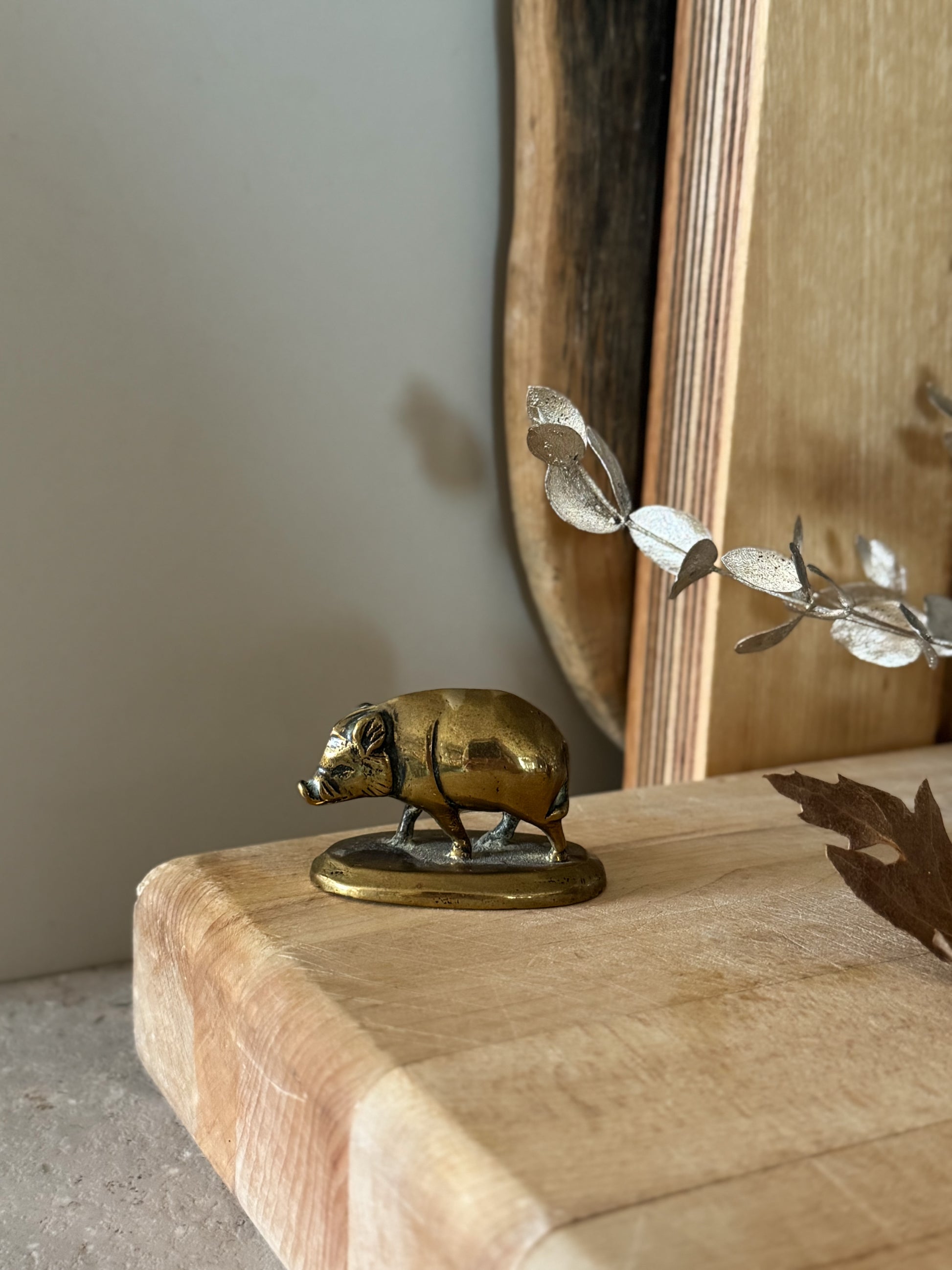 An antique solid brass boar, originally made as a games counter and beautifully preserved. Compact and weighty, the form is gently detailed, with a slightly naive quality that gives the piece its character.