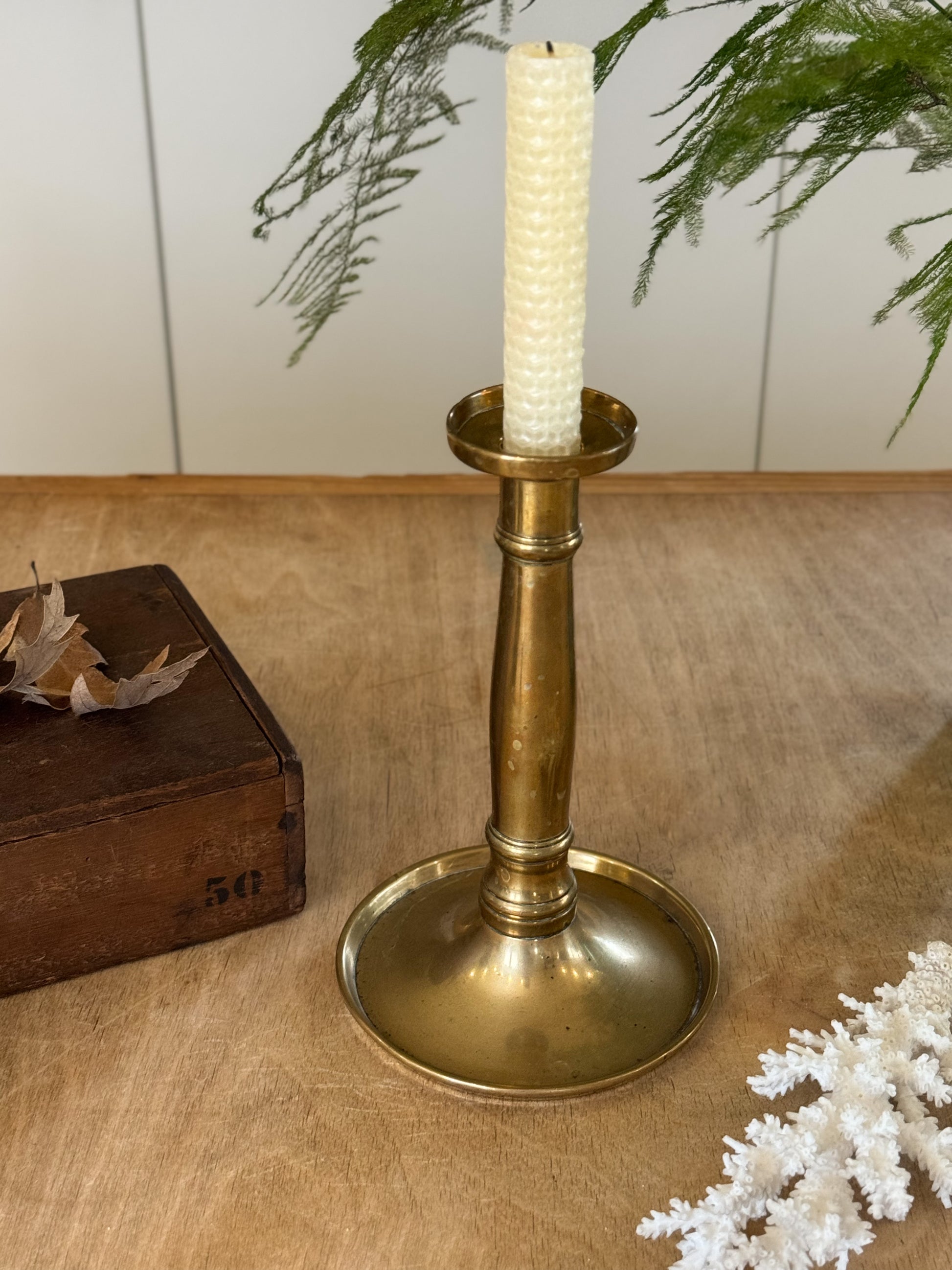 A stunning antique solid brass candlestick with an elegant, gently tapered stem and a wide drip tray base, a shape that feels both practical and beautifully unusual. The proportions are classic yet distinctive, with a lovely weight and warmth that only true antique brass carries.