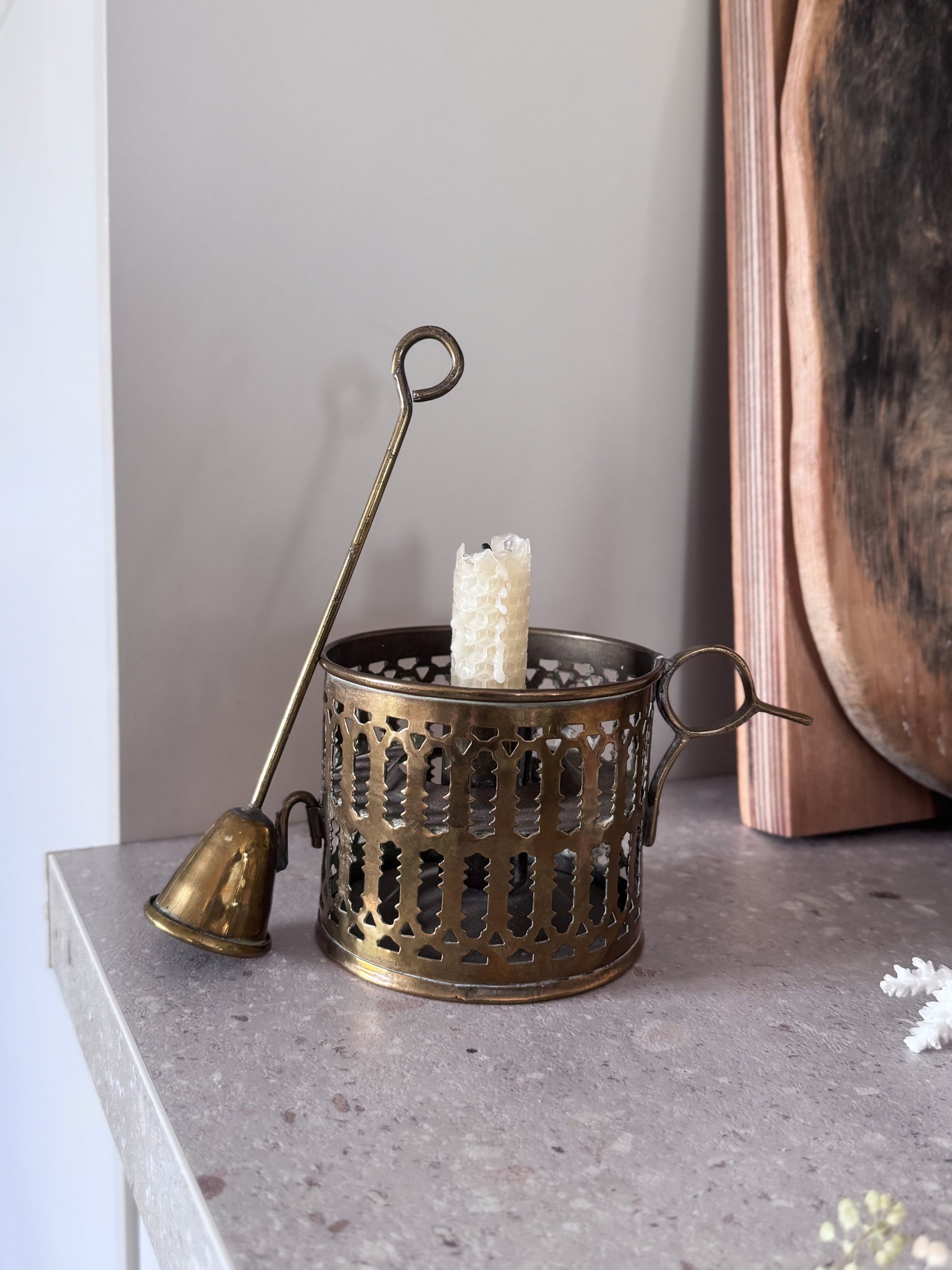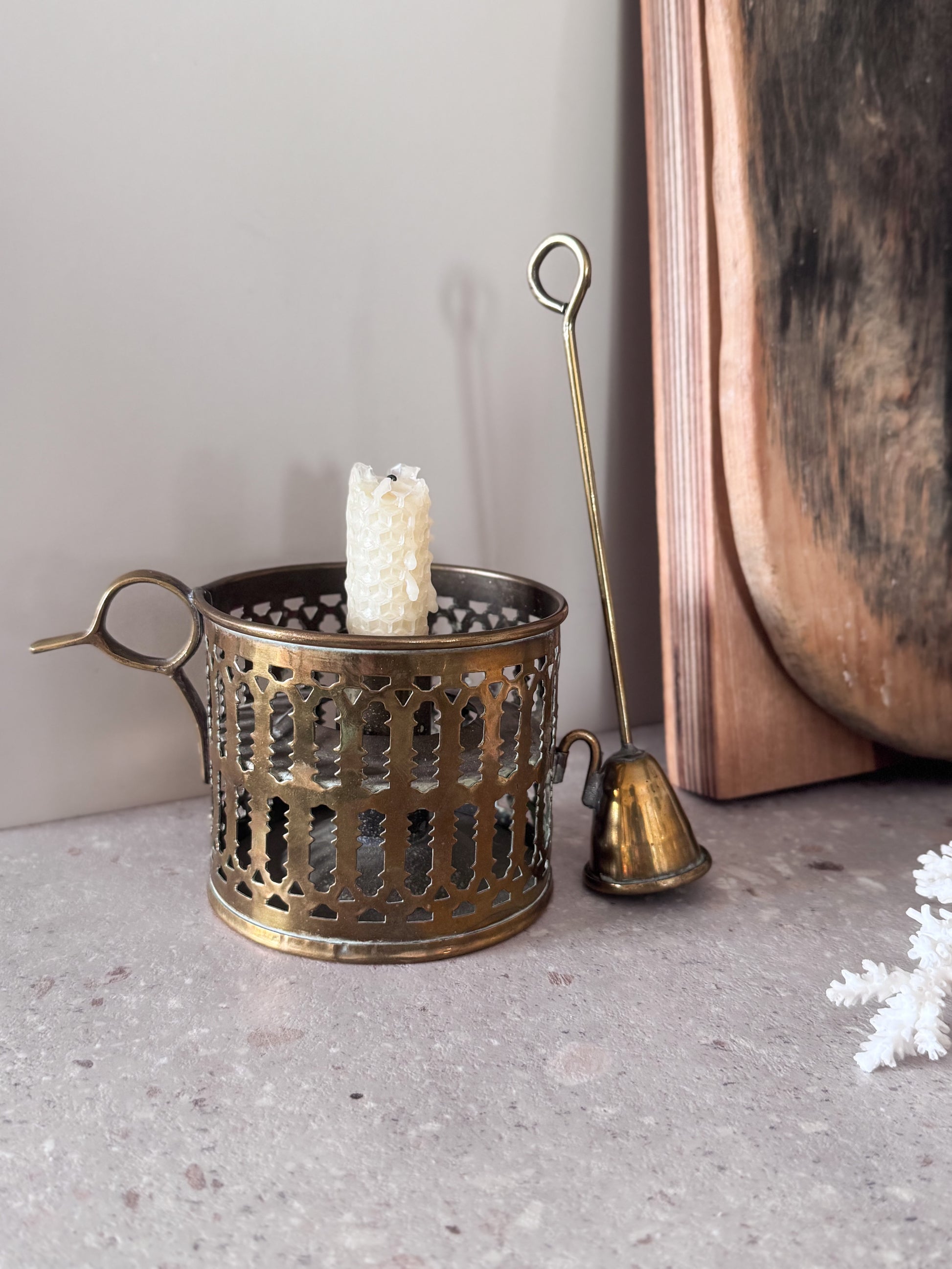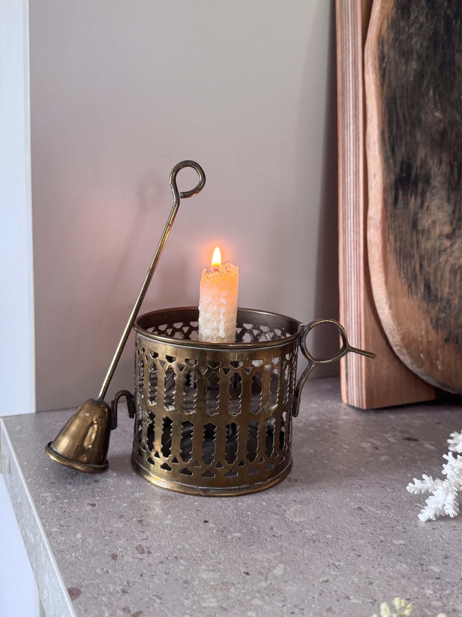 The pierced filigree gallery casts the softest patterns when lit, gently diffusing the glow of a flame, while the curved handle and finger loop speak to its practical origins, once carried through dimly lit hallways and tucked beside bedside tables. The accompanying snuffer rests neatly at the side, a thoughtful detail that feels both functional and poetic.