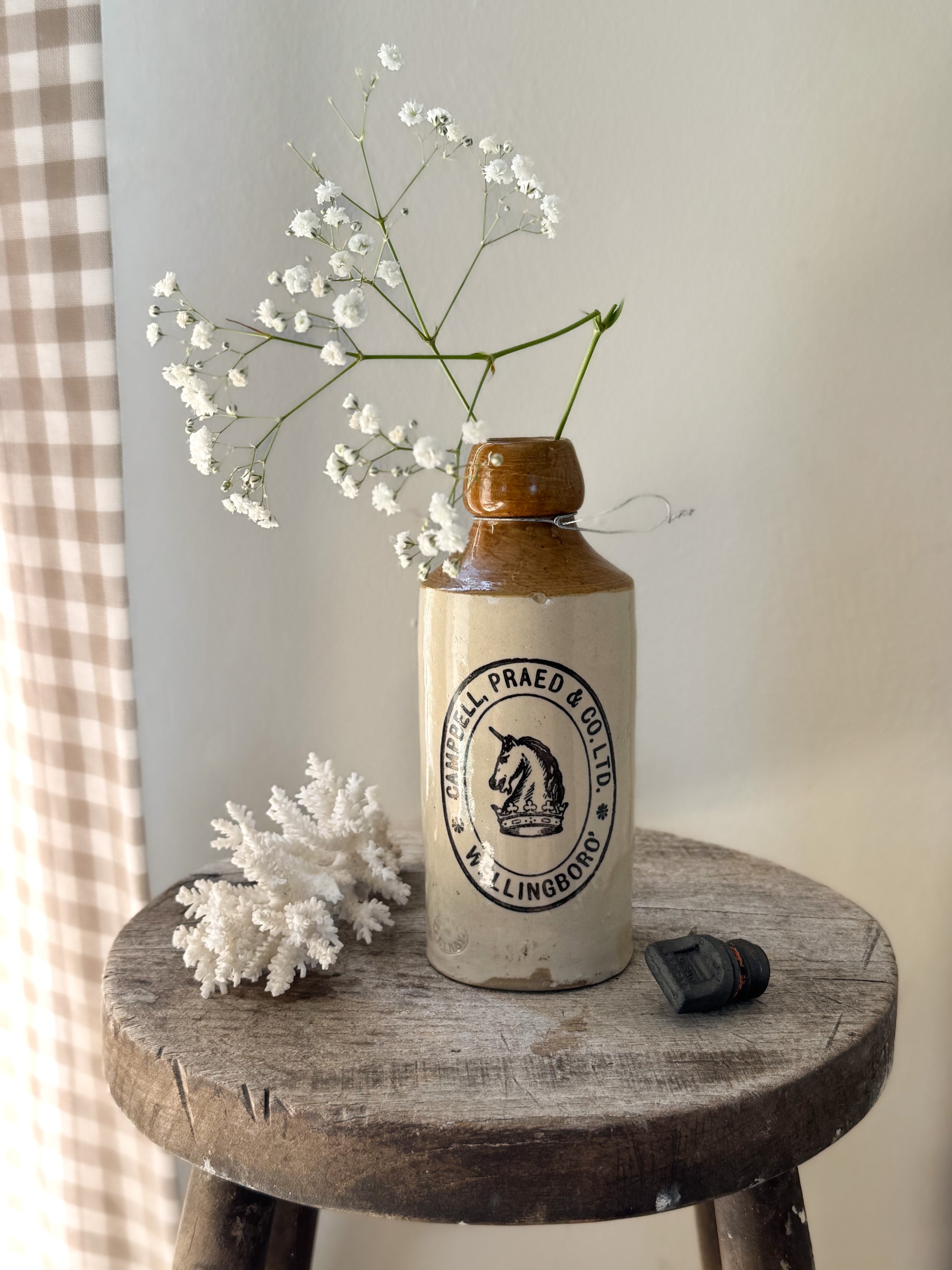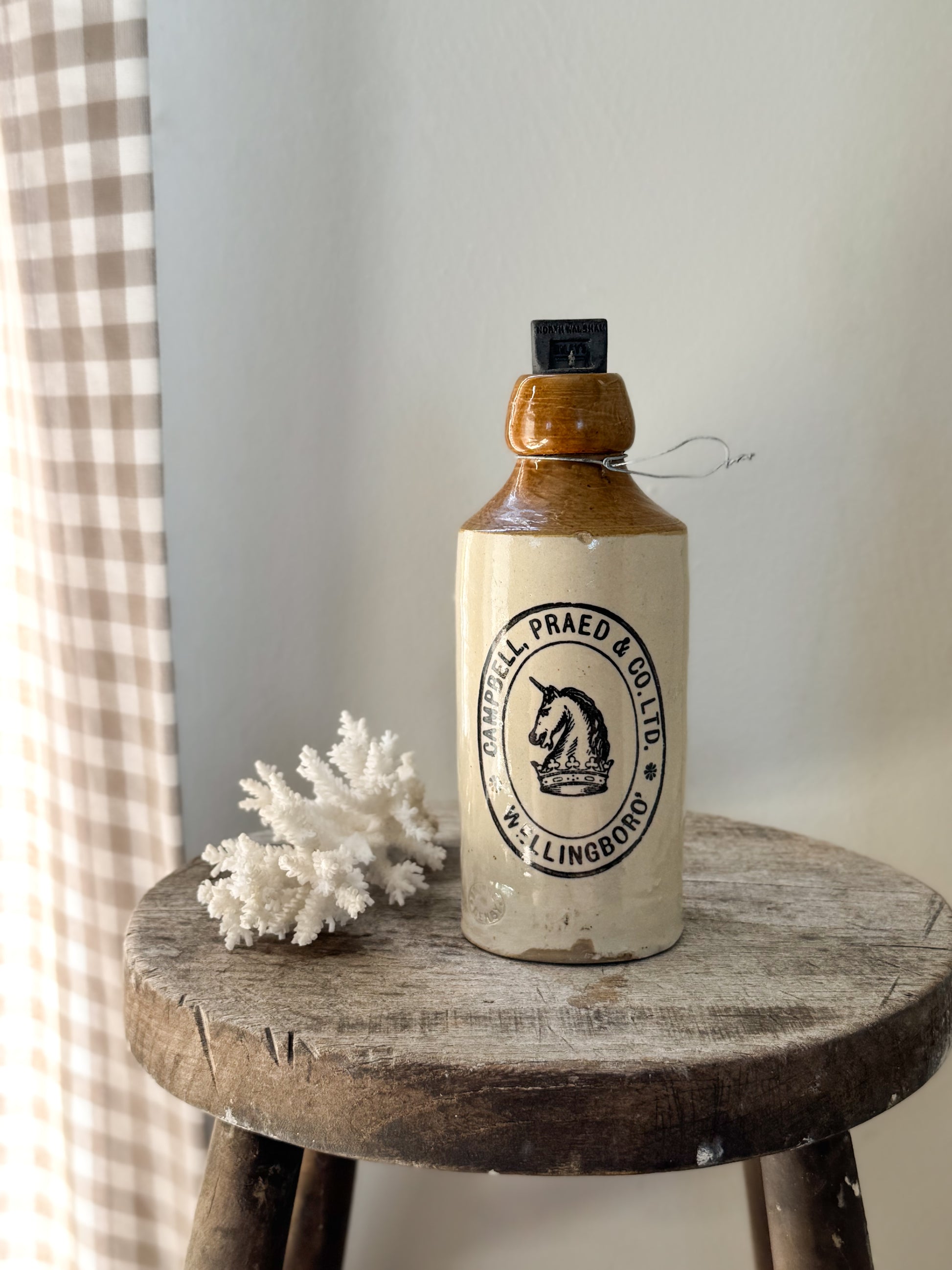 Finished in a classic two-tone salt glaze, warm treacle brown over a creamy stone base, the bottle bears the striking Campbell Praed unicorn crest in bold black transfer. Originally used to bottle ginger beer, it now makes a beautiful shelf piece, single-stem vase, or a standout addition to a utilitarian stoneware collection.