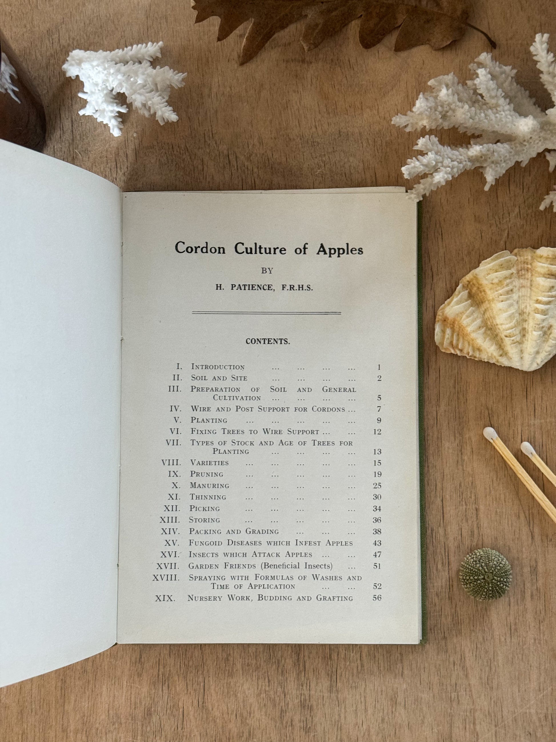A beautifully understated mid-20th-century horticultural handbook devoted to the careful art of training apple trees. Cordon Culture of Apples was written by H. Patience, F.R.H.S., and published in the 1940s, at a time when practical gardening knowledge was passed down slowly, deliberately, and with deep respect for the land.