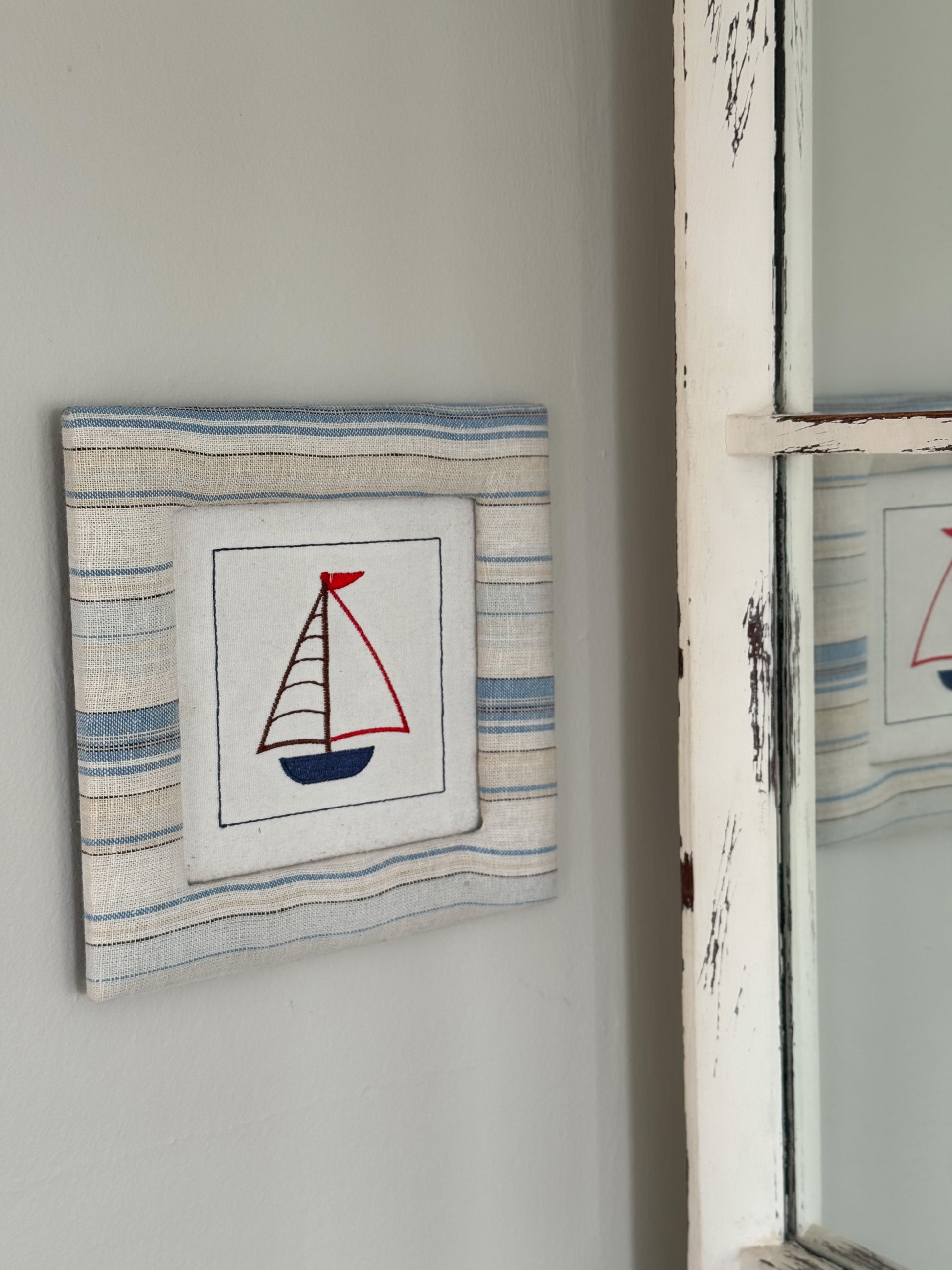 A charming piece of hand-stitched coastal decor, this embroidered sail boat rests within a soft fabric-wrapped frame in muted stripes of cream and blue. The simple lines of the design, paired with its bold red sail, evoke carefree days by the sea and the timeless appeal of nautical folk art.