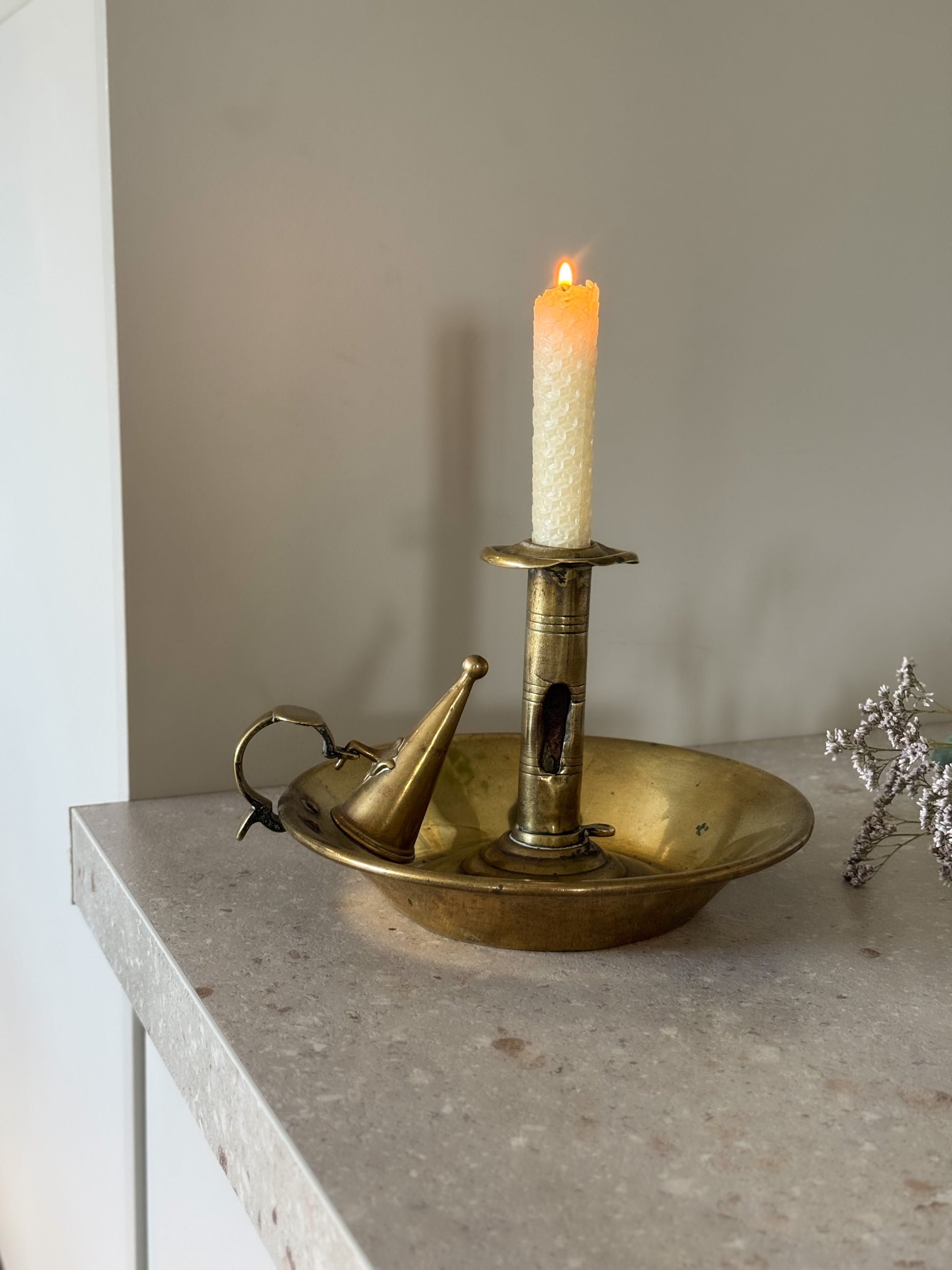 A wonderfully characterful extra large handmade brass chamberstick, complete with its original cone-shaped snuffer - a true treasure from the days when candlelight was carried from room to room. Substantial in weight and presence, this piece has all the hallmarks of genuine, well-loved age.