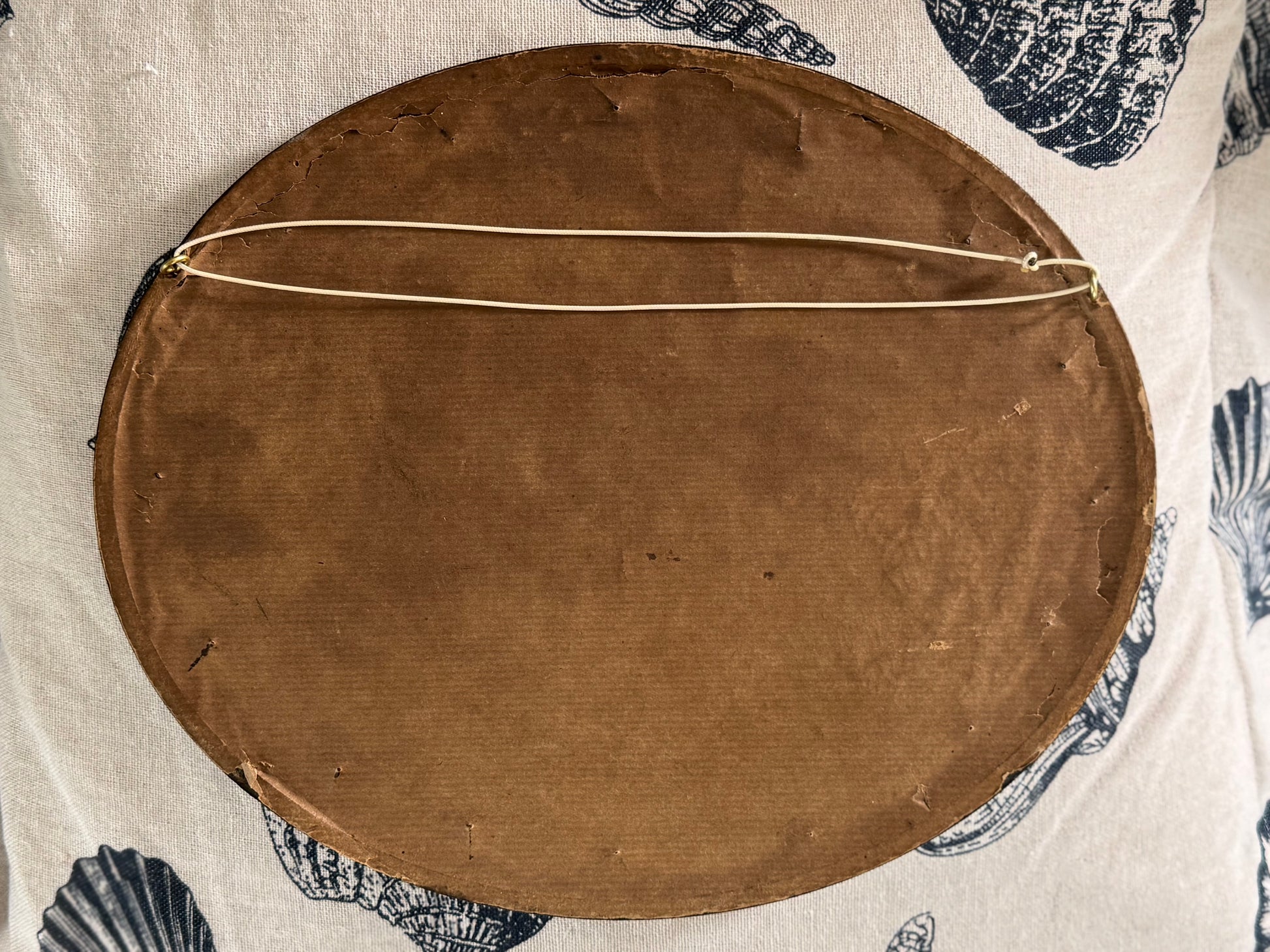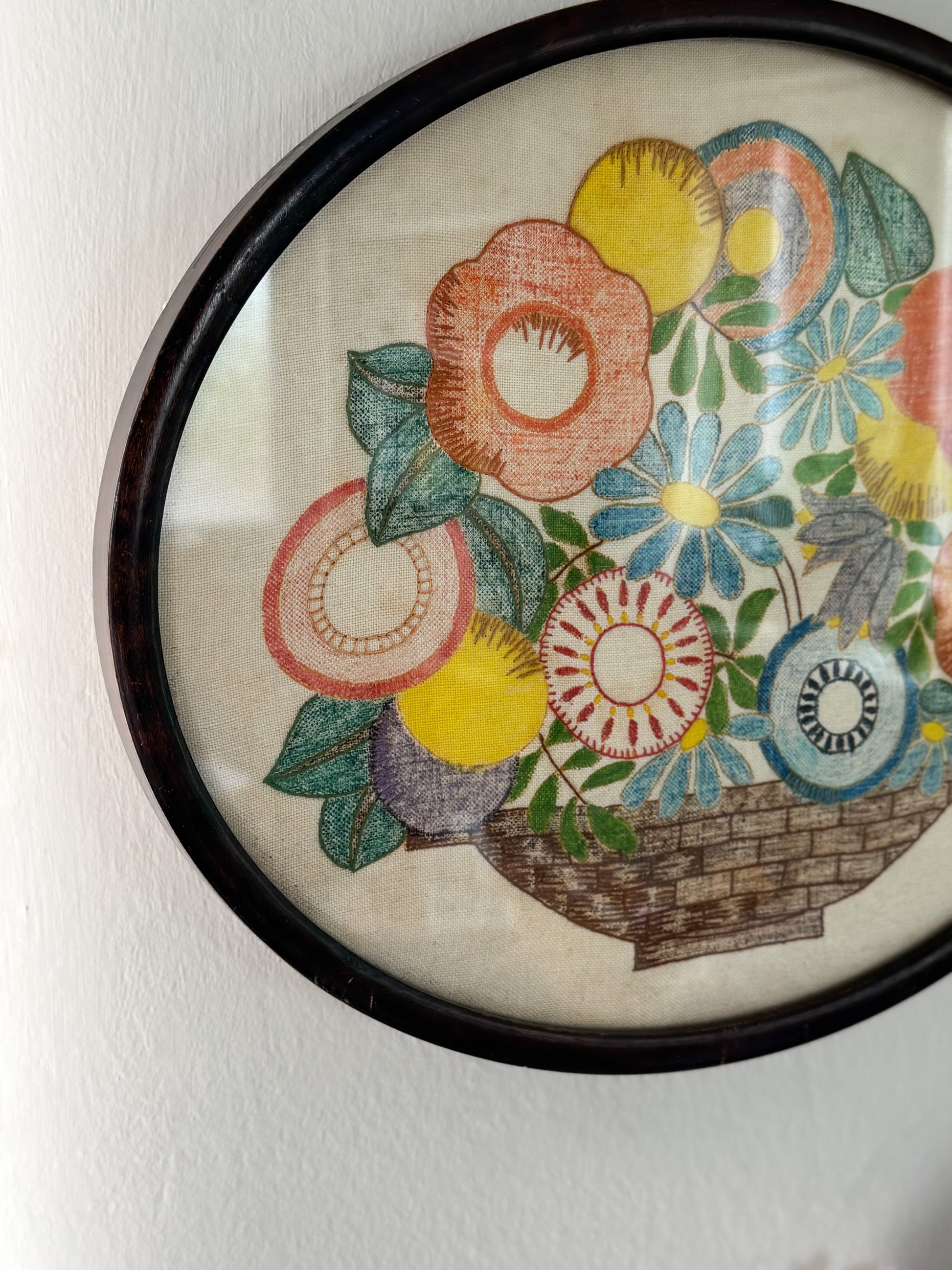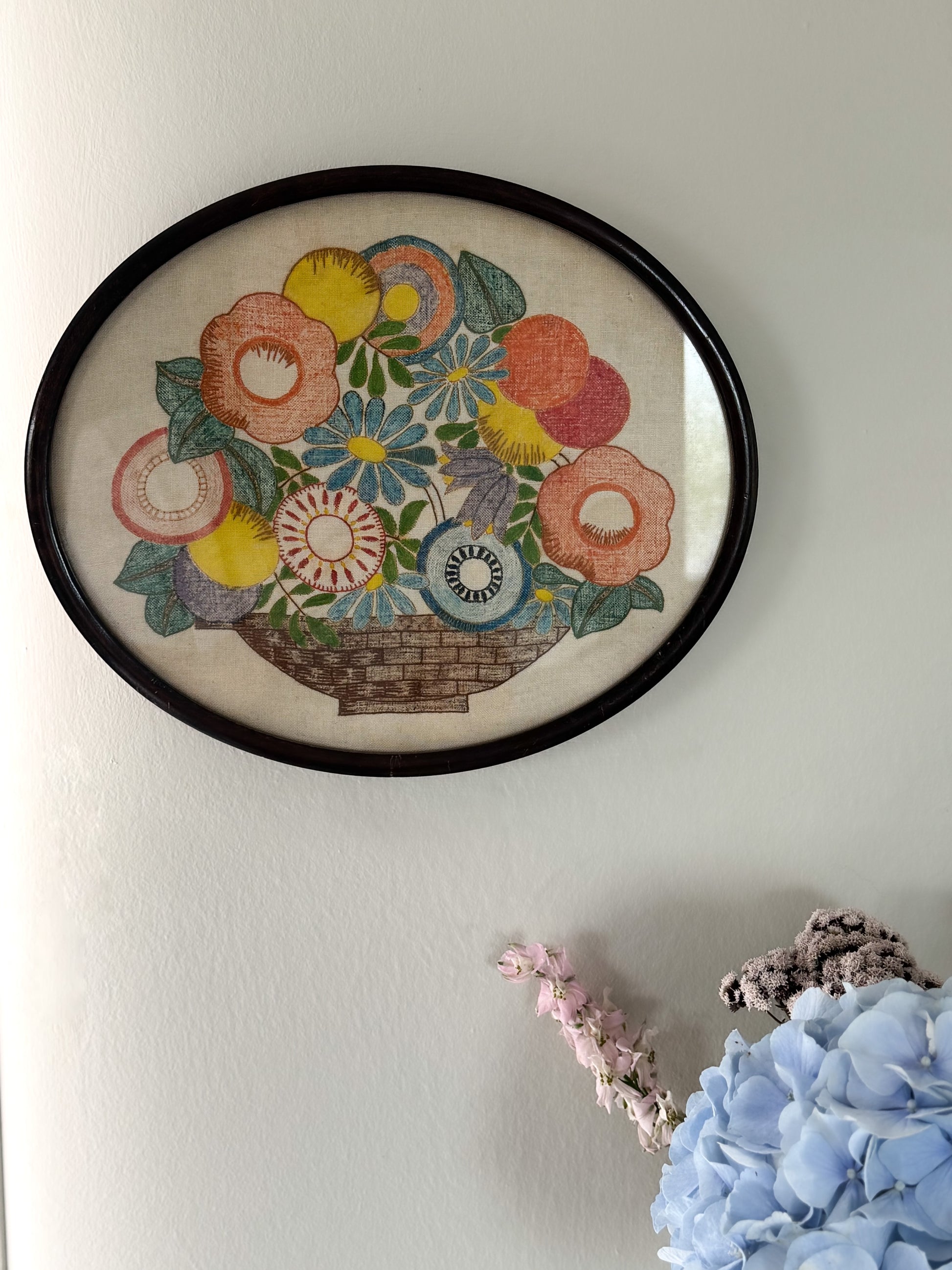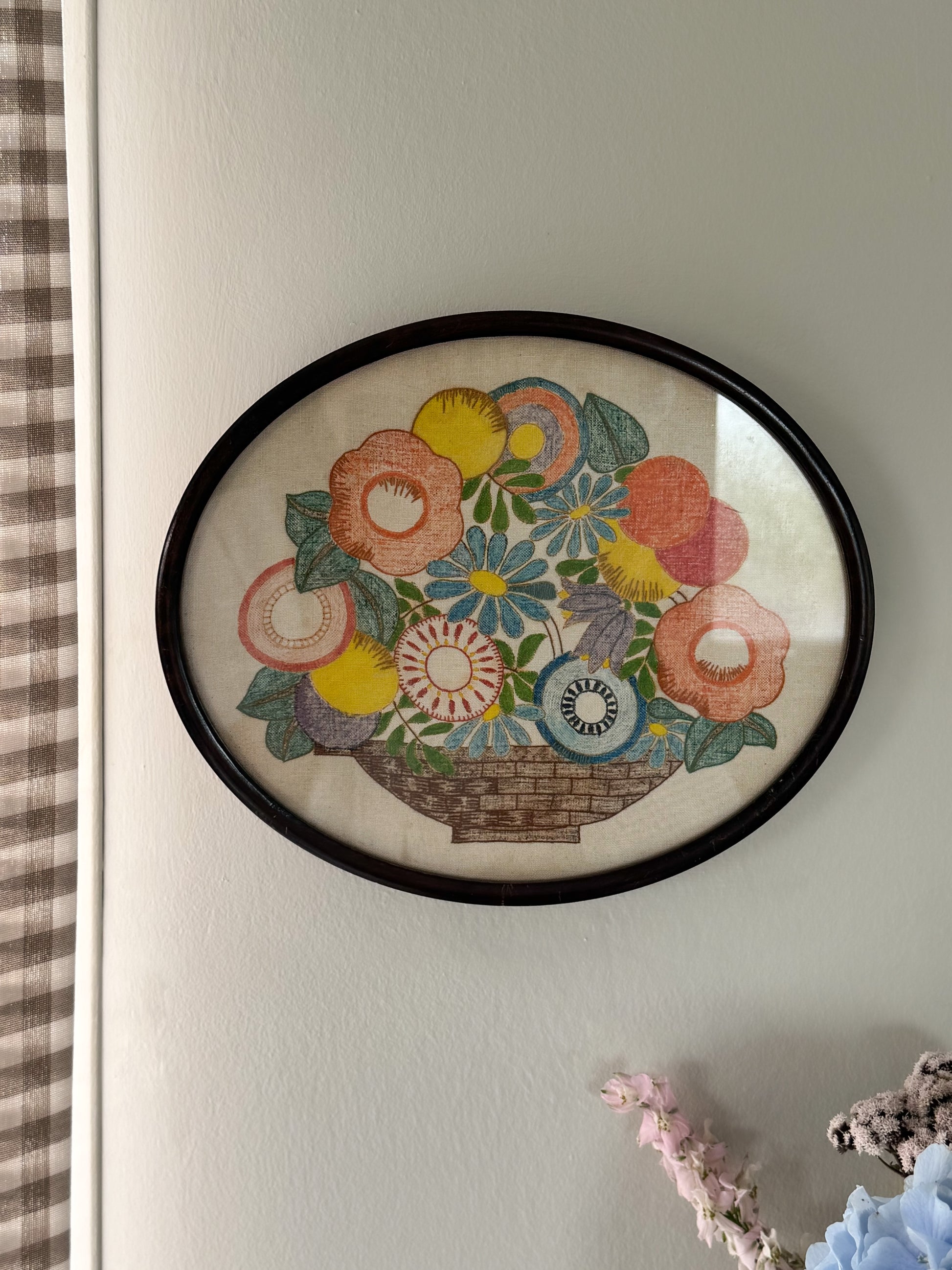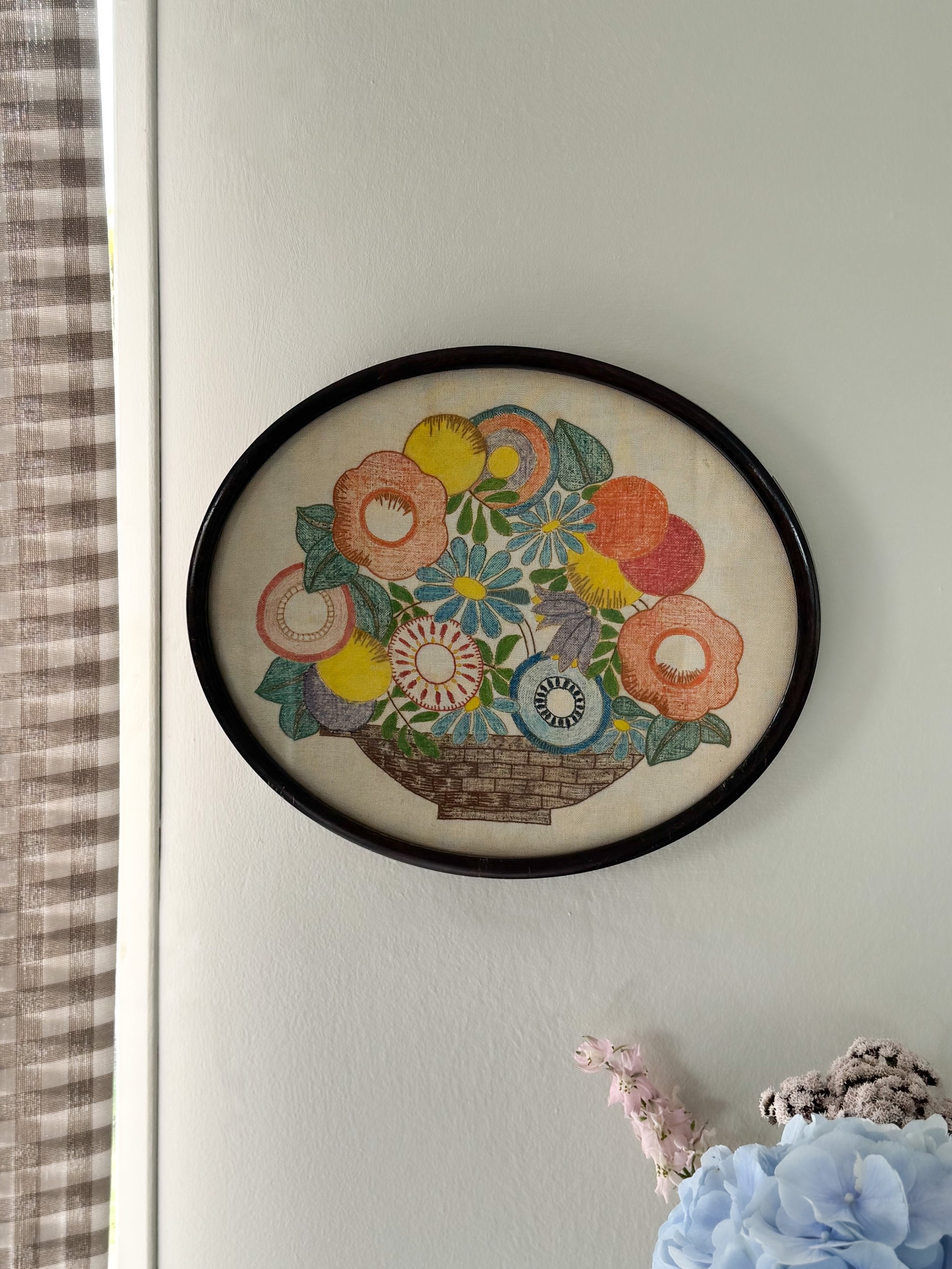 Lovingly stitched onto a soft linen ground and framed behind glass in an elegant dark wood oval frame, it’s a celebration of slow craft and everyday beauty. The aged backing and early hanging wire suggest it was carefully framed many decades ago, adding to its sense of history and homely nostalgia.