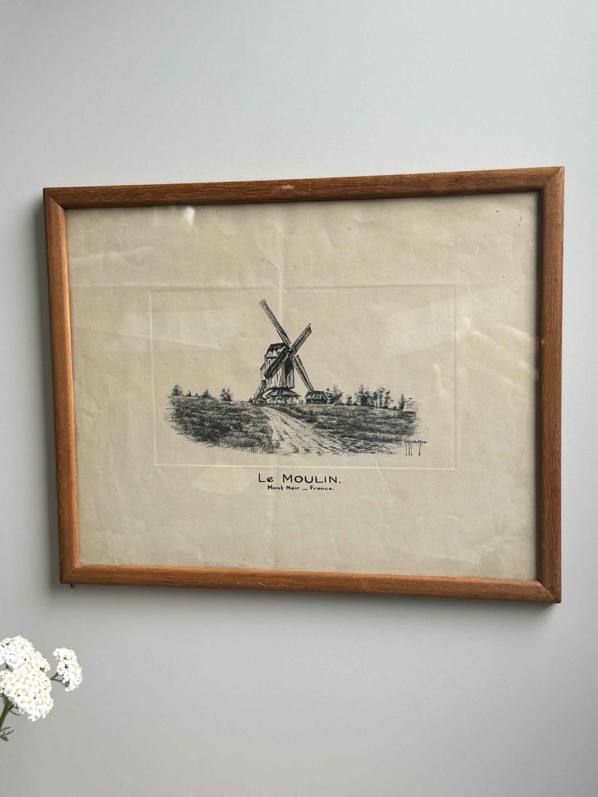 Vintage French Windmill, Mont Noir Framed Pencil Sketch