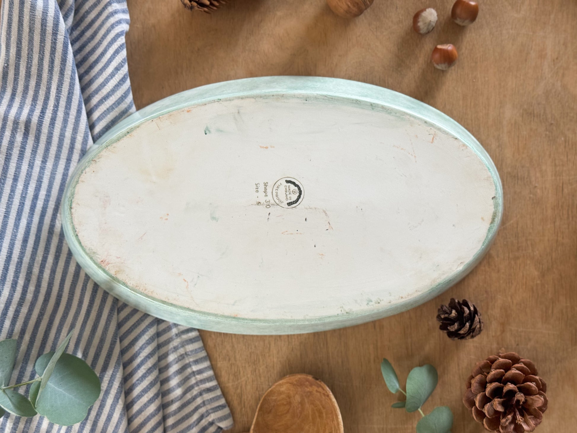 Made in England and stamped fireproof, this dish isn’t just decorative, it’s wonderfully practical too. Its generous, oval shape makes it perfect for serving hearty casseroles, pies, roasted vegetables, or seasonal bakes straight from the oven to the table. The soft, painterly glaze in shades of green, blue, and warm brown lends it that timeless countryside charm.