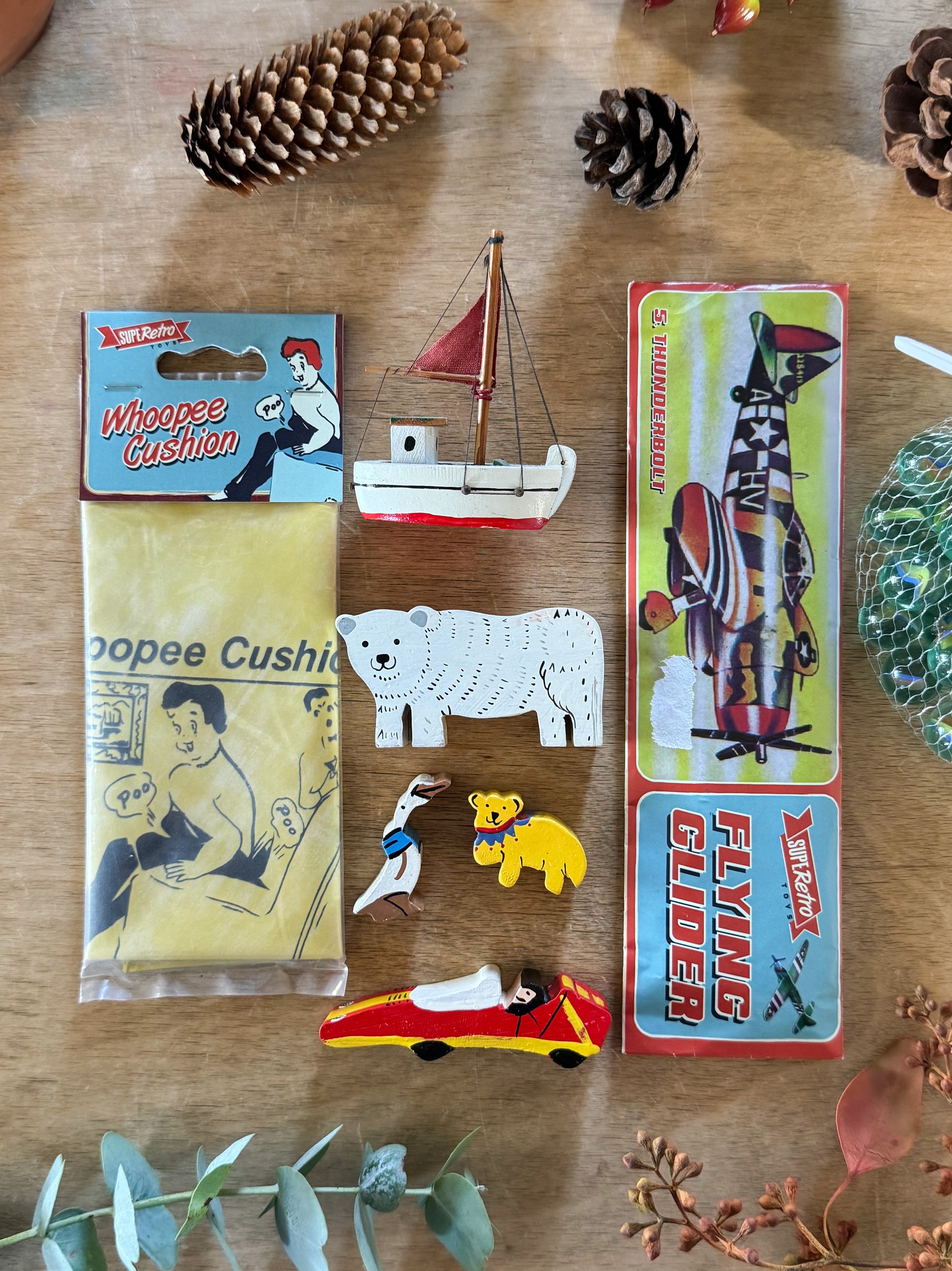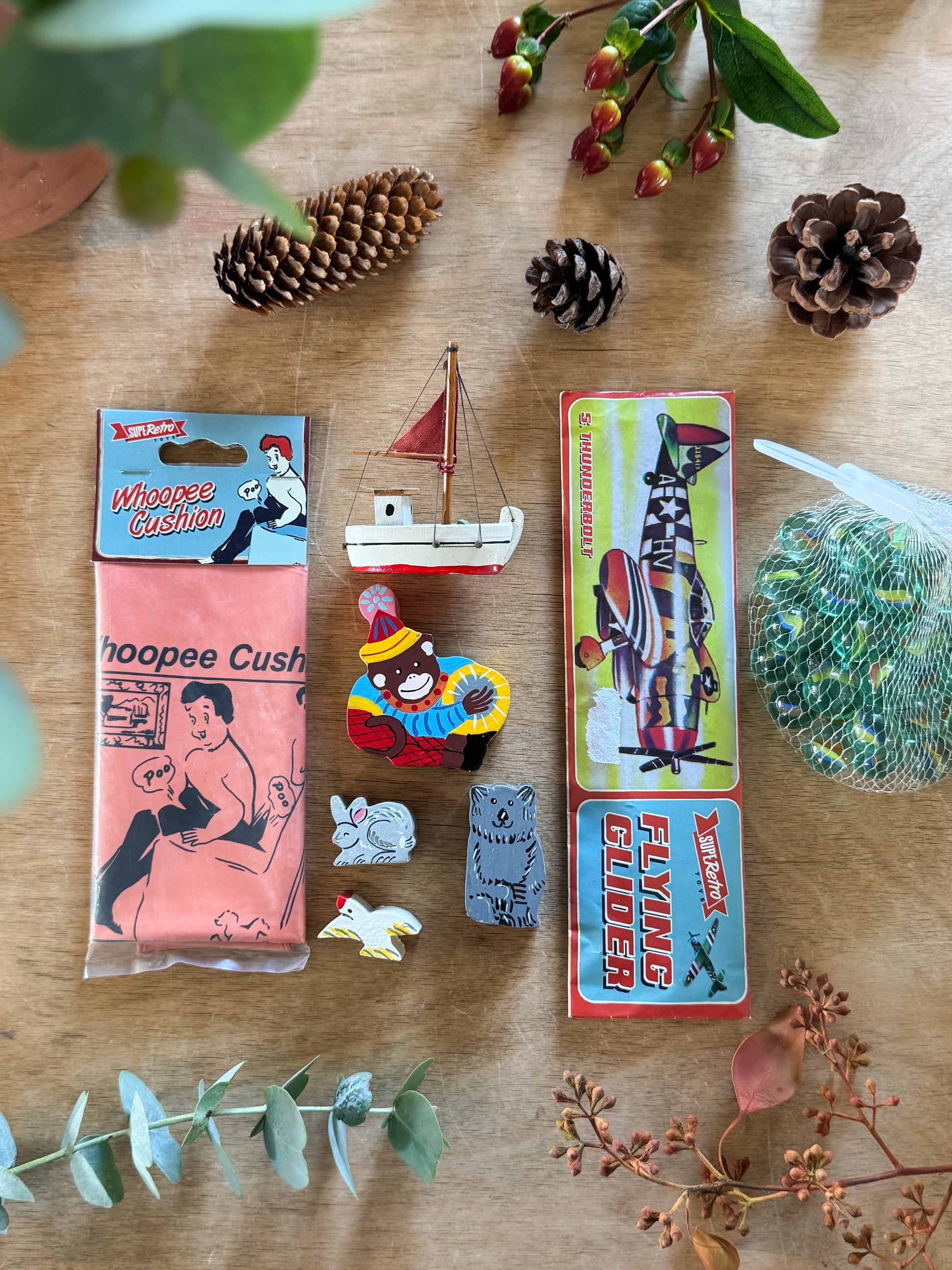 A joyful mix of retro playthings, vintage objects and handmade treasures, thoughtfully bundled with a touch of nostalgia. Each set includes a new old stock whoopee cushion, a flying glider plane, a set of vintage marbles, a miniature vintage handmade wooden fishing boat, and four hand-painted vintage wooden animals, each one slightly different, with its own character and charm.