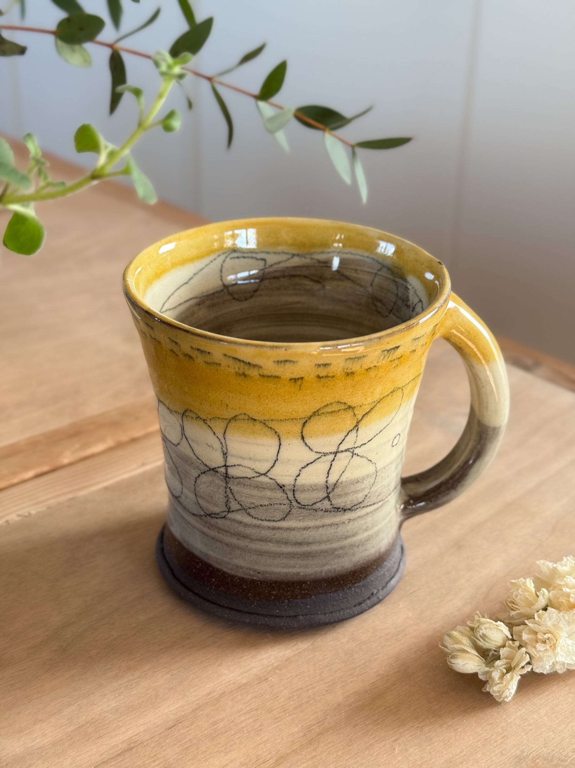 A beautiful vintage studio pottery slipware mug by Sheila Herring finished in warm mustard yellow, soft stone tones and loose, abstract line decoration.