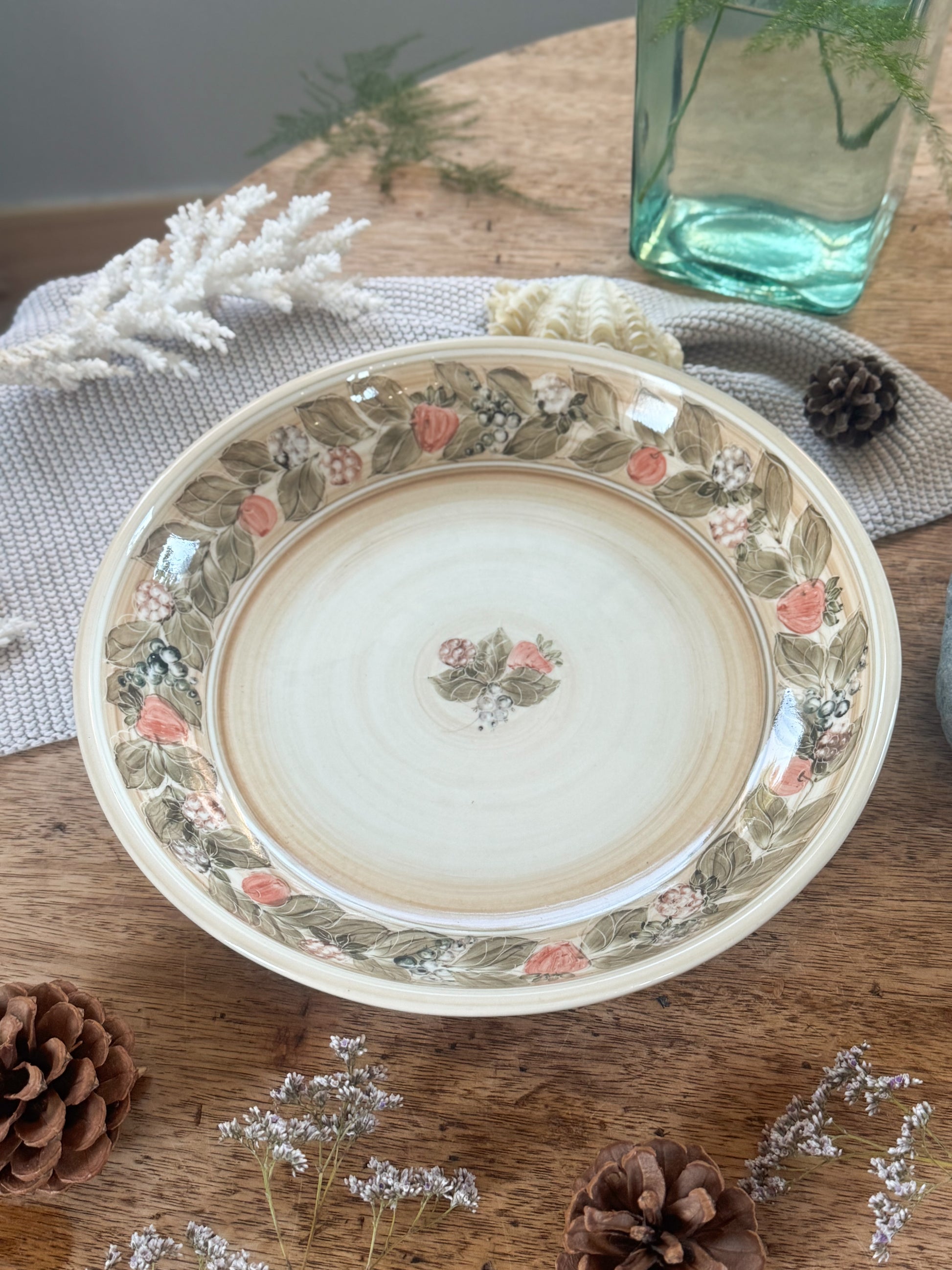 This beautiful large vintage bowl by Jersey Pottery feels as though it has stepped straight out of a Brambly Hedge or Wind in the Willows illustration. The hand-painted border is adorned with soft peaches, berries, and leafy sprigs in muted woodland tones, a gentle, nostalgic palette that instantly evokes hedgerow walks and autumn berries.