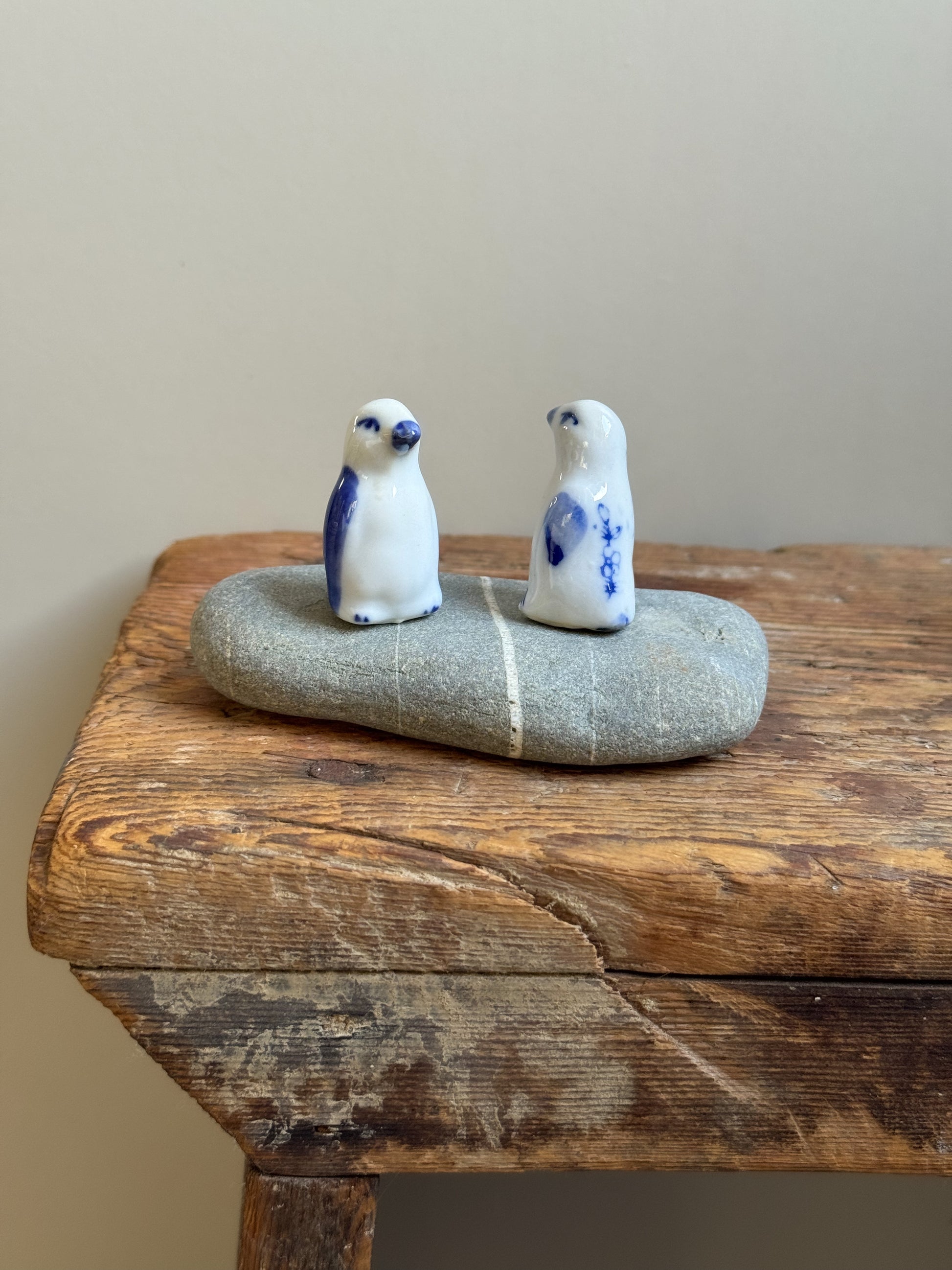 A pair of the sweetest little porcelain penguins, hand-painted in classic blue and white. Each one is slightly unique, with delicate brushstrokes that give them their own quiet personality. Their tiny scale makes them all the more endearing, a pocket-sized pair to treasure.