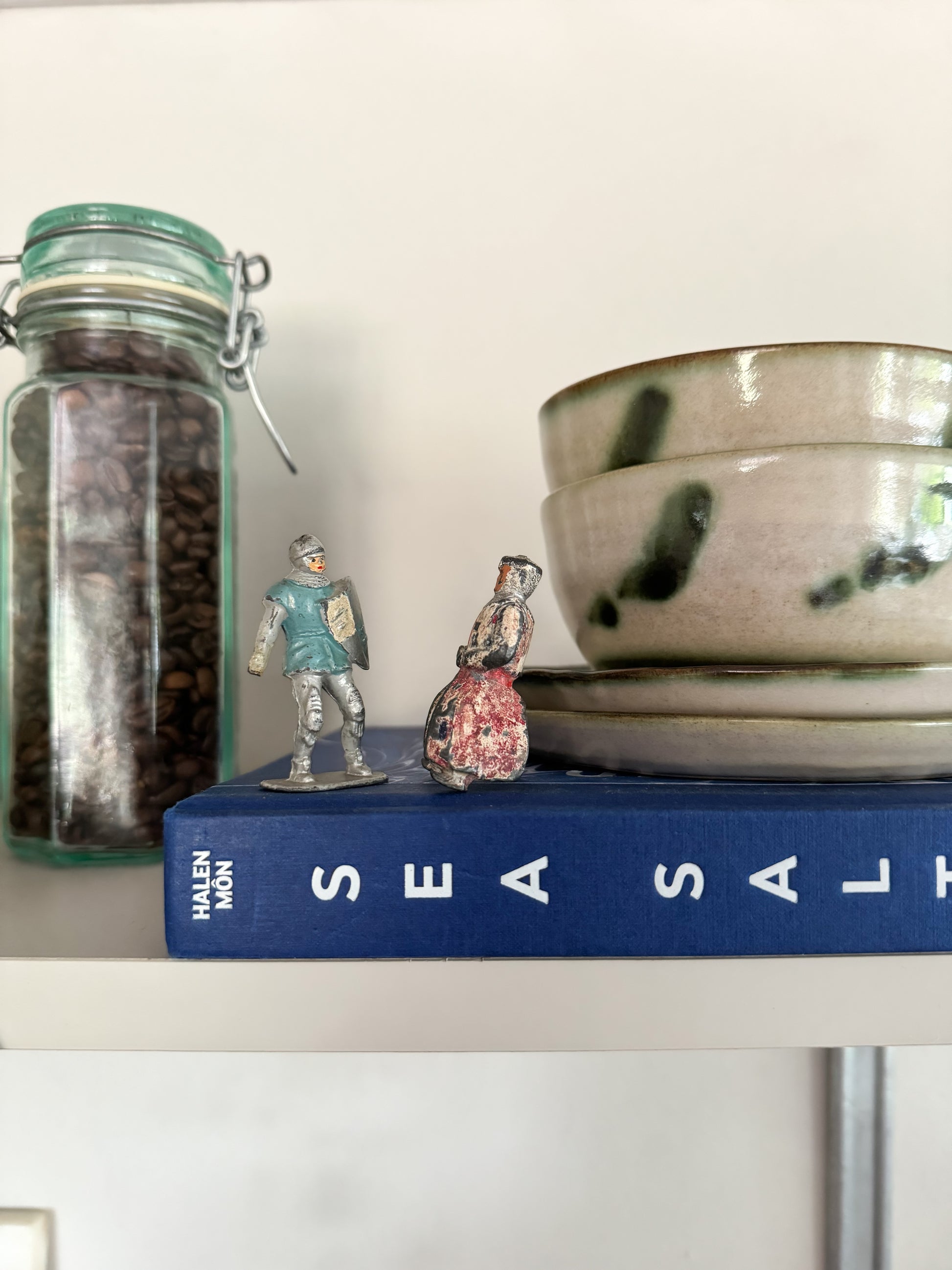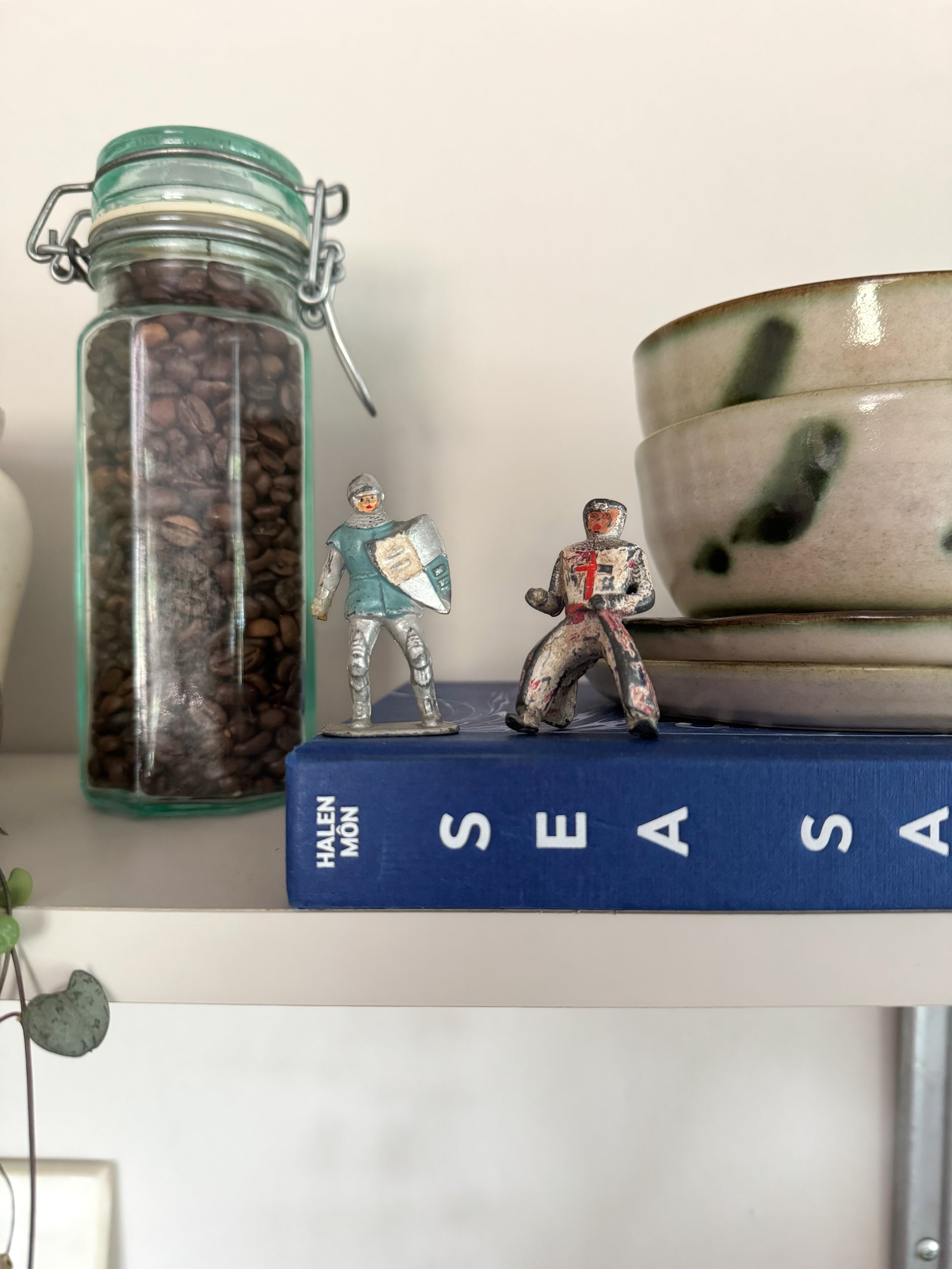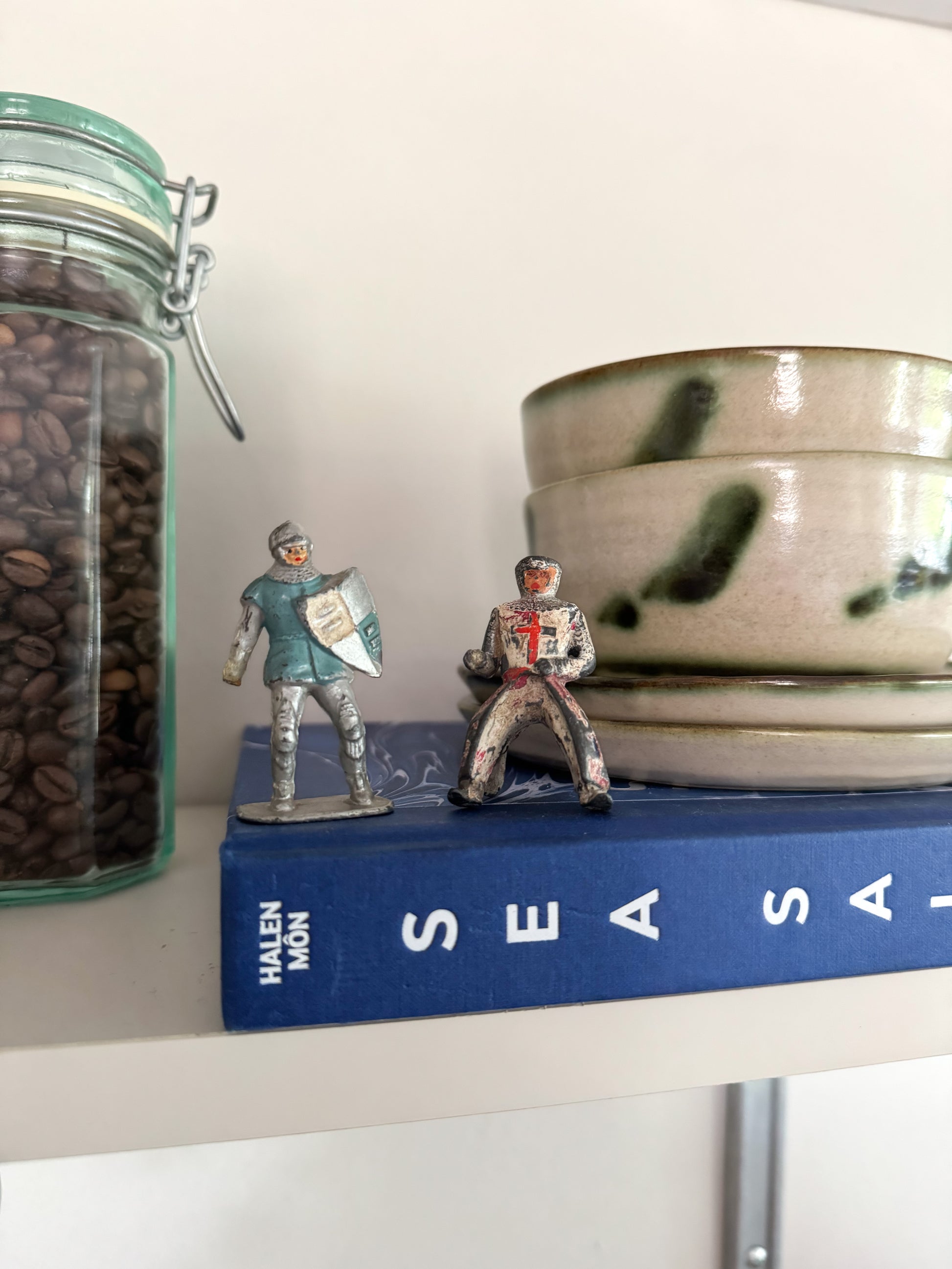 A pair of charming little lead toy knights, one from England, and one from France. Both miniatures are missing parts but are beautifully aged and very decorative.