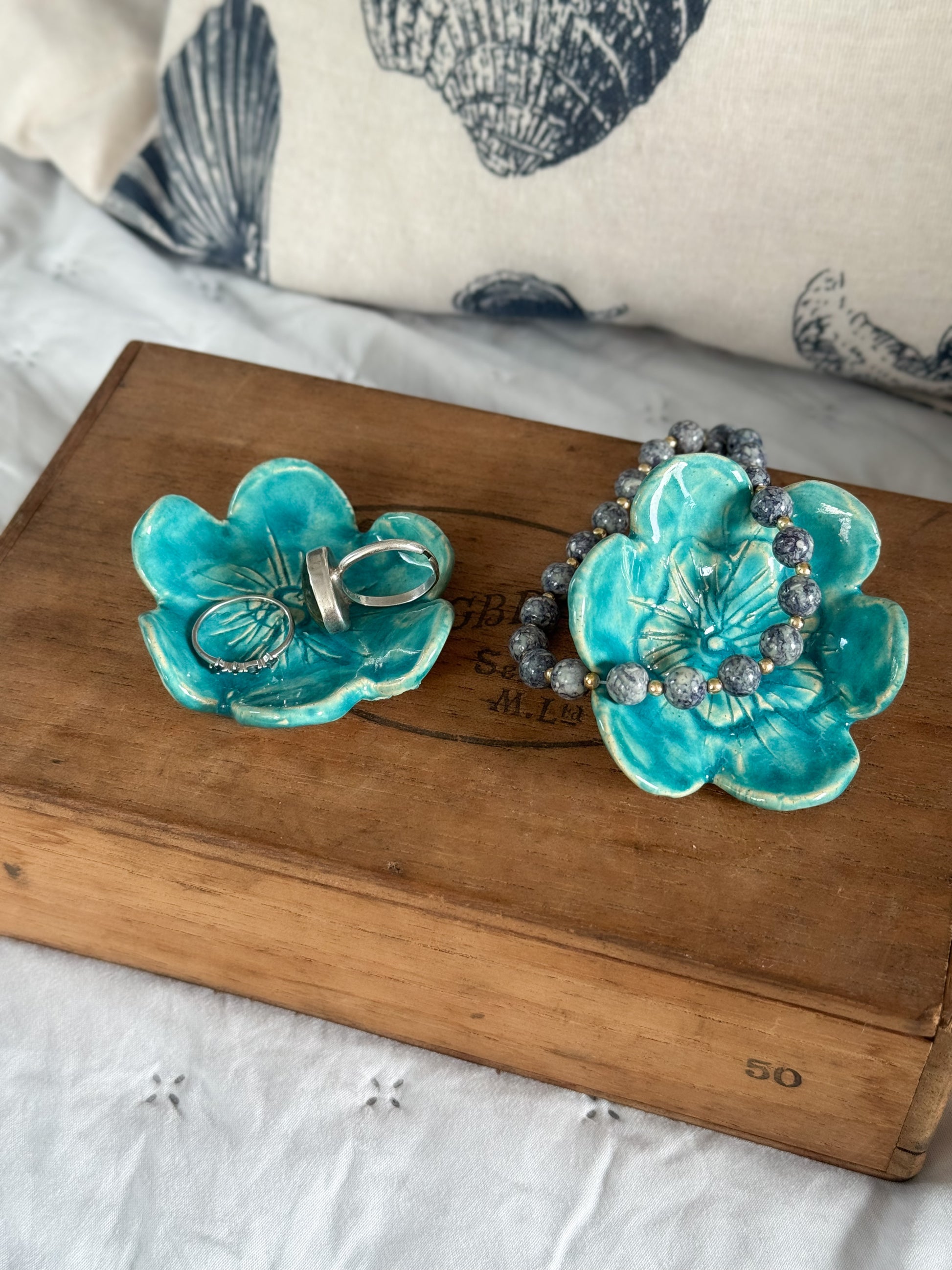 Pair of Turquoise Folk Art Studio Pottery Flower Trinket Dishes