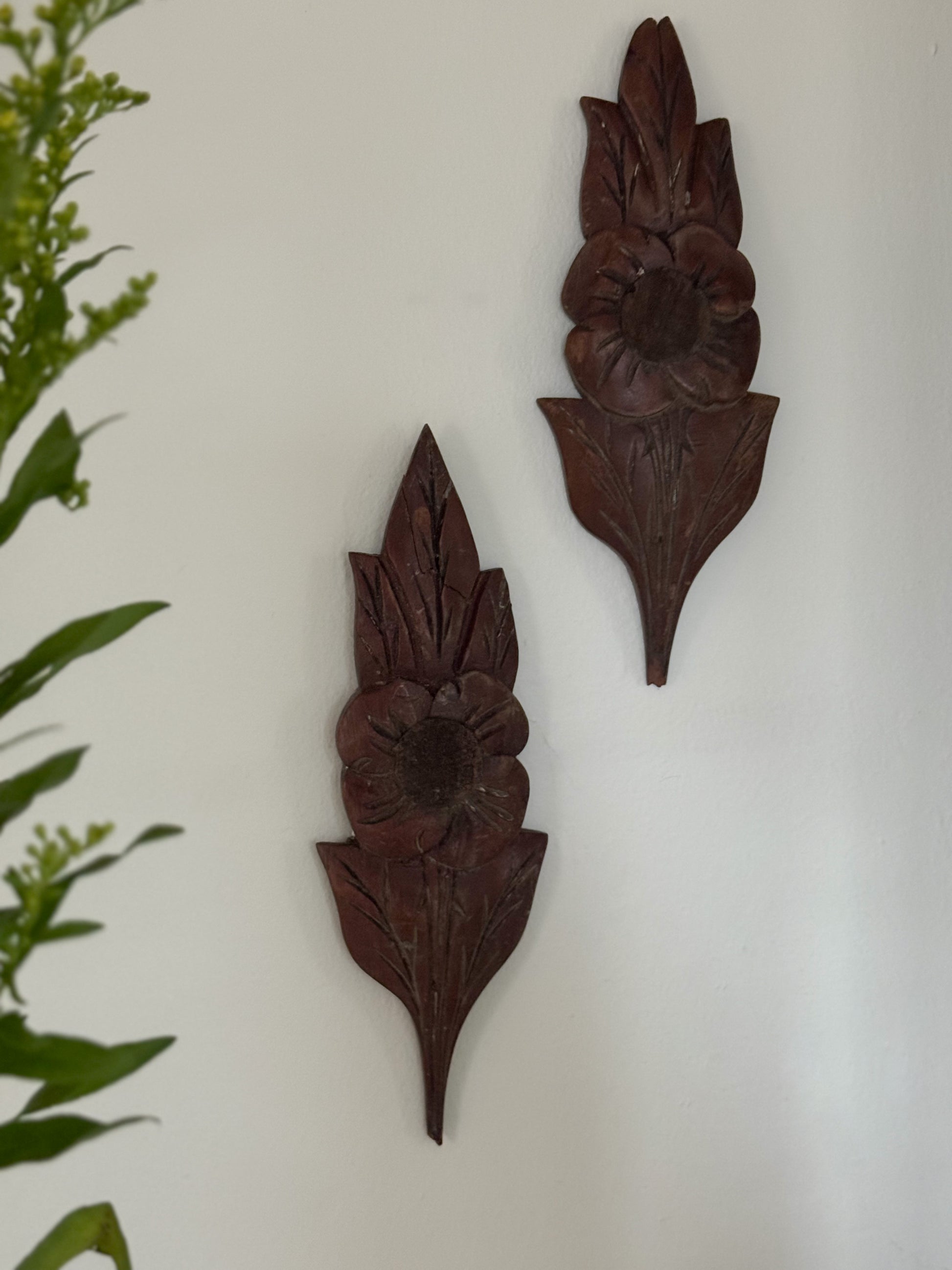 A beautiful pair of vintage hand-carved wooden flowers, rich in texture and timeworn charm. Each piece is individually carved from solid wood, featuring a stylised flower with layered petals and leafy details, perfectly imperfect in the way only handmade objects can be.
