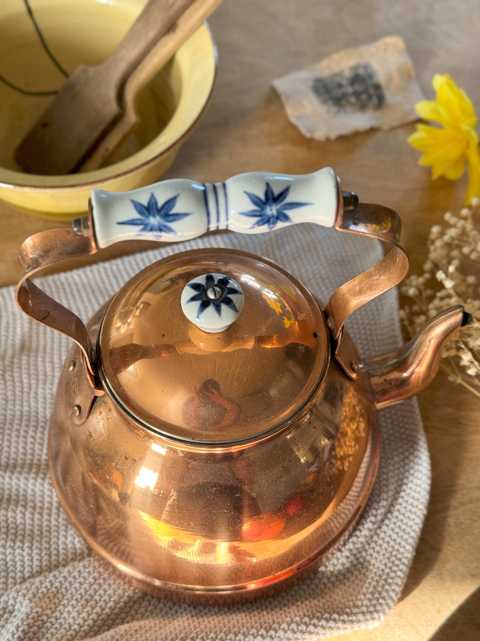 A beautiful copper kettle with blue and white ceramic handle, made in Portugal. Natural patina to the copper, the inside is stainless steel coated, it looks to have never been used and comes with its original label.