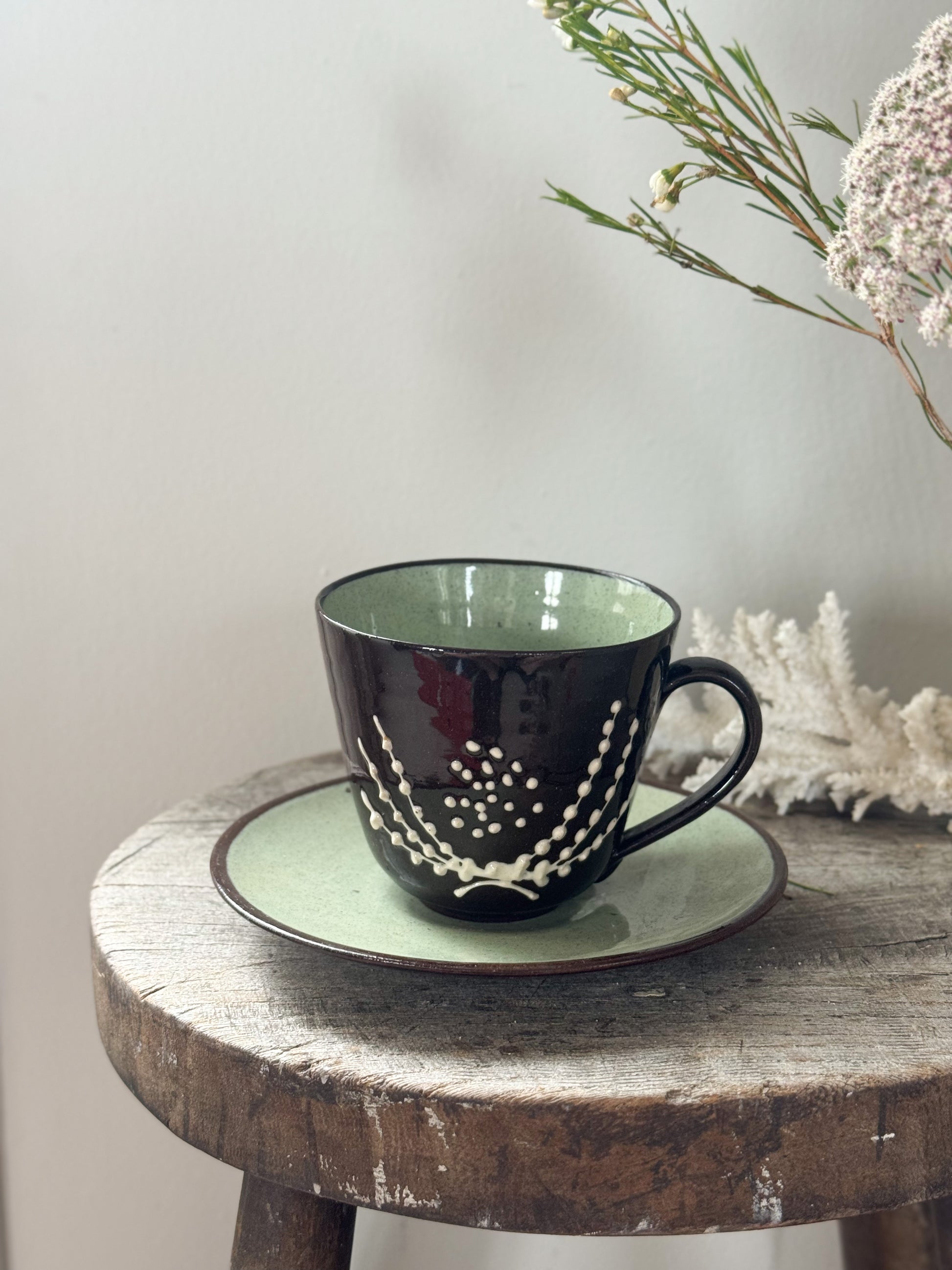 A rare and beautiful example of mid-century Welsh craftsmanship, made by Powell Pottery in Llangollen in the mid-1950s. This slipware cup and saucer set features a deep, glossy chocolate-brown glaze adorned with delicate white slip trailing in a folk-inspired design. The interior and saucer are finished in a soft, speckled sage green, creating a striking contrast that feels both timeless and earthy.