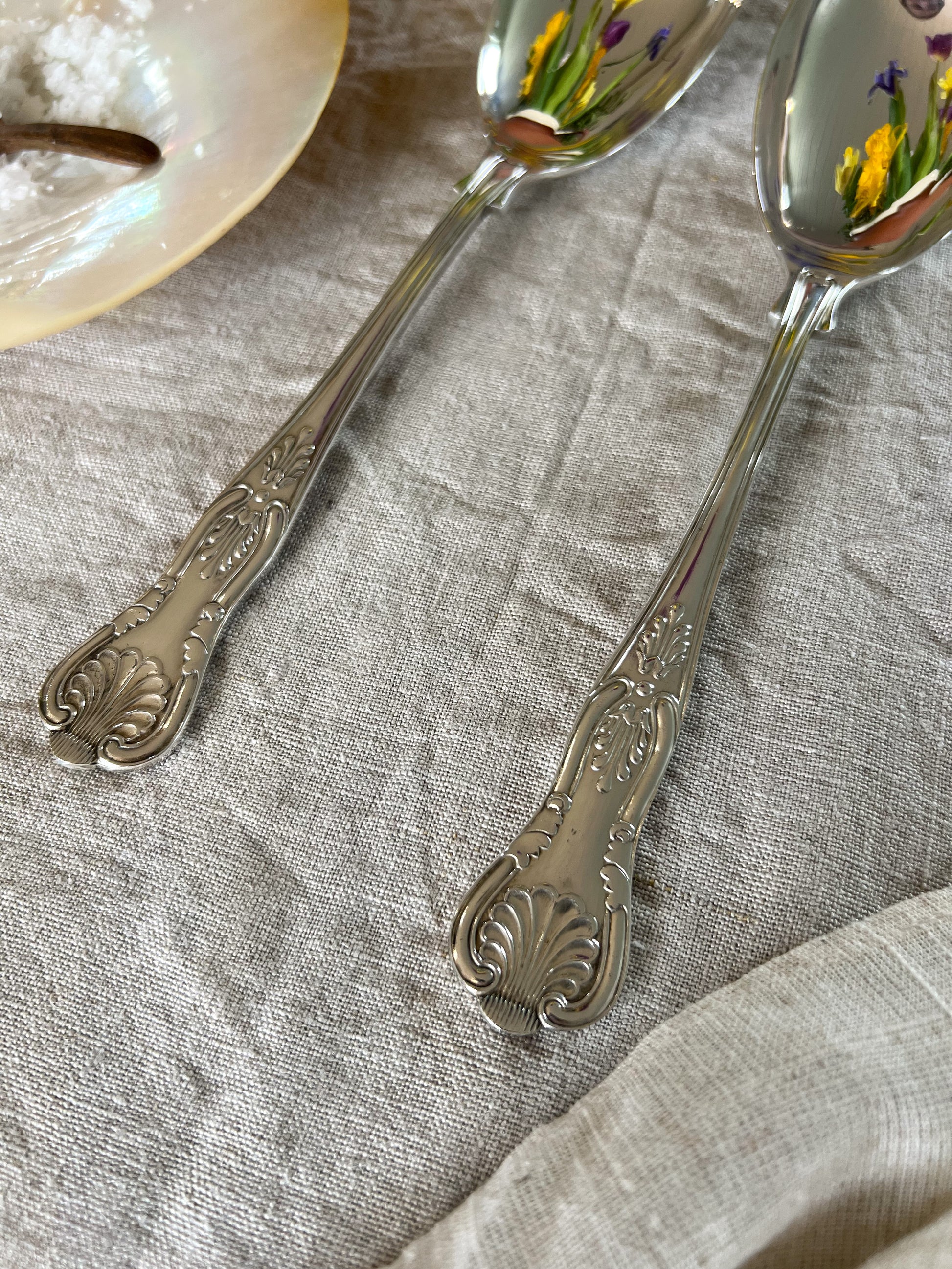 A beautiful pair of freshly polished silver plated salad servers with beautiful scalloped shell details on their handles.