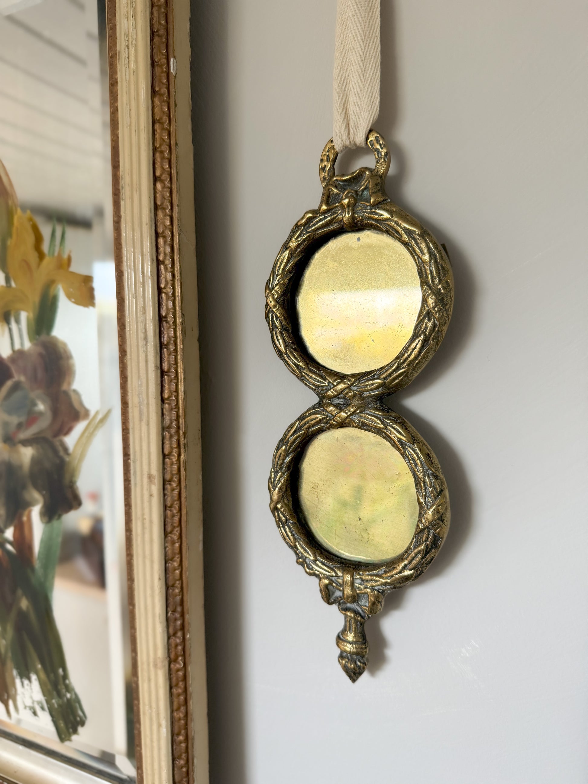 A beautiful solid brass double frame with glass inserts, a gorgeous bow detail at the top and a little loop for hanging. This gorgeous frame has been made to resemble a locket, and it’s it just the most gorgeous thing!?