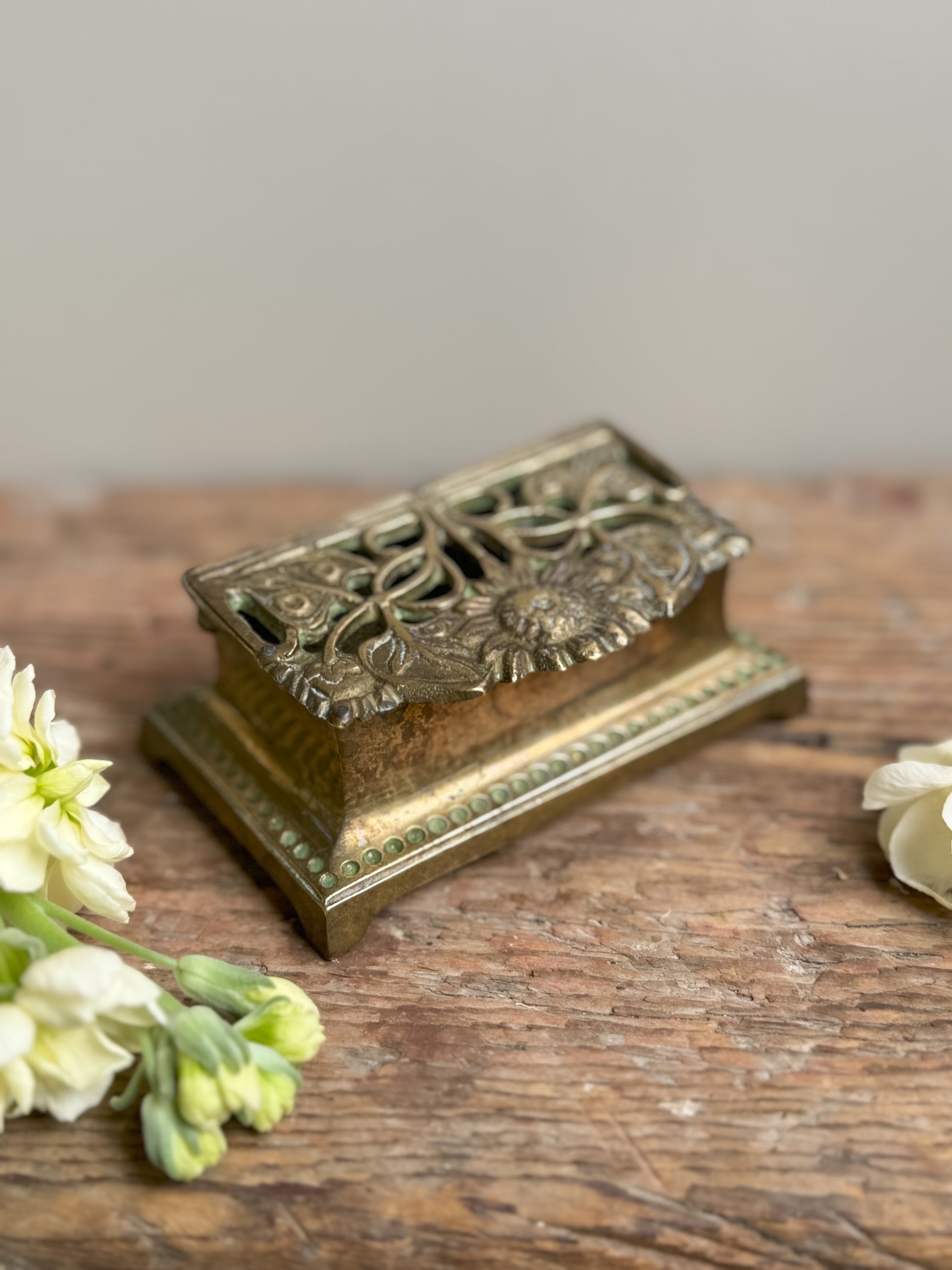 A beautiful solid brass inkwell with two compartments, one for ink and one for postage stamps.