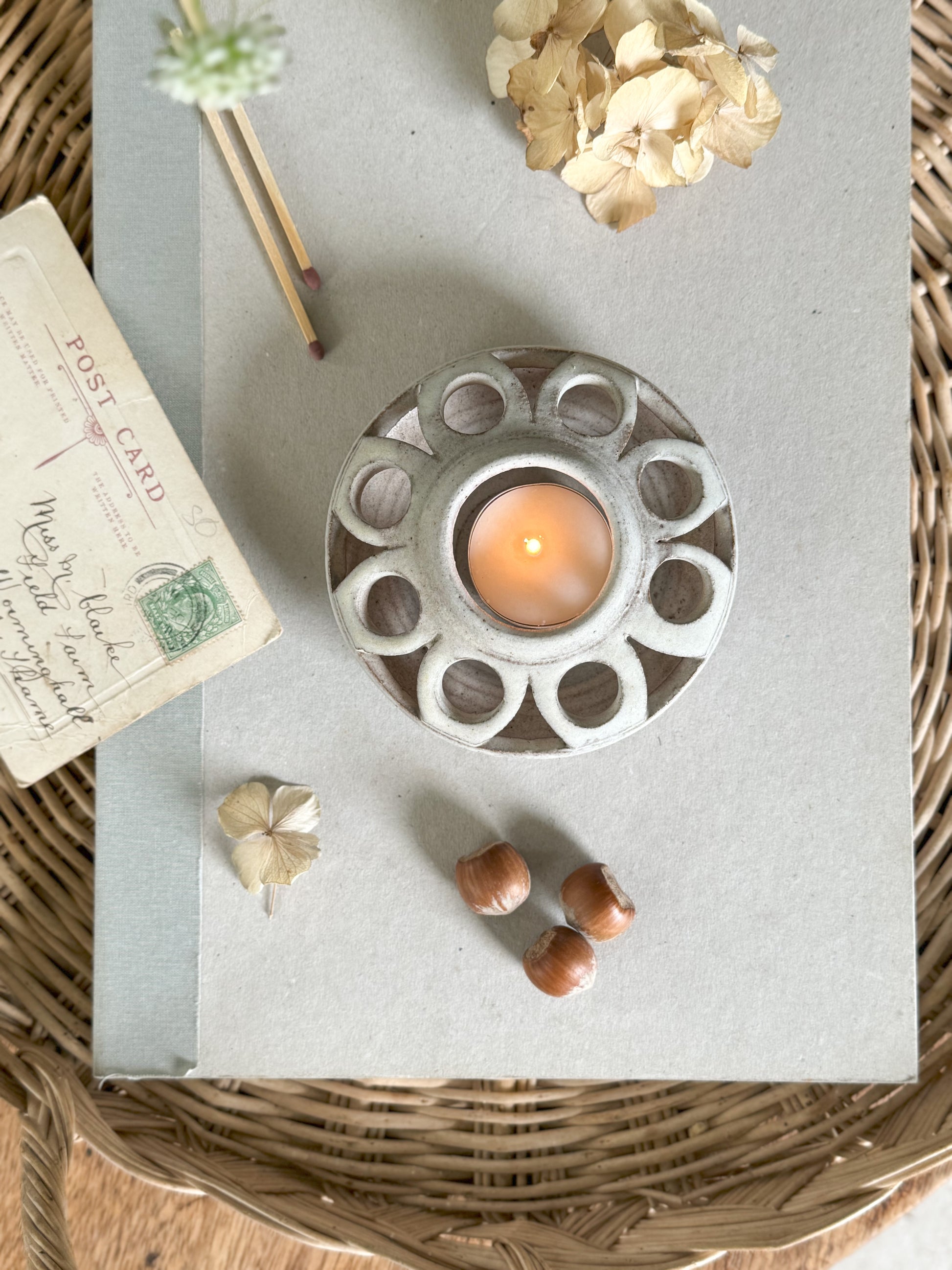 A beautiful flower shaped tealight holder with a gorgeous white salt glaze. We have two available (sold separately).