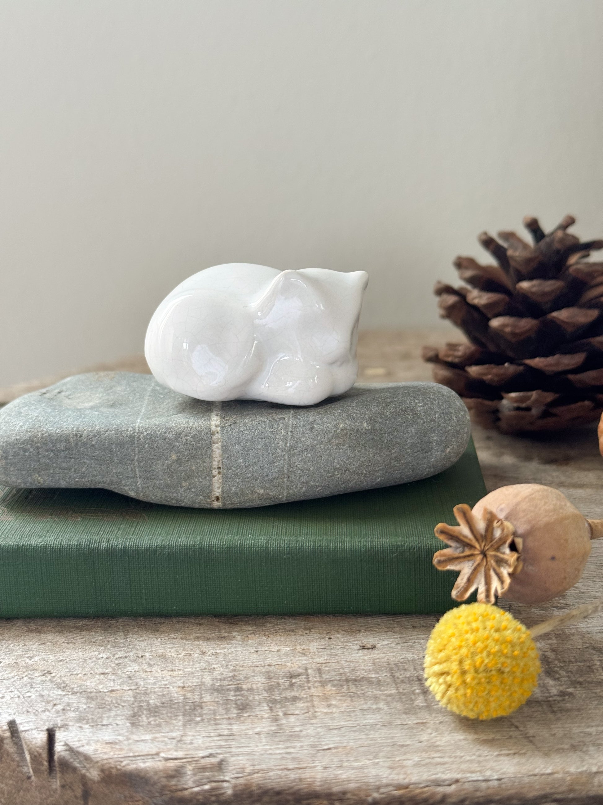 A sweet and delicate studio pottery figure of a curled-up cat, captured in the most peaceful pose. Handmade in a glossy white glaze, this tiny piece carries both charm and quiet simplicity.