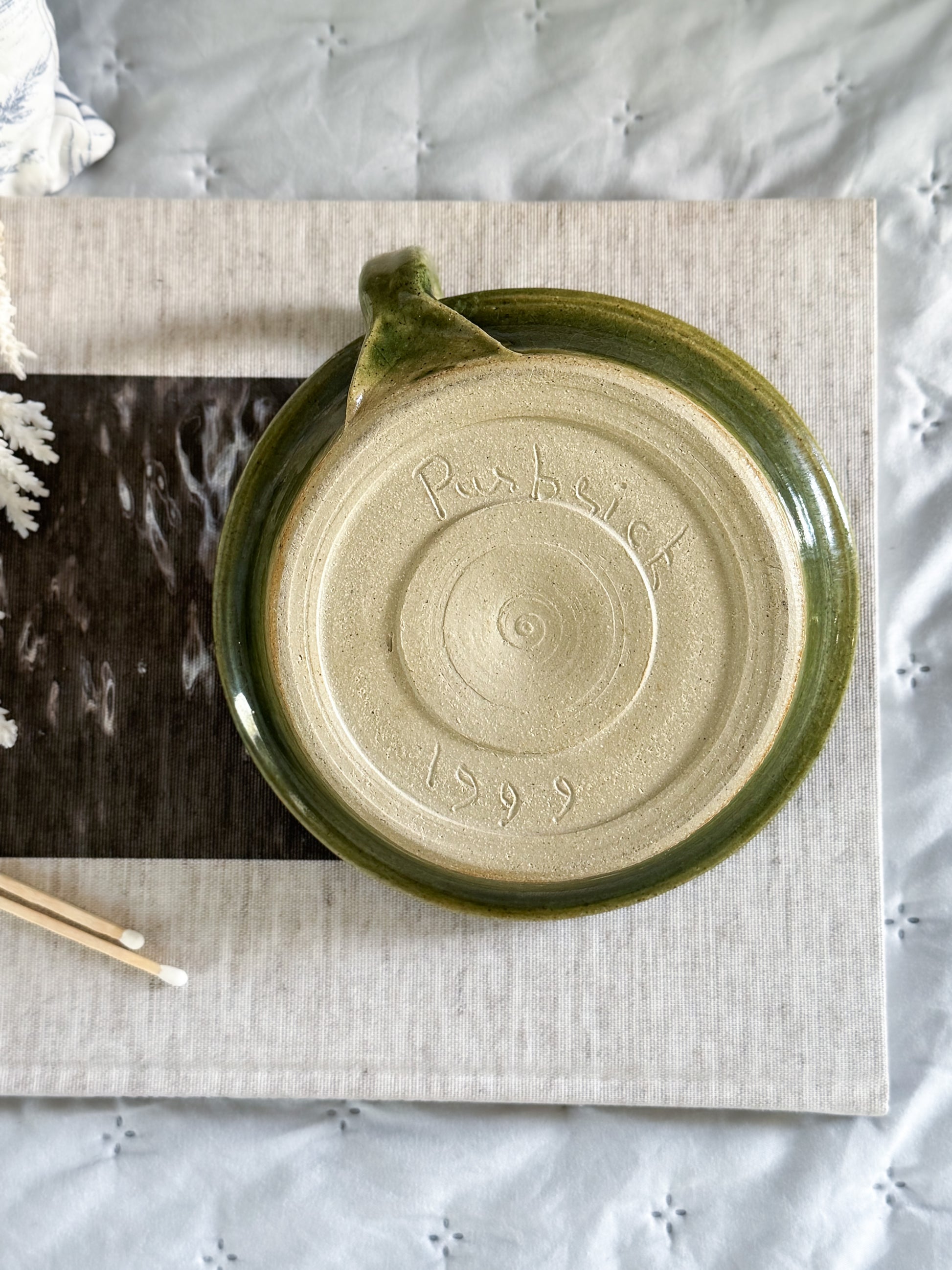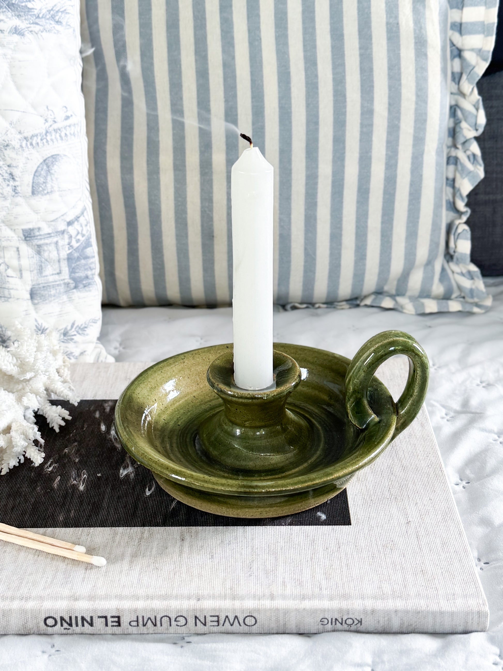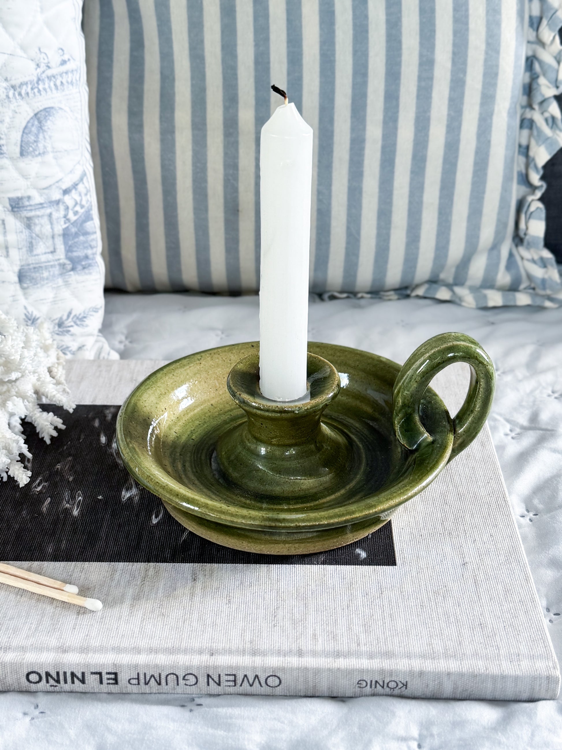 A beautiful and weighty studio pottery chamberstick, hand-thrown and finished in a rich olive green glaze with soft tonal variations that catch the light. Its wide saucer base and generous loop handle are both practical and timeless, recalling candlelit evenings and the quiet rituals of slower living.