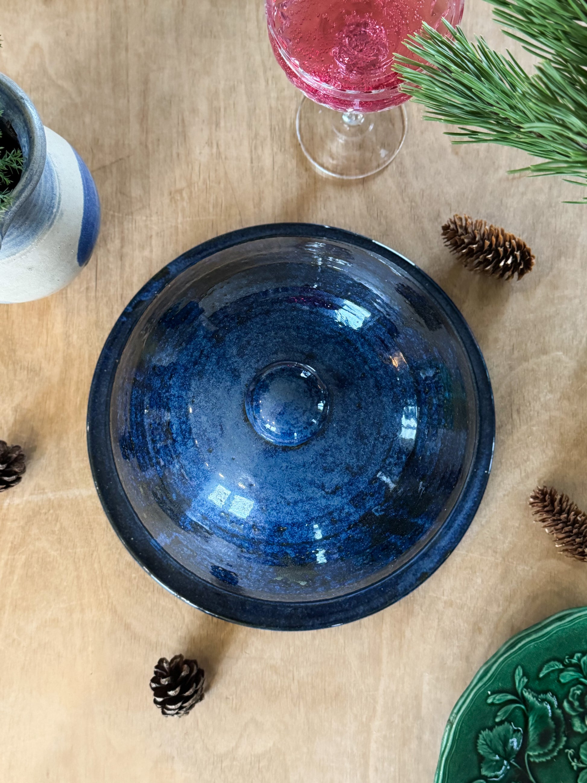 A beautiful and substantial vintage studio pottery cheese cloche, finished in a deep, atmospheric blue glaze with rich variation and movement across the surface. Stamped ‘Healy Pottery Ireland’ on the base. The glaze shifts between inky navy, midnight blue and soft smoky undertones, pooling and speckling in a way that can only come from the kiln.