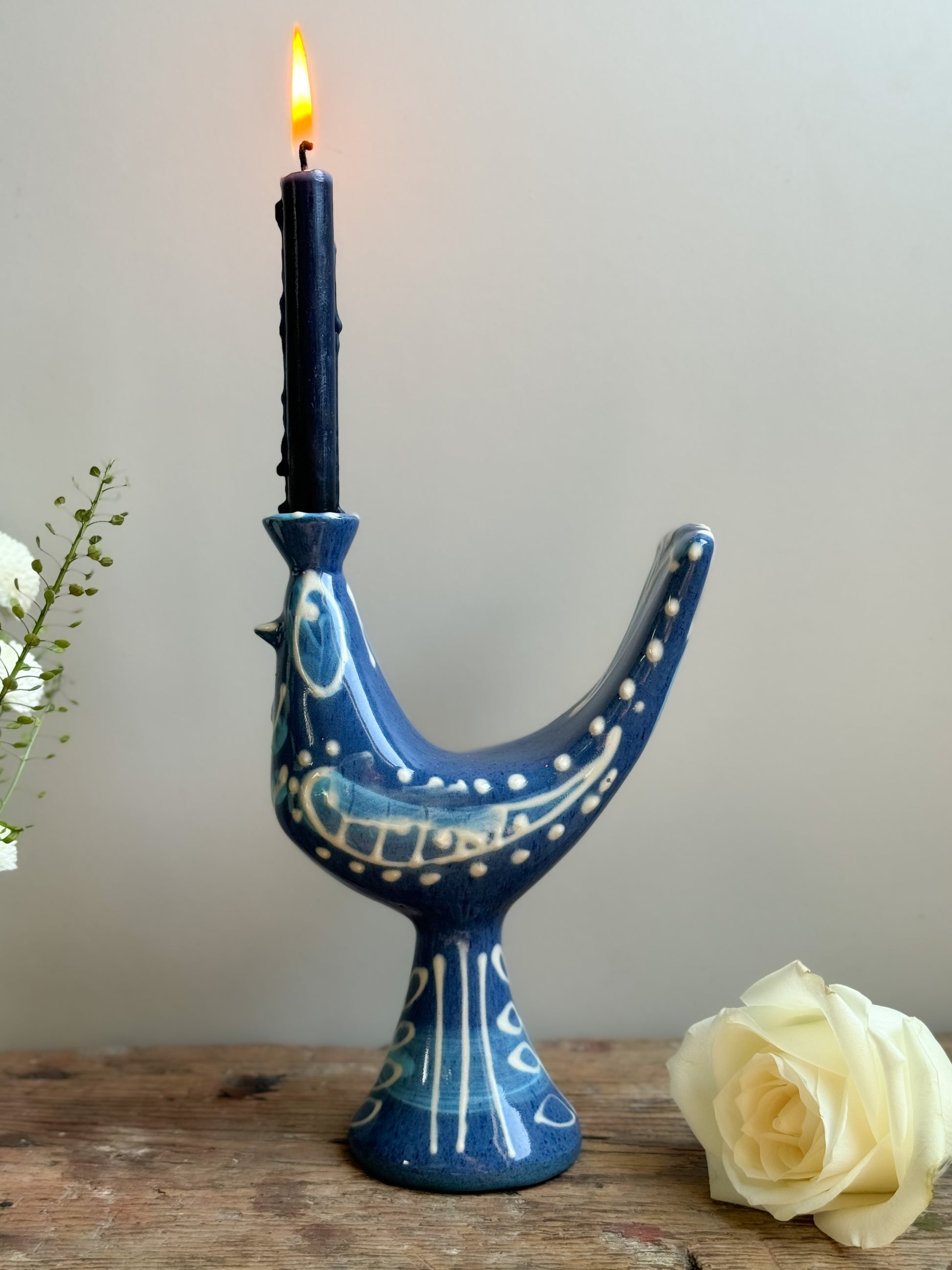 A stunning and rare piece made by Powell & Llangollen pottery circa the 1950s. It has a stunning blue and white slipware glaze and there’s a little hole at the top of the cockerels head allowing it to be used as a candle holder if desired.