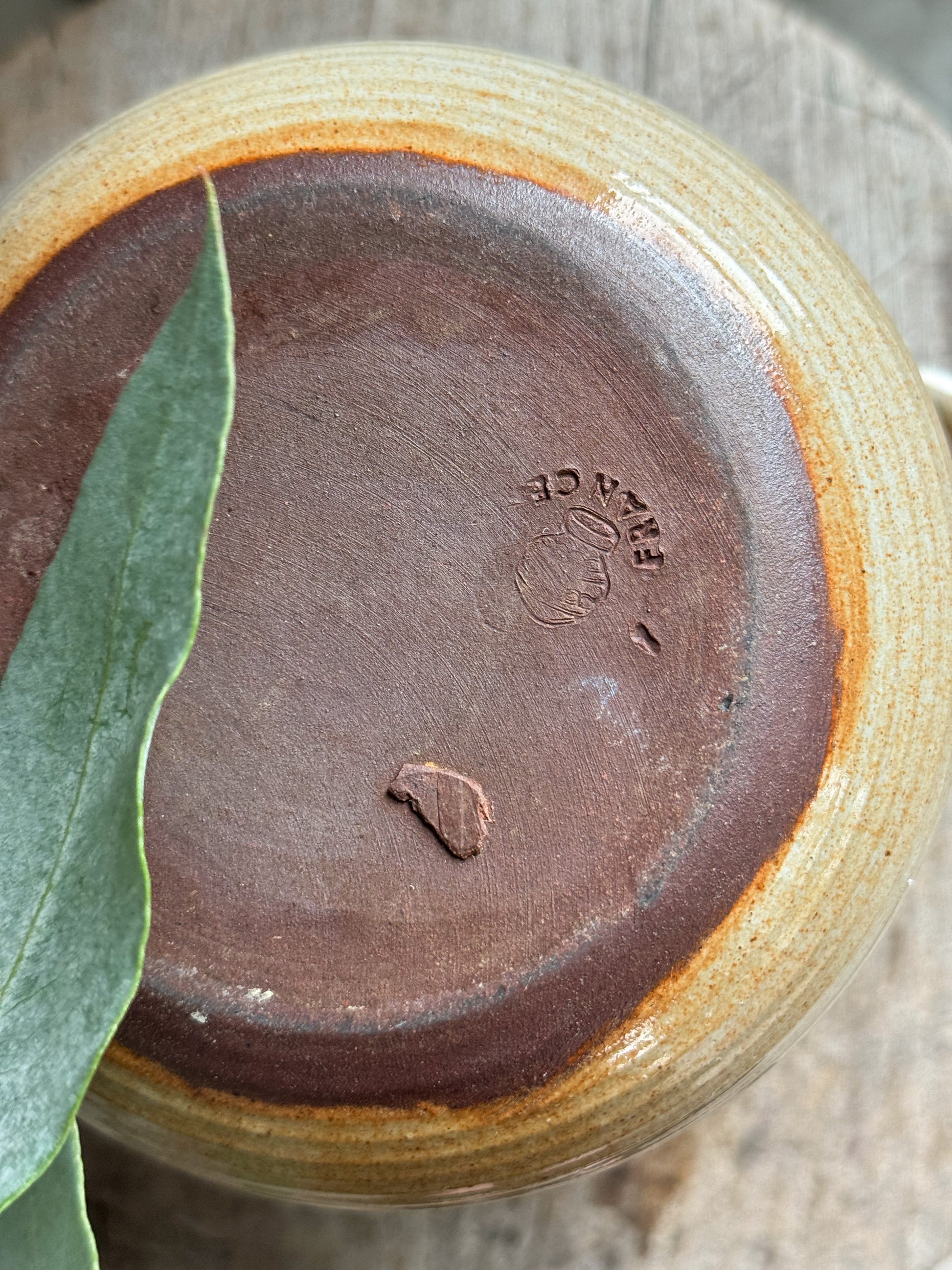 Stamped “France” to the base, it’s a wonderful example of everyday French pottery, functional yet deeply tactile, with subtle turning lines that reveal its handmade nature. Whether hung on a kitchen hook or used as a small vase for herbs and flowers, it brings effortless warmth and charm to any corner of the home.