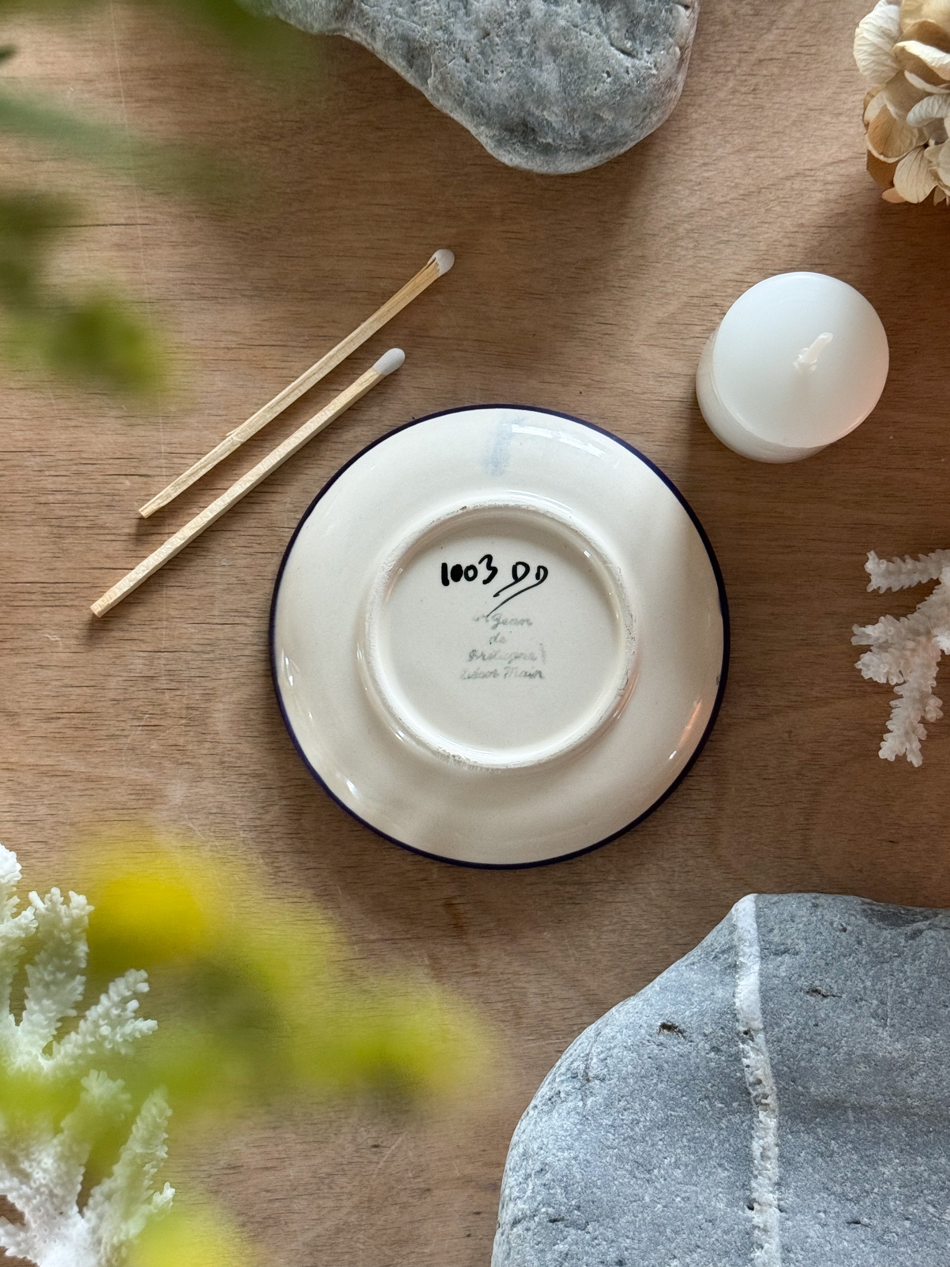 A charming hand-painted French studio pottery dish featuring a deep cobalt floral motif against a soft white glaze. Each brushstroke feels intentional, simple, bold, and timelessly beautiful. The circular form and slightly raised edge make it perfect for holding small treasures, jewellery, or as a candle or soap dish.