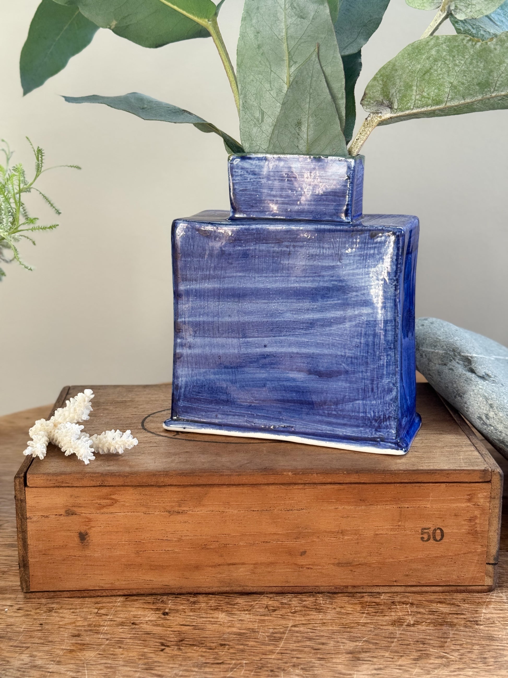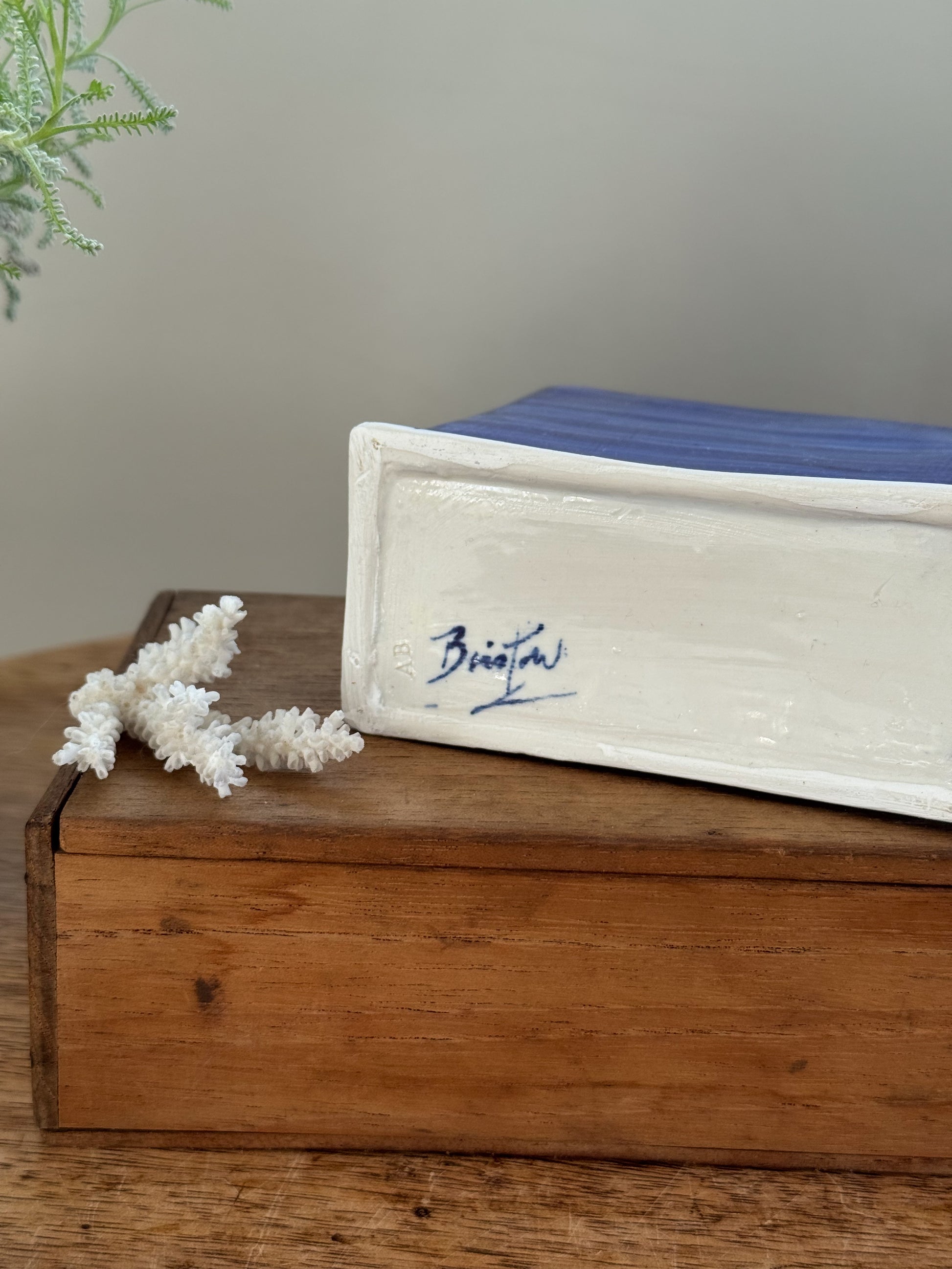 Rendered in a rich cobalt glaze, this piece features a beautifully hand-painted seaside scene depicting figures gazing toward the waves, evoking the warmth and nostalgia of British coastal life. The artwork wraps harmoniously around the squared form, showcasing Bristow’s distinctive painterly touch and craftsmanship.