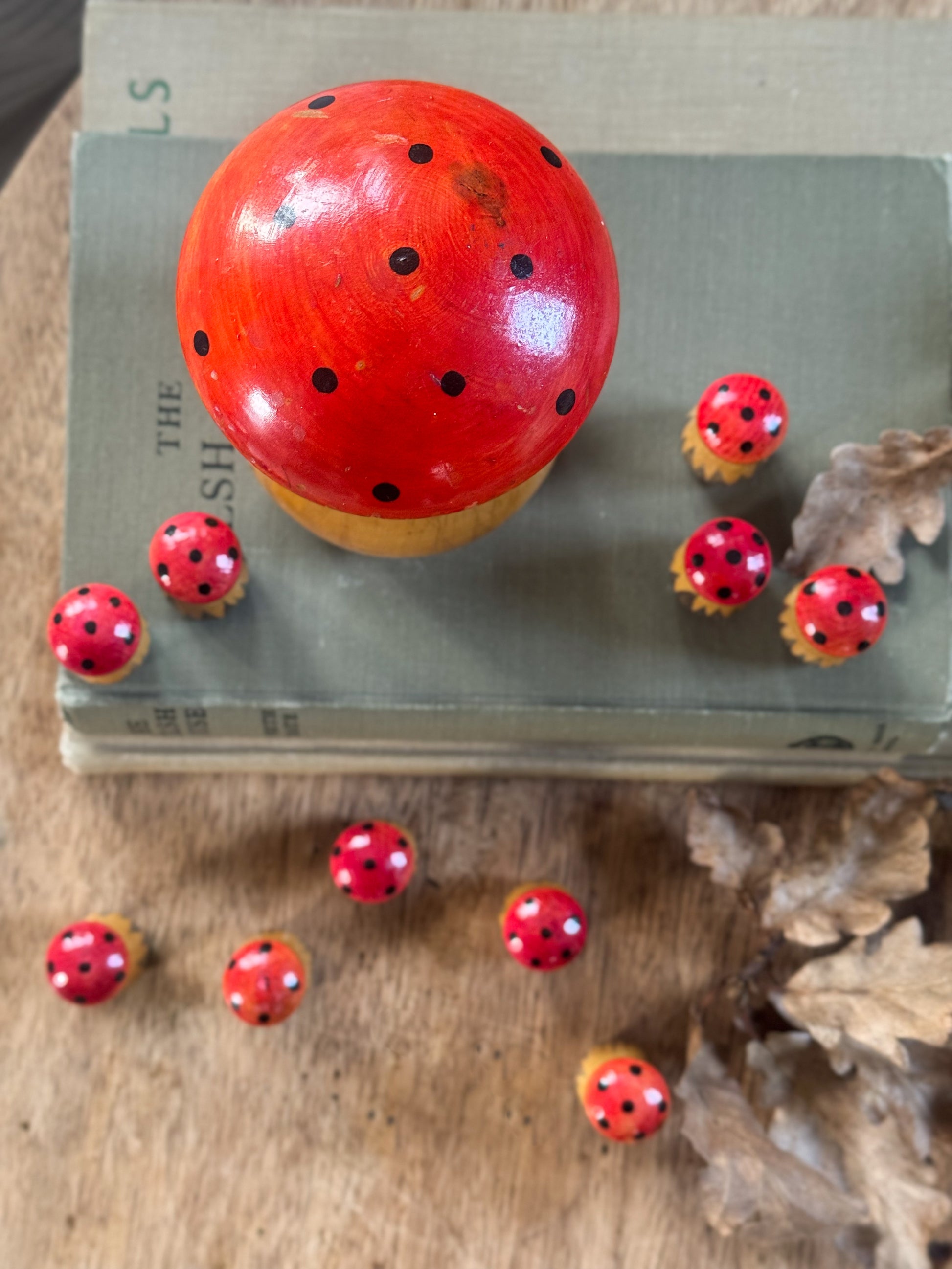 With its vibrant red cap dotted with black spots and warm honey-coloured stem, this piece feels lifted straight from a woodland fairytale. Part folk art, part curiosity, it carries a joyful sense of nostalgia and craftsmanship that is increasingly hard to find. Each smaller mushroom mirrors the form of the larger one, creating a delightful rhythm and moment of surprise as each layer is revealed.
