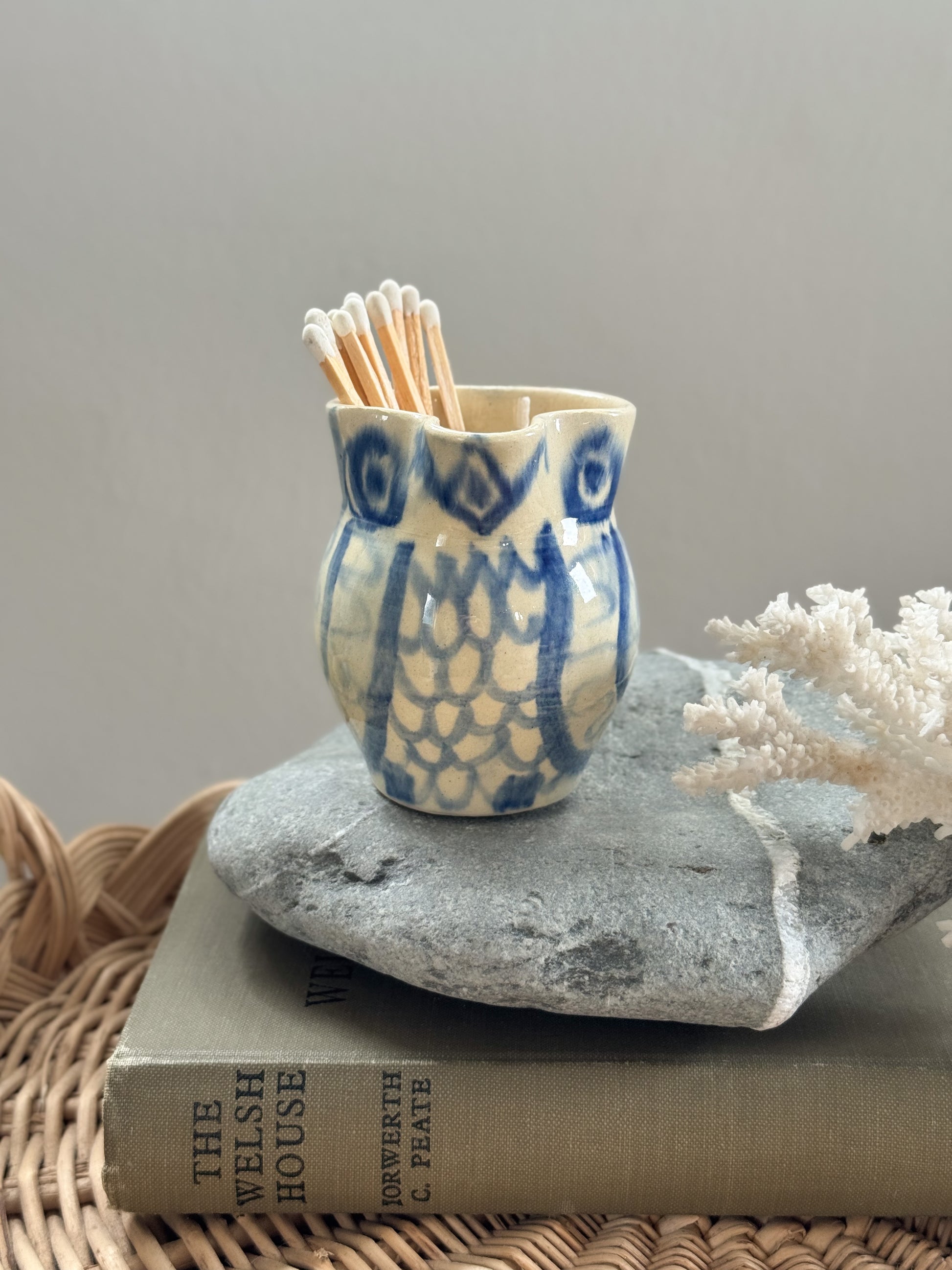 A beautifully hand-thrown and hand-painted owl creamer by Steve Barkworth of Pen y Bonc Pottery, Amlwch, Anglesey. This rare piece of Welsh studio pottery captures the maker’s distinctive style, expressive brushwork in cobalt blue over a soft cream glaze, with a charming owl motif that feels both folk-inspired and modernist in its simplicity.