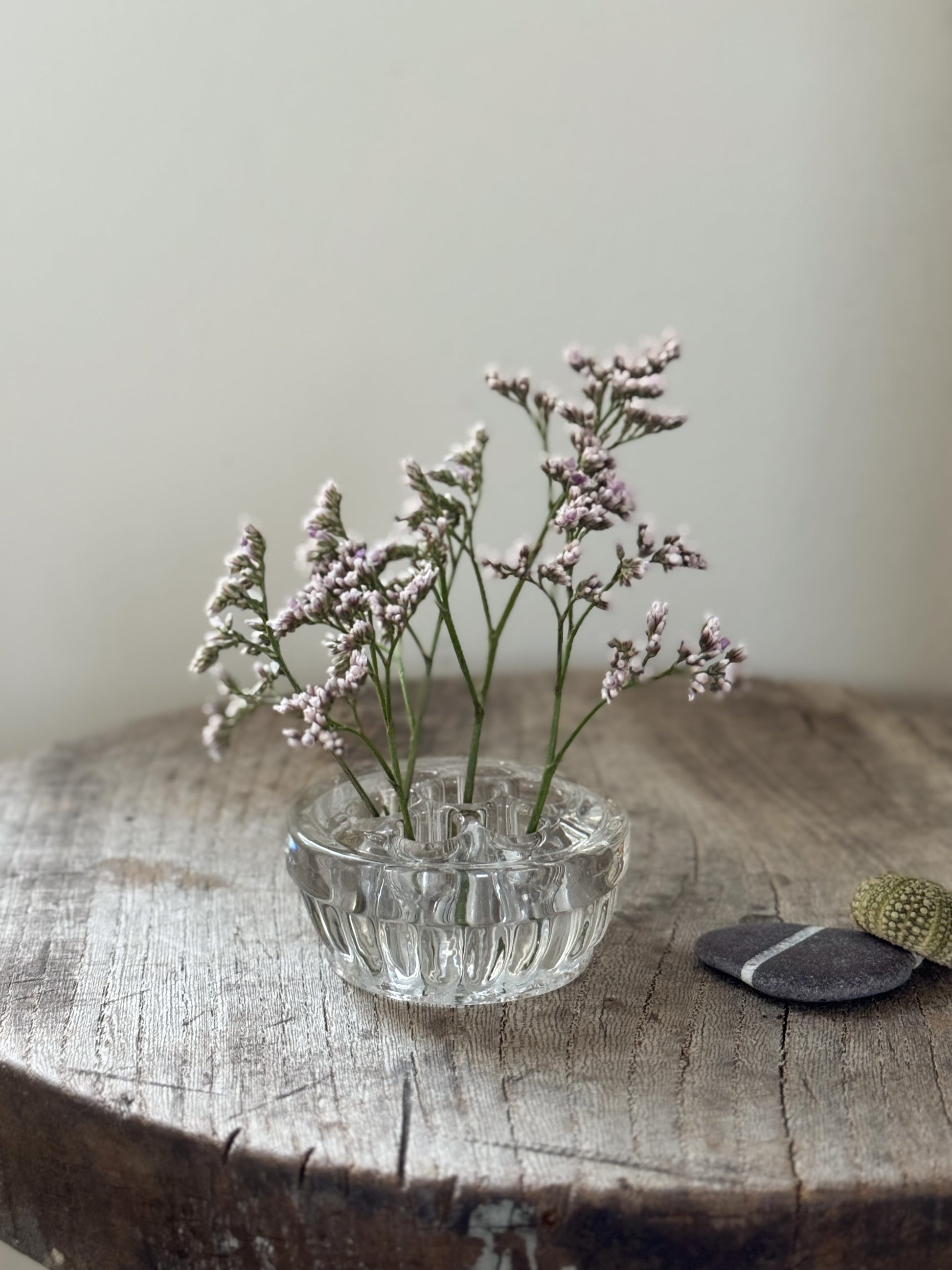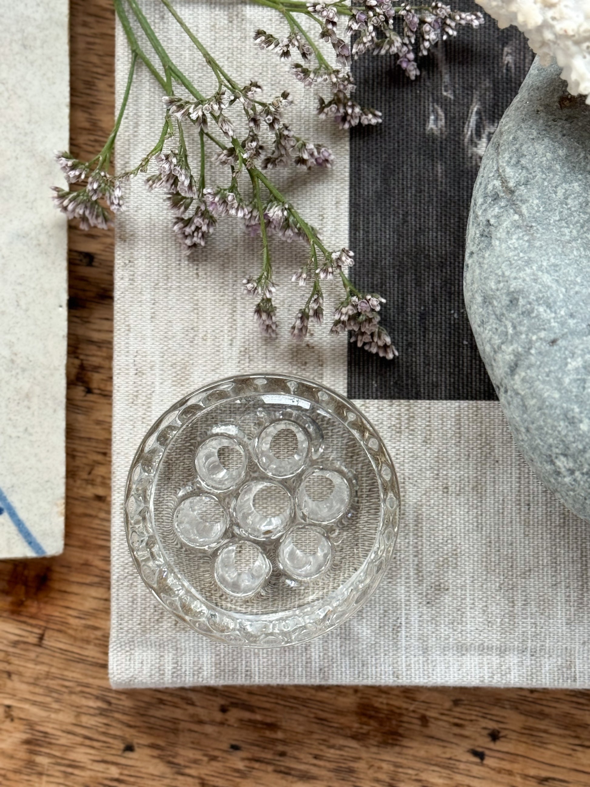 A beautiful miniature handmade glass flower frog dating from the 1930s, with a softly rounded form and six circular openings designed for arranging delicate blooms. Made from clear pressed glass, it reflects light beautifully and carries the gentle weight and clarity typical of early 20th-century glassware.