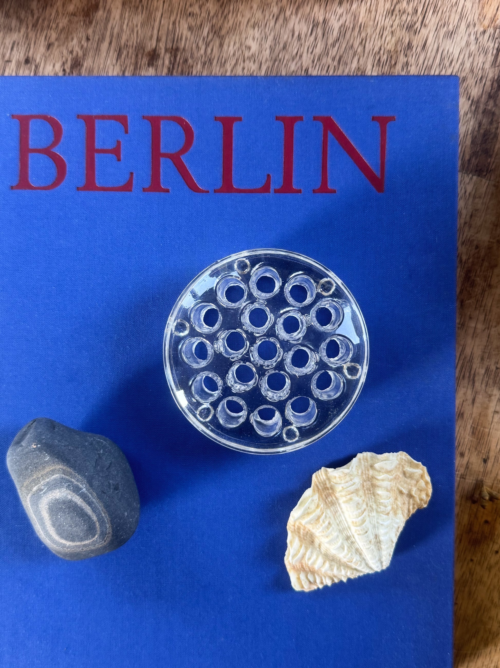 A beautiful handblown glass flower frog dating from the 1930s, with a softly rounded form and 19 circular openings designed for arranging delicate blooms. Made from clear pressed glass, it reflects light beautifully and carries the gentle weight and clarity typical of early 20th-century glassware.