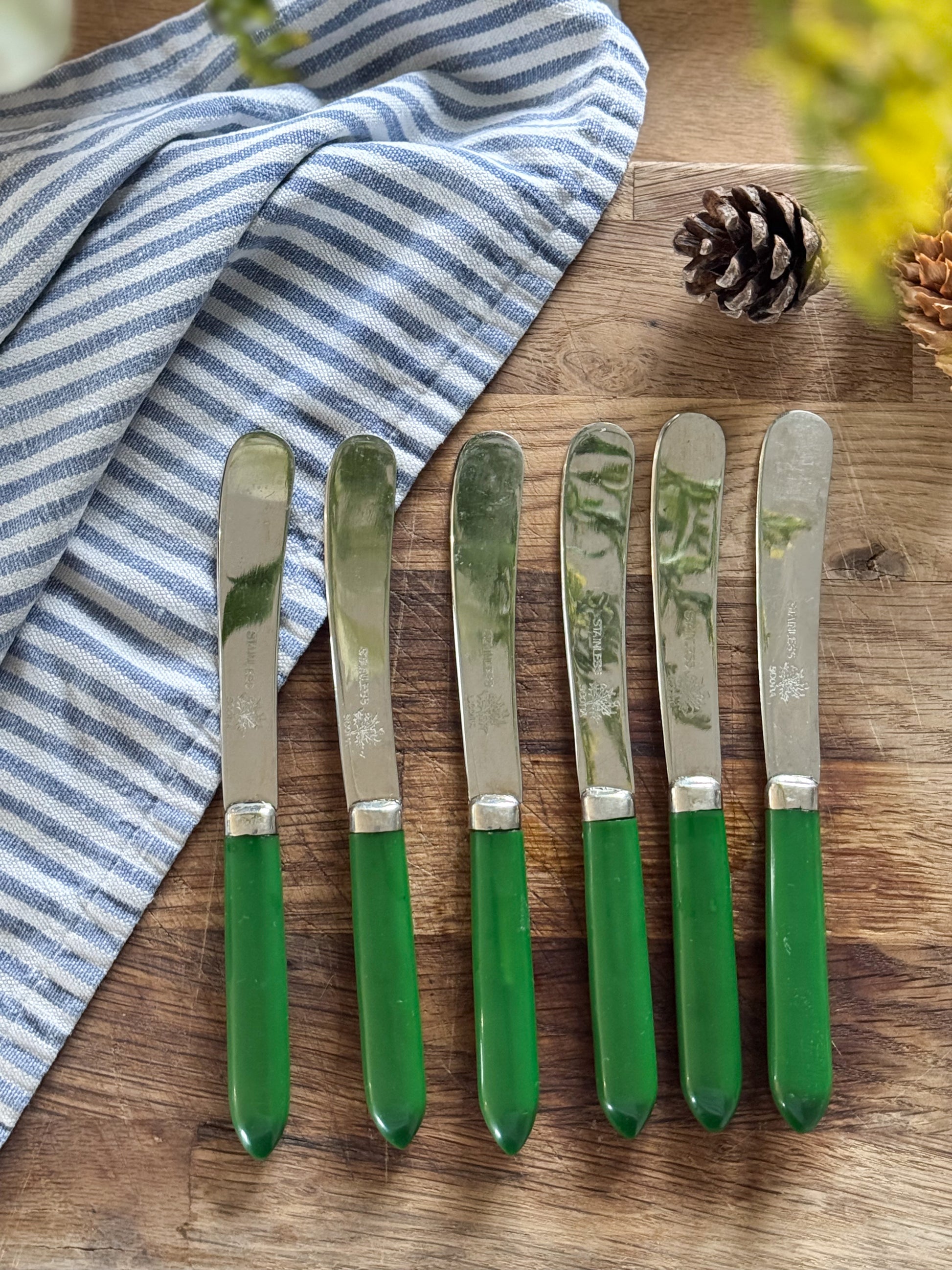 A beautiful set of six vintage butter knives by Scotia, made in England. Each features a stainless steel blade engraved with the Scotia leaf emblem and smooth, glossy green Bakelite handles, a classic mid-century design that feels both cheerful and timeless.