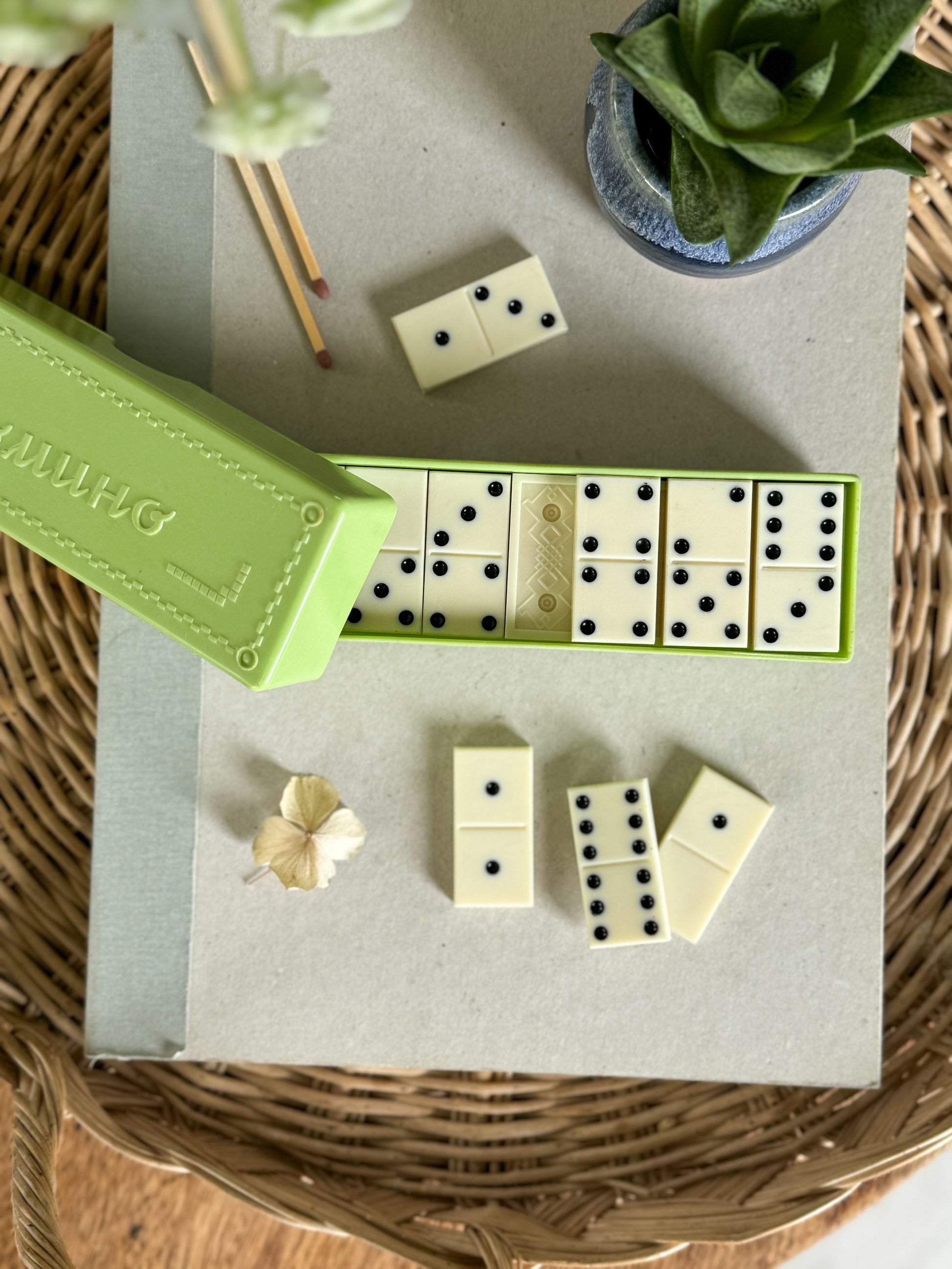 A wonderfully nostalgic set of bakelite dominoes in a green case. All pieces are present and ready to play!