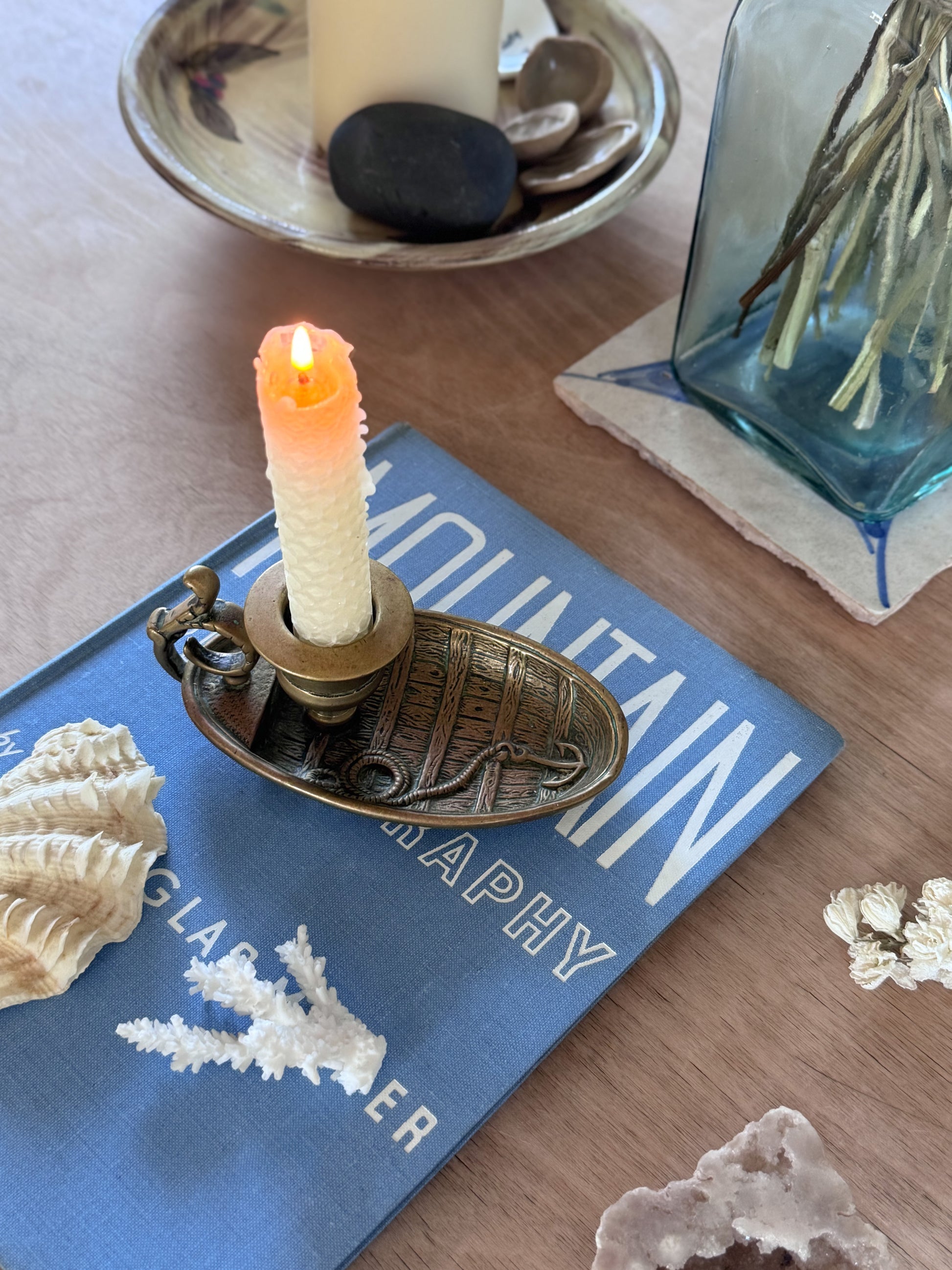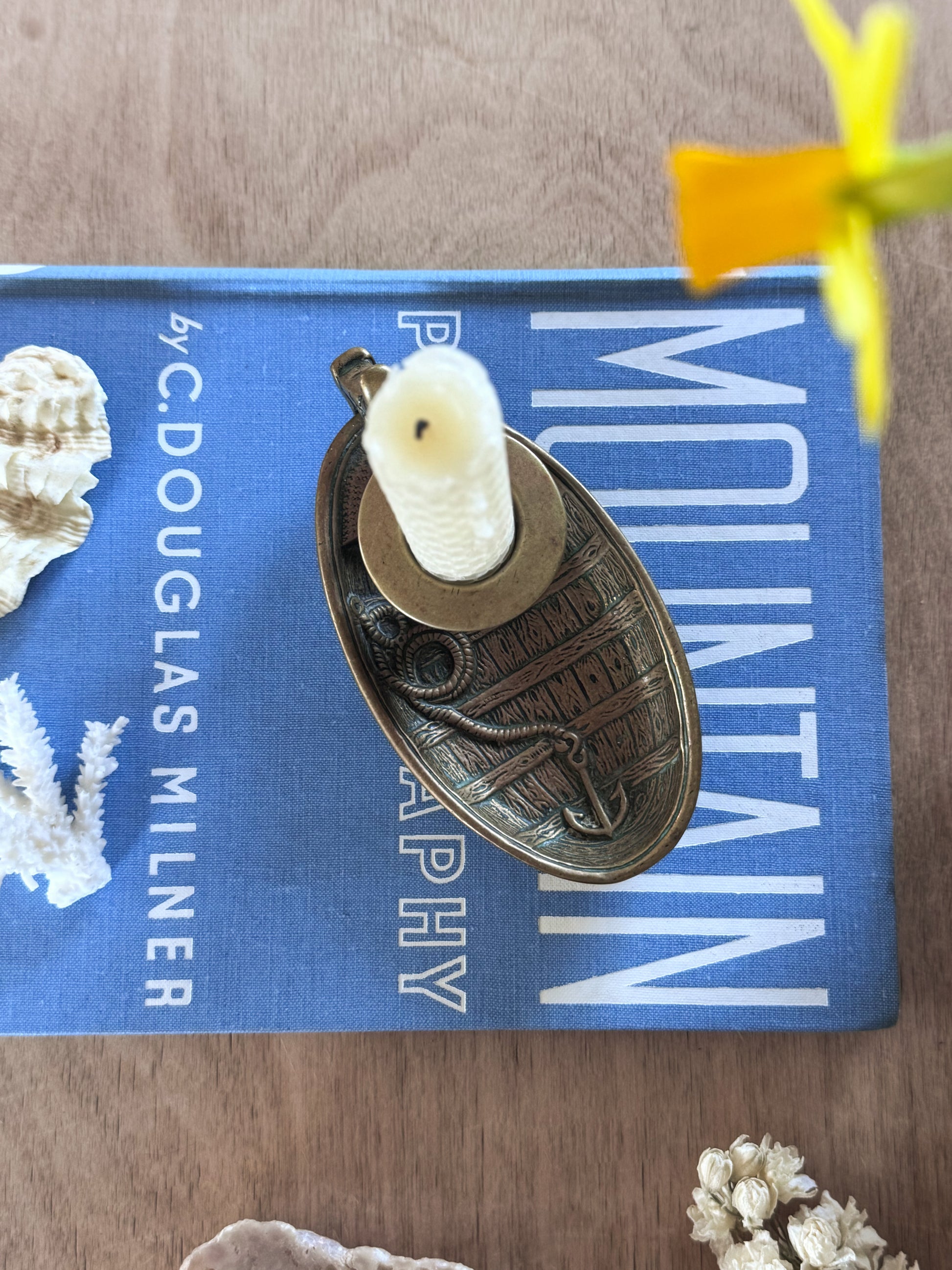 A beautiful handmade solid brass Chamberstick in the shape of a boat with a little etched anchor inside.
