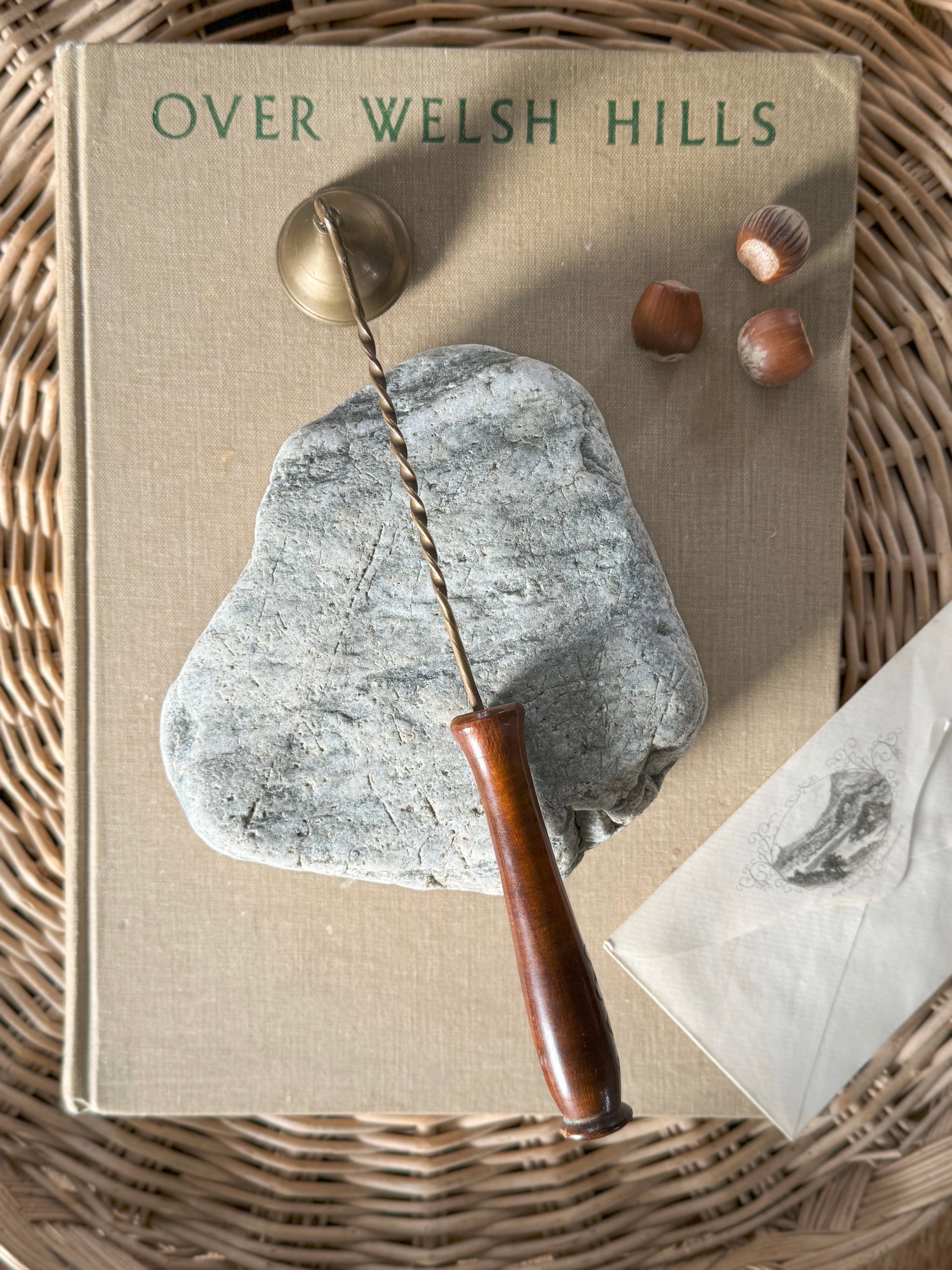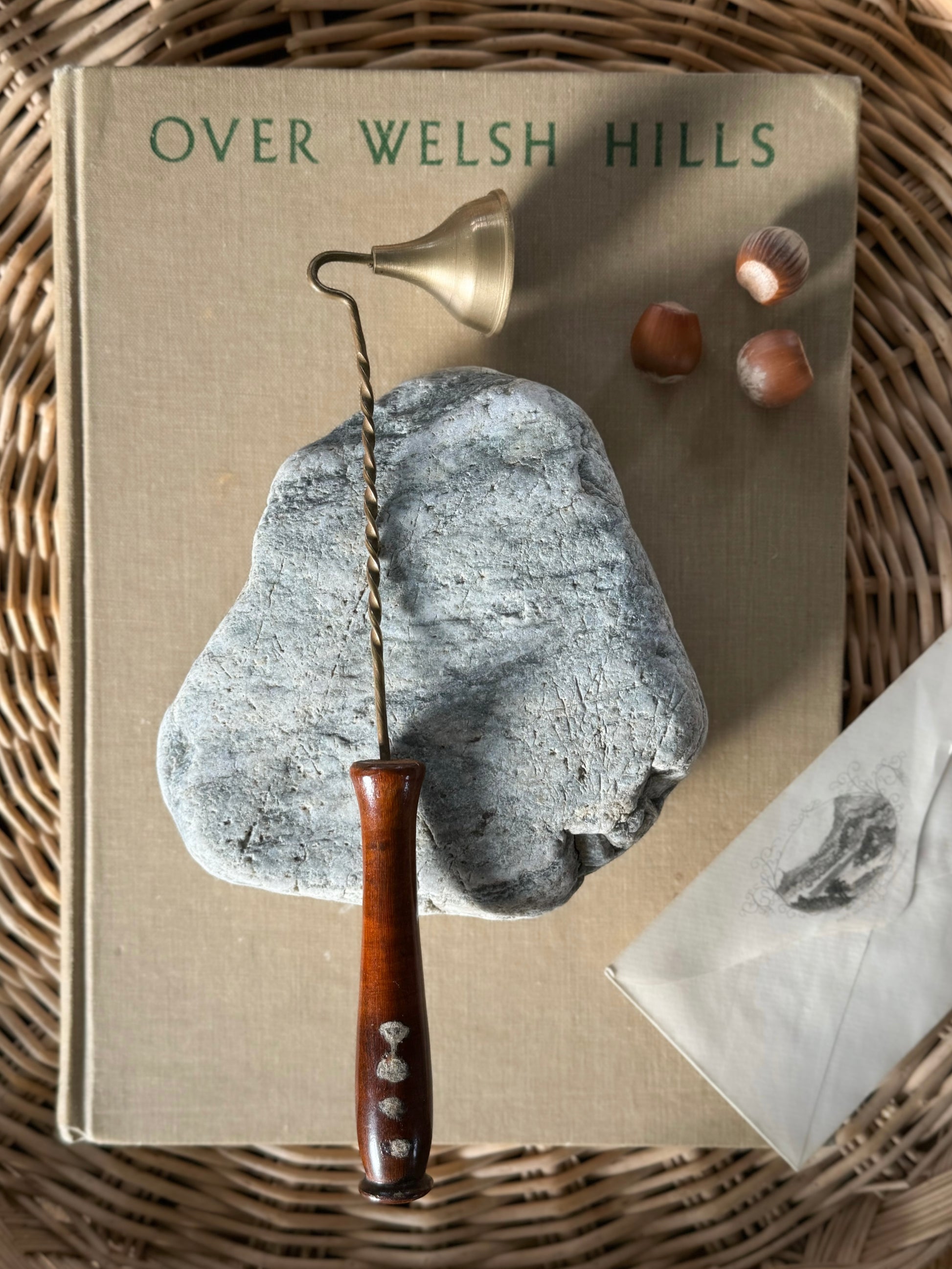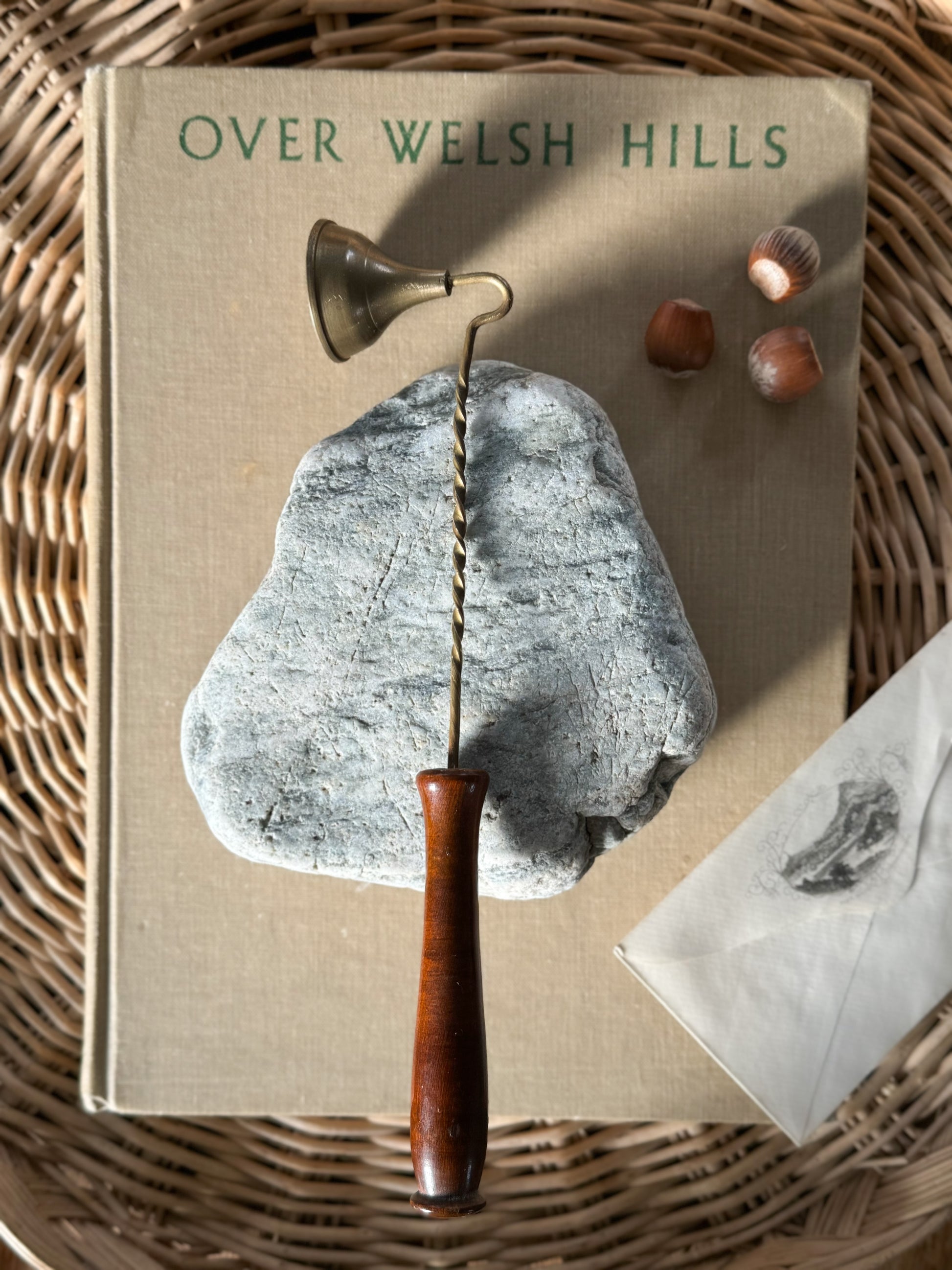 A beautiful brass candle snuffer with a twisted stem and wooden handle.