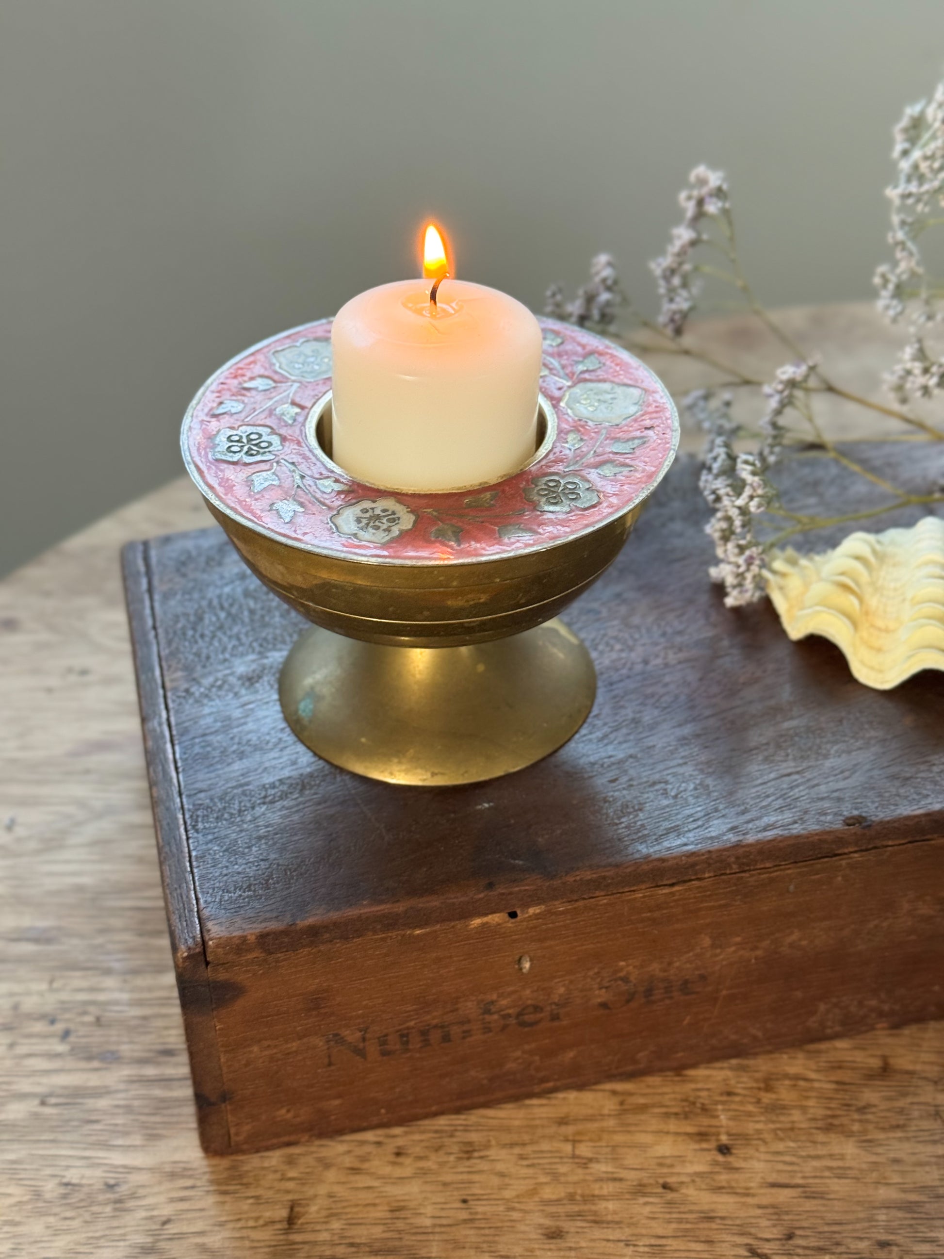 A beautiful vintage brass pedestal candle holder, richly decorated with hand-painted enamel florals in soft red, cream, and silver tones. The combination of warm brass and delicate enamel work gives this piece a wonderfully nostalgic charm, decorative, tactile, and full of character.
