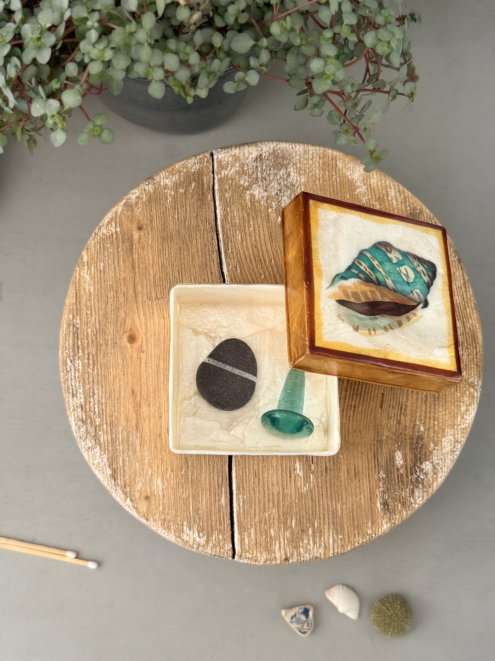 A beautiful square vintage box made from luminous Capiz shell, featuring a hand-painted sea shell on the lid in rich shades of turquoise, sand, and deep brown, sealed under a glossy lacquer for a softly gleaming finish. The natural variations of the Capiz catch the light beautifully, giving this piece a subtle, oceanic glow.