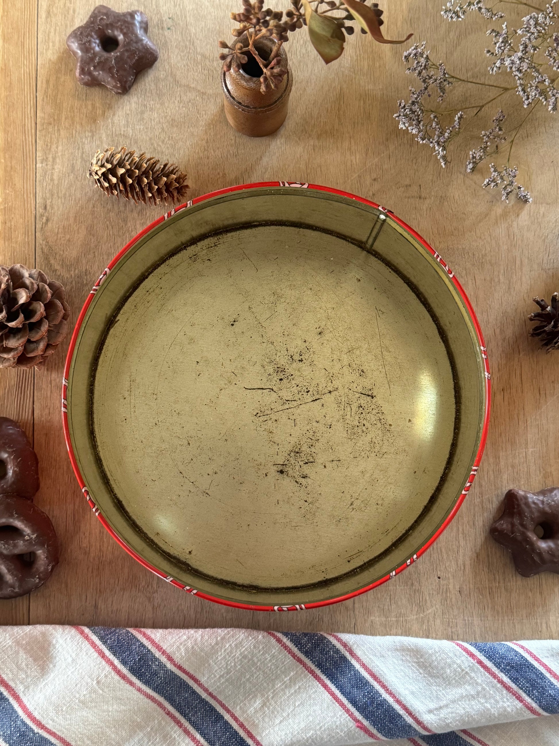Inside, the metal has the usual age-related marks, but the tin is still completely functional and full of life. Styled on an open shelf, stacked with other tins, or used daily for bakes, it adds such a playful countryside touch to the home.